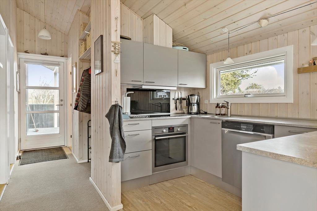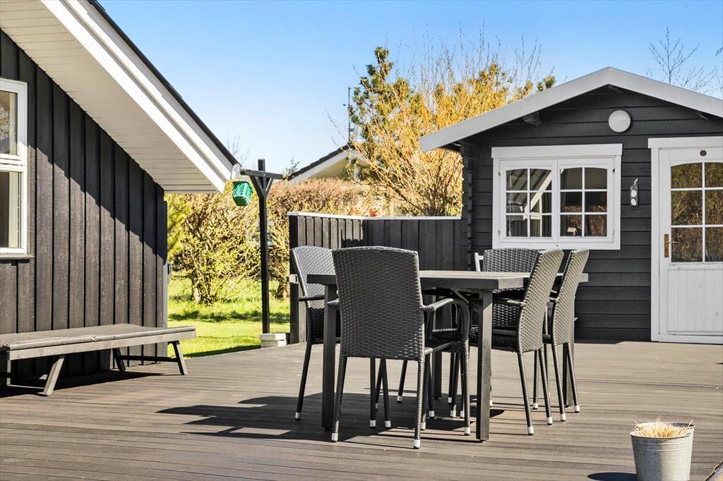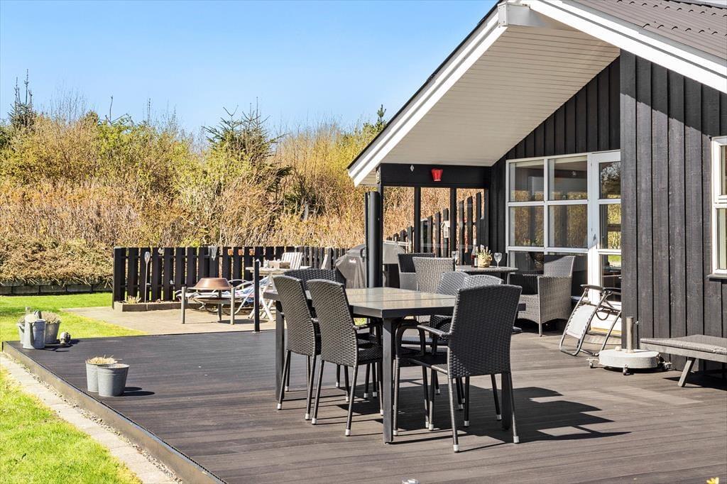 Udendørs inviterer en dejlig have med græsplæne til både boldspil og afslappede stunder under åben himmel. Den delvist overdækkede terrasse giver dig mulighed for at nyde livet ude – uanset vejret. Start dagen med morgenkaffe og fuglefløjt, og slut den af med grillmad og solnedgang. Haven er et skønt sted at være hele dagen, uanset om du vil læse i skyggen, lege med børnene eller lade hunden nyde friheden i de trygge omgivelser. Der er både solrige og skyggefulde kroge, så du altid kan finde et sted, der passer til stemningen og temperaturen. Det er et perfekt sted at finde ro og nyde den særlige stemning, som sommerhuslivet i Tversted er kendt for.