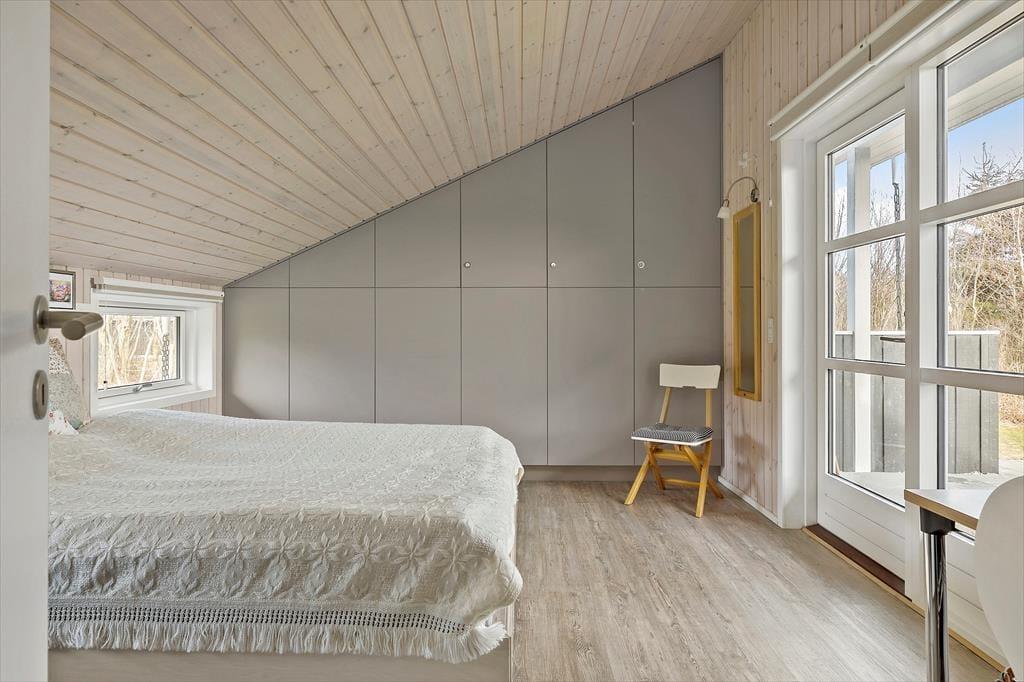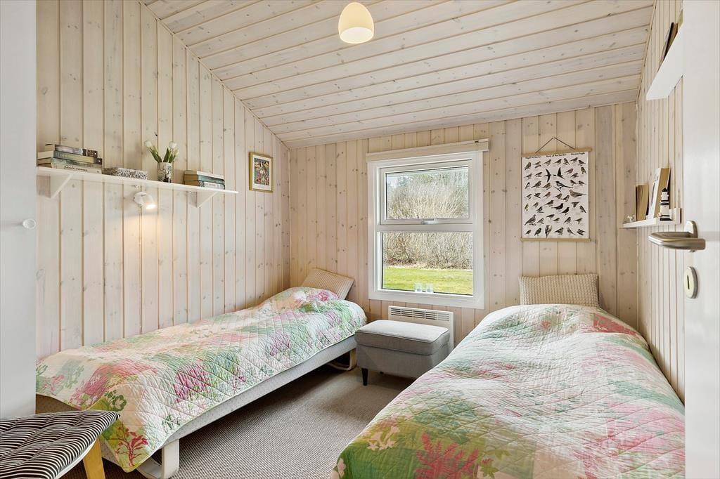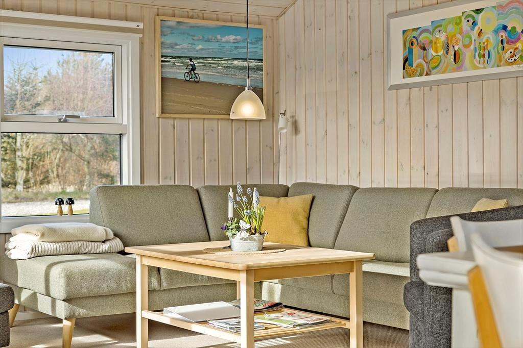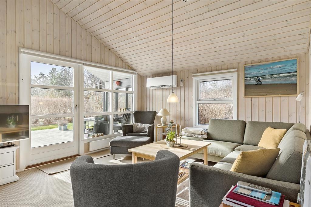 Når du træder ind i sommerhuset, bliver du mødt af et lyst og venligt rum med masser af naturligt lysindfald. Stuen har en skøn atmosfære med god plads til at slænge sig i sofaen, tage en stille stund med en bog eller samles omkring bordet til kortspil og samtaler. Det åbne rumforløb skaber god kontakt mellem stue og køkken, så du hele tiden er tæt på dem, du holder ferie med. En brændeovn og varmepumpe sørger for, at indeklimaet er behageligt året rundt – også hvis vejret en dag indbyder til indendørs hygge. Der er gode sovepladser i huset, og i det hyggelige anneks er der plads til to personer, som gerne vil have lidt ekstra ro og privatliv – ideelt til teenagere, bedsteforældre eller et vennepar.