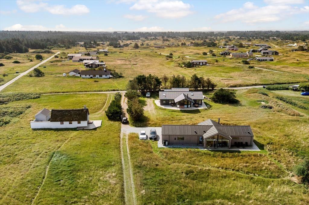 Da sommerhuset blev opført i 2023, blev der naturligvis taget hensyn til det omkringliggende landskab. Derfor er køkkenet og spisebordet placeret mod nord, så I kan kigge lige ud på klitterne og havet, når I hygger jer med madlavningen eller deler et lækkert måltid sammen. Vinduespartiet går fra gulv til loft, så omgivelserne virkelig inviteres indenfor, og i det åbne stueområdet med brændeovn, sofaarrangement og stort fladskærms-tv er lysindfaldet tilsvarende skønt. En anden rar detalje ved huset er, at de tre soveværelser og to badeværelser er opdelt i to afsnit, så der er rig mulighed for at få ro og privatliv, når det er sovetid. Alle tre soveværelser er med dobbeltseng, og det ene badeværelse er med vaskesøjle, mens det andet byder på et flot badekar.