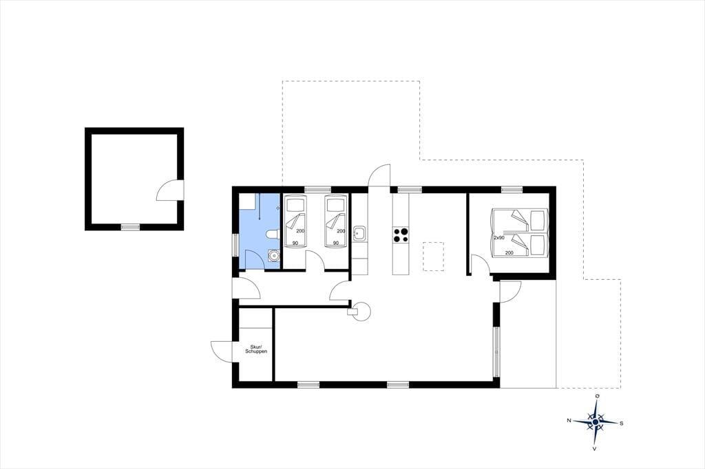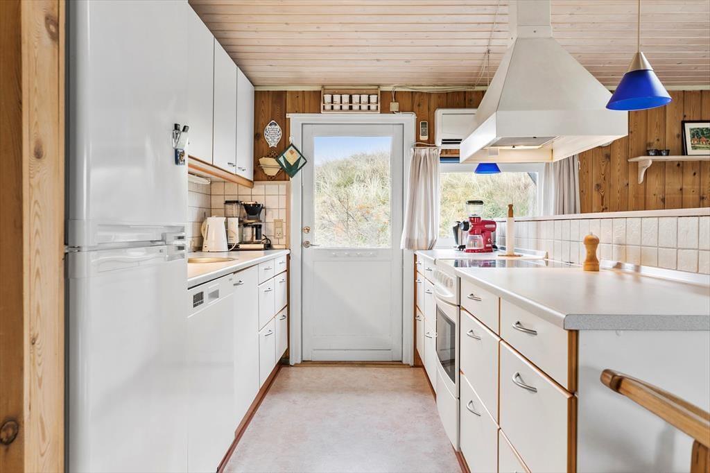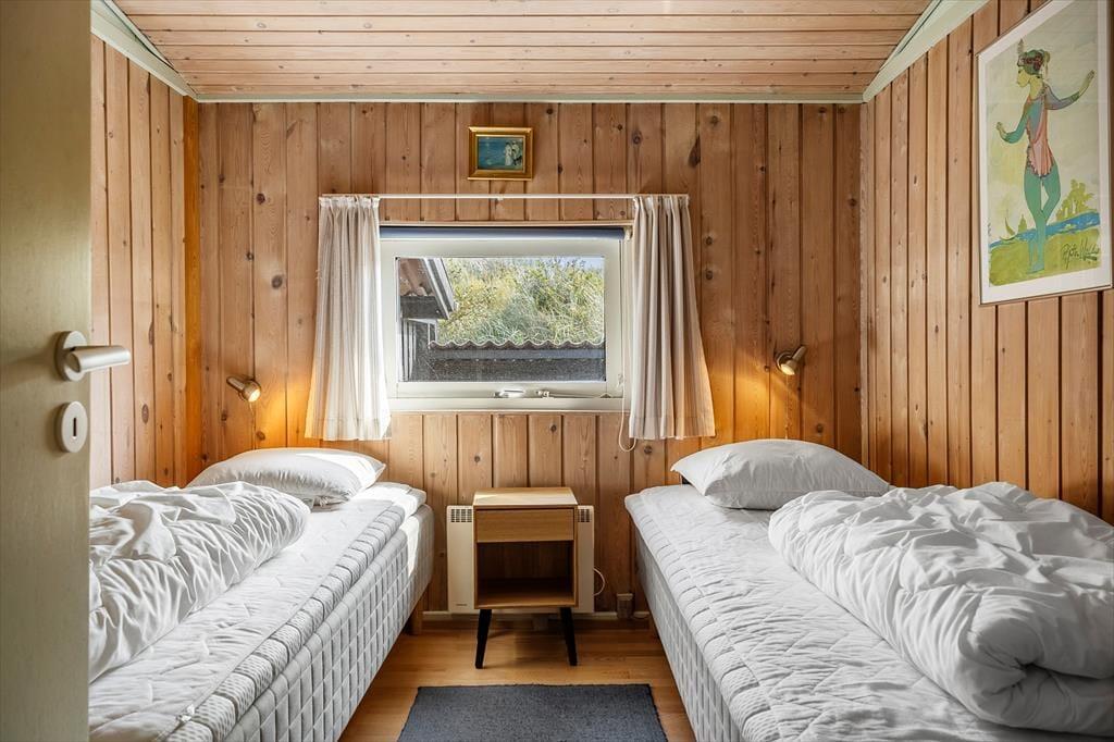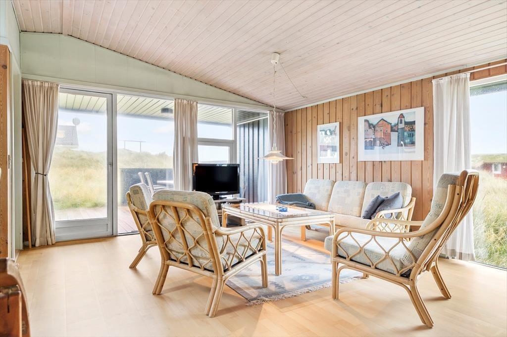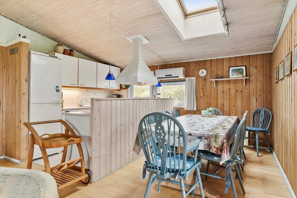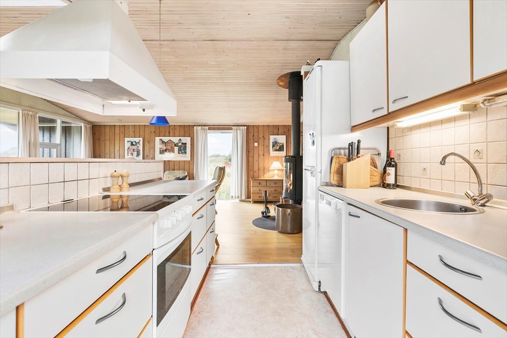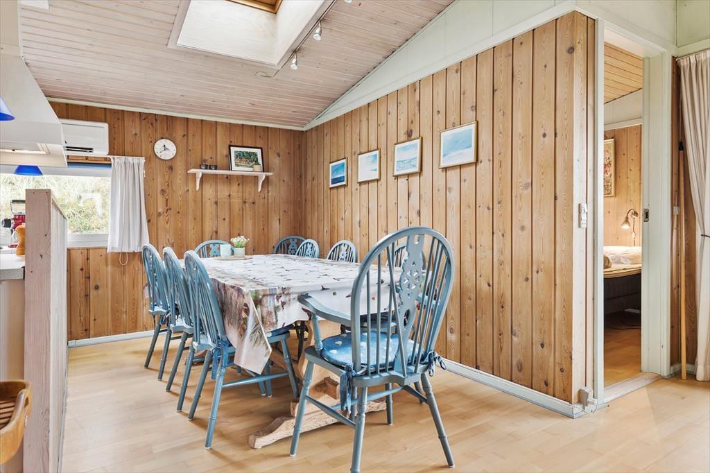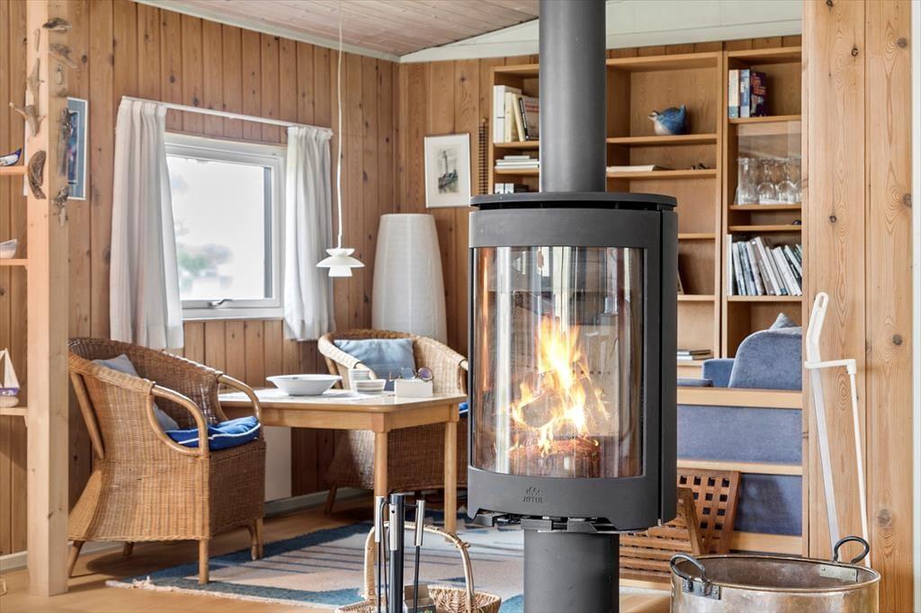 Indenfor mødes du af en lys og hyggelig indretning, hvor stuen og køkkenet ligger i åben forbindelse, så du nemt kan være en del af fællesskabet, mens du laver mad. Brændeovnen står klar til at sprede varme og hyggestemning på kølige dage, mens store vinduer inviterer naturen helt ind i rummet. Indretningen er enkel og indbydende, og her er plads til, at du kan slappe af med en god bog, nyde en kop kaffe eller samle familien til brætspil ved spisebordet. Når mørket falder på, kan du høre vinden suse i klitterne udenfor og glæde dig over roen, der omgiver dig.