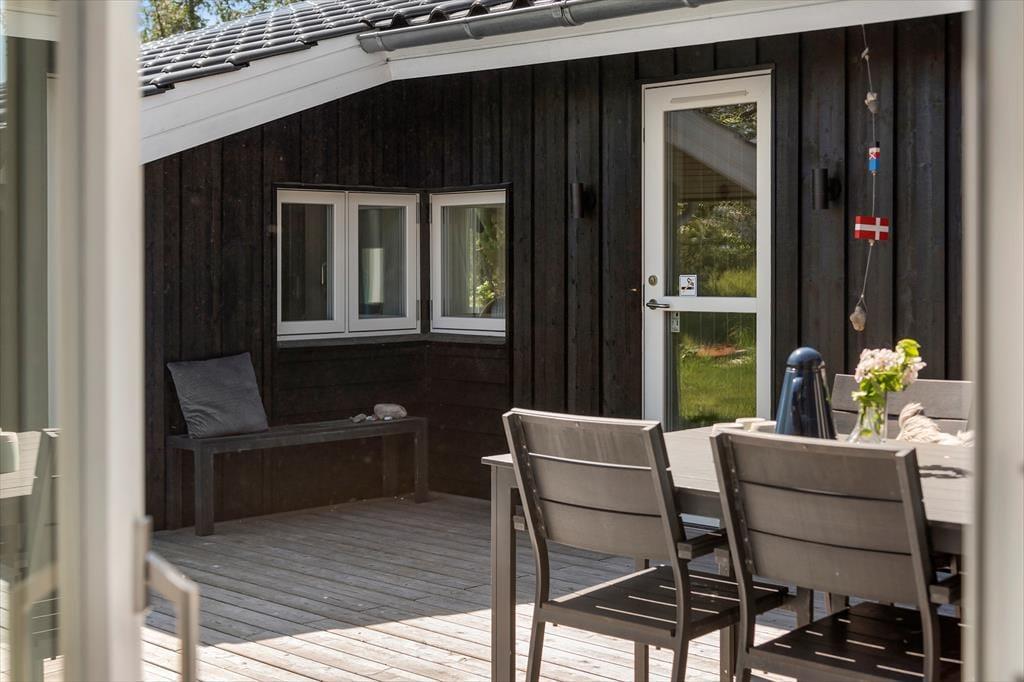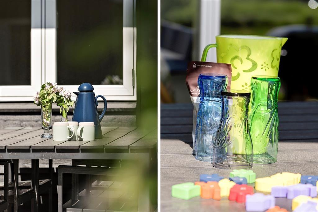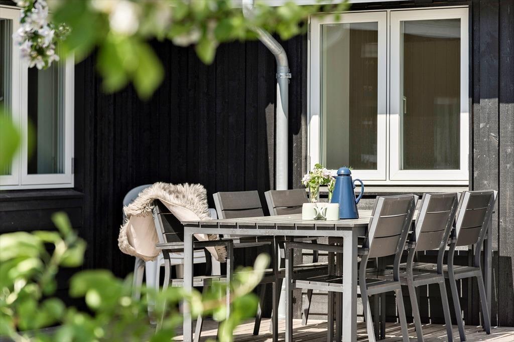 På de lune sommerdage er det oplagt at flytte både måltider og driverliv ud i det fri. Der er terrasser mod både øst, vest og syd, så mulighederne for at nyde solen dagen lang er gode. Udover havemøbler og liggestole er der en grill til rådighed, så madlavningen kan fint foregå under åben himmel. Trænger familiens yngste til at bevæge sig, kan de tumle i haven, hvor der både er trampolin og små fodboldmål. Grunden er på 1260 m2, så der er god plads til at udfolde sig under åben himmel – eller bare nyde de grønne, fredfyldte omgivelser i ro og mag på en af husets terrasser.