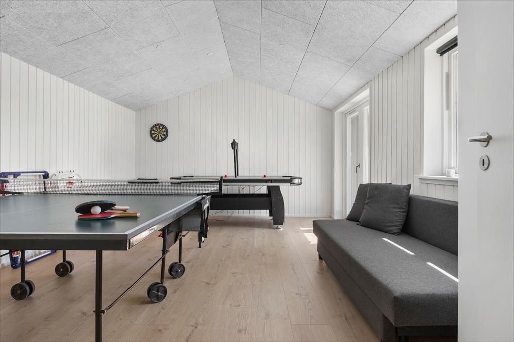 Der er god plads og masser af atmosfære i dette feriehus på Klitrosevej 21. Huset fra 1976 er blevet renoveret på vellykket vis, så du får både moderne komfort og klassisk sommerhuscharme. Det naturlige hjerte i huset er den dejlige stue, der er integreret med et moderne og veludstyret køkken. Her er skønt at være, uanset om den står på madlavning, brætspil ved spisebordet eller hygge i sofaafdelingen med en god film på fladskærmen. Husets aktivitetsrum tilbyder ekstra underholdning for både små og store legebørn – her finder du nemlig bordtennisbord, dartskive og airhockey. Der er desuden sauna og spabad i huset, så du har garanti for ekstra velvære på ferien.