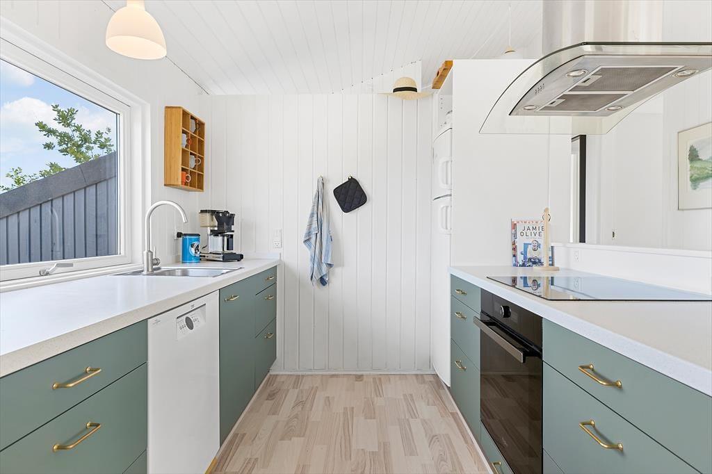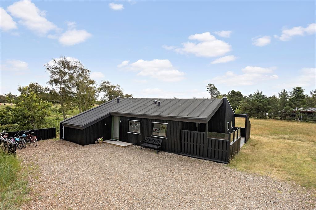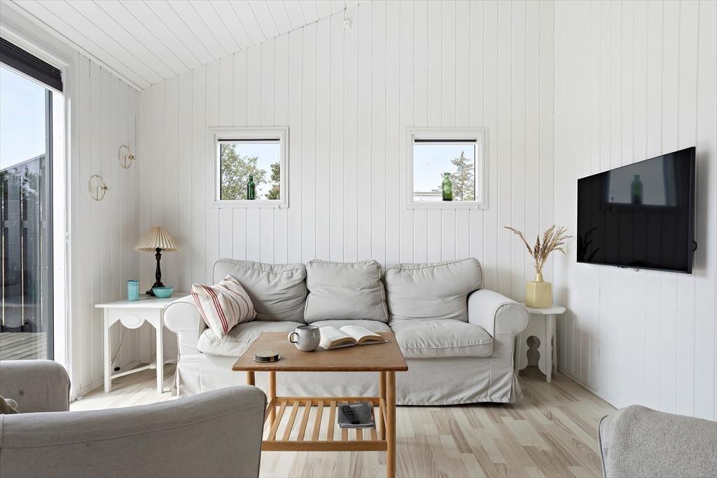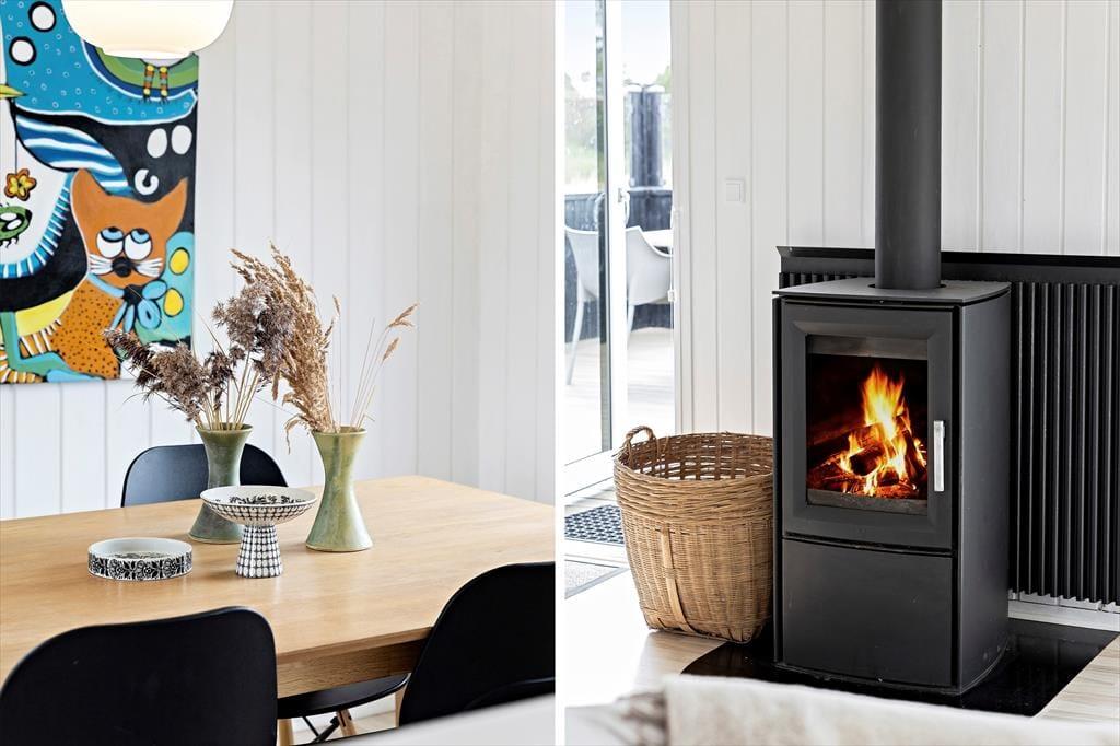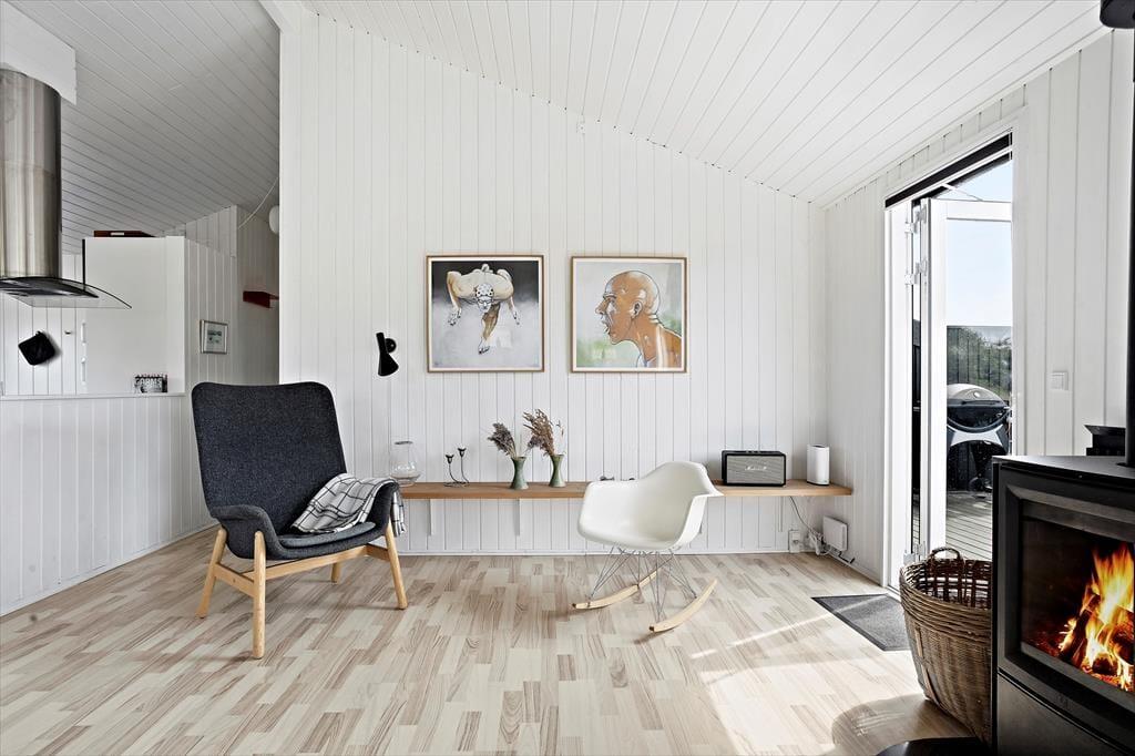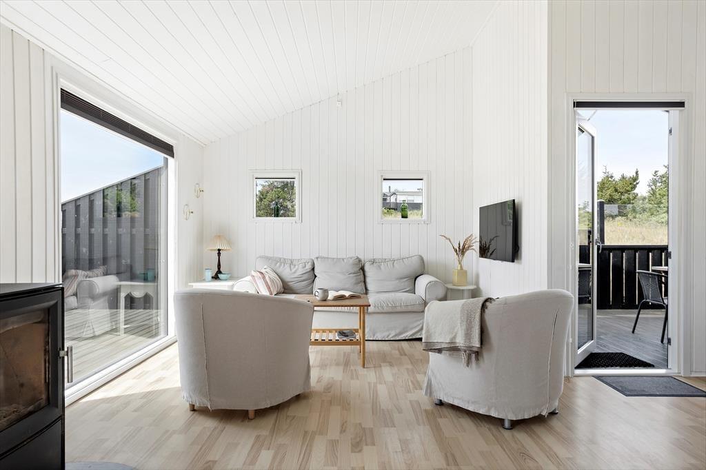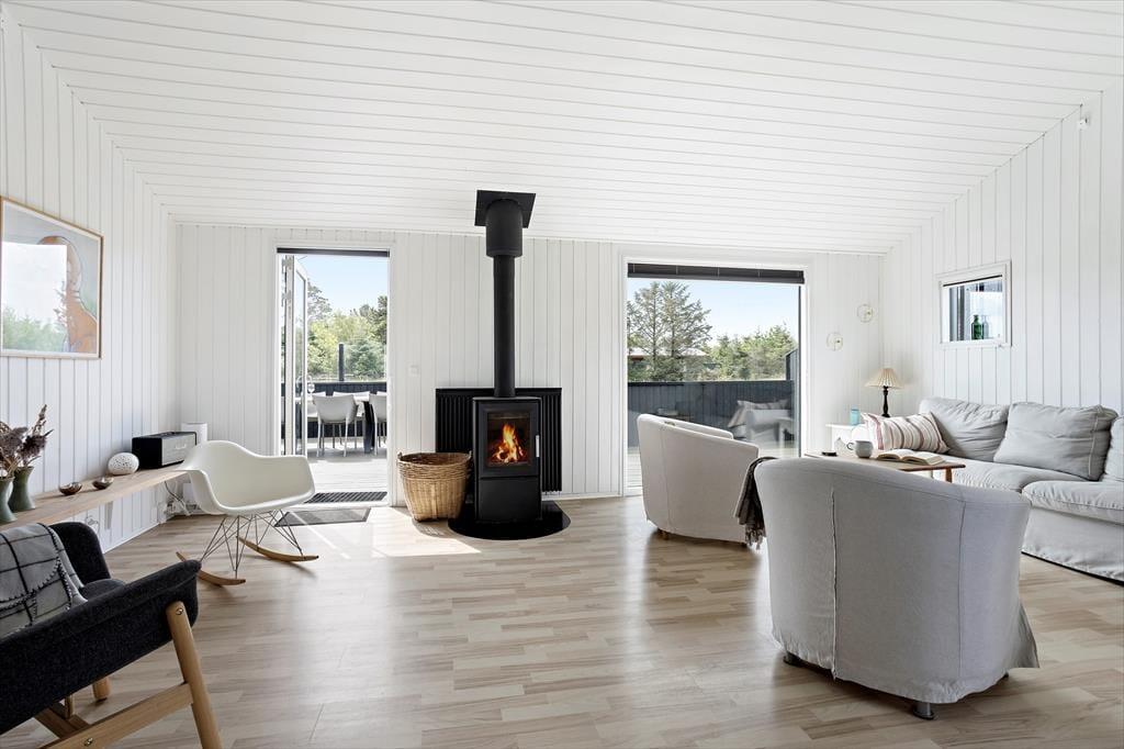 Inde bag sommerhusets mørke facade fremstår alle rum lette og luftige. Ikke bare væggene og de skrå lofter, men også en stor del af interiøret er holdt i lyse farvetoner, og både vinduer og havedøre sørger for, at solen inviteres indenfor fra morgen til aften. Når det er sengetid – eller når du trænger til en pause på langs med en spændende bog – kan du trække dig tilbage på et af sommerhusets tre gode soveværelser. De fleste af døgnets vågne timer kommer nok ellers til at udspille sig i stuen, der er udstyret med en brændeovn og har åben forbindelse til et veludstyret tosidet køkken.