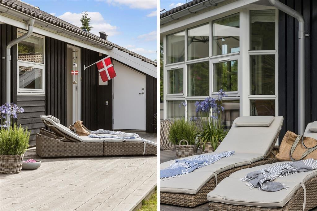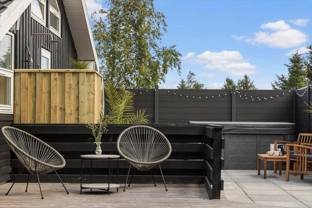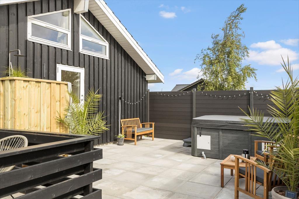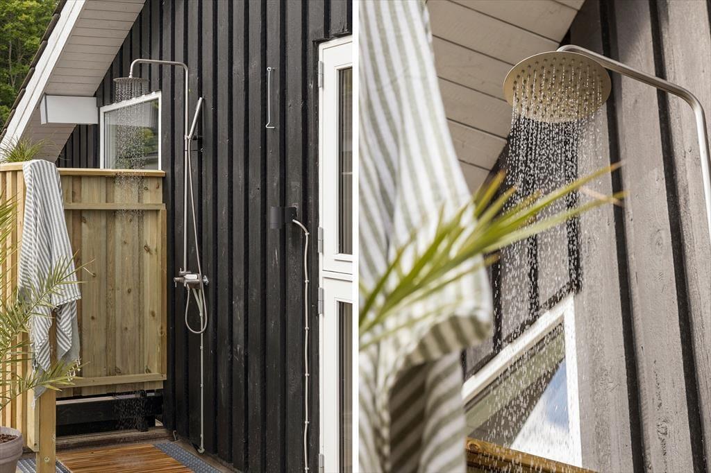 Ude i det fri får I de bedste forudsætninger for at nyde det gode vejr. Hvis du vil have en frisk start på morgenen, kan du skylle dig under udebruseren til lyden af fuglesang og med tanke på den duftende kop kaffe, du om lidt kan indtage på terrassen. Rundt om sommerhuset venter der flere dejlige terrasseområder – inklusiv en delvist overdækkede siddeplads mod vest og en godt afskærmet østterrasse med udespa. Græsplænen er pæn og velholdt, og der er carport til bilen, og endelig kan hunden få sin helt egen oase i form af en indhegnet gård, hvor den kan snuse rundt eller ligge i skyggen af træerne.