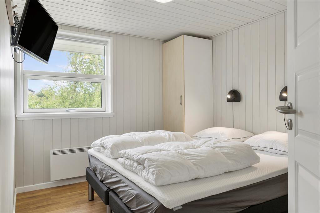 Atmosfæren er lys og let inden døre i sommerhuset, der måler 109 m2 og har en glimrende planløsning til seks personer. De tre soveværelser er alle udstyret med komfortable dobbeltsenge, og foruden et rummeligt badeværelse byder huset også på et pænt gæstetoilet. Du og familien kommer nu sikkert til at tilbringe flest af døgnets vågne timer i stuen, for det er et skønt opholdsrum med store vinduer, loft til kip og et integreret køkken med alt det nødvendige, når der skal kokkereres. Spisebordet er et hyggeligt sted at mødes til brætspil, gode samtaler og lækre måltider, og i sofaafdelingen har du både fladskærms-tv’et og brændeovnen lige i nærheden, så her kan I rigtigt hygge igennem med filmaftener og andre tilbagelænede stunder.