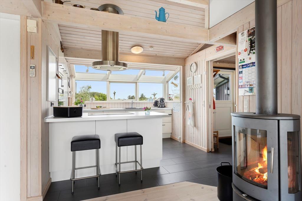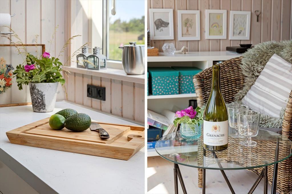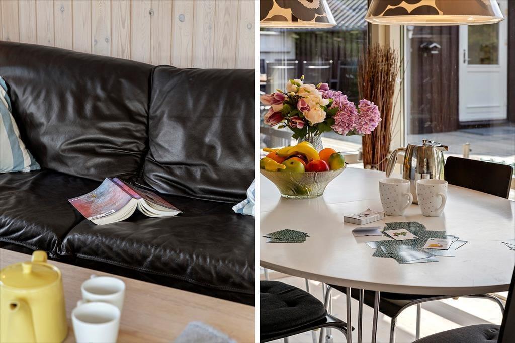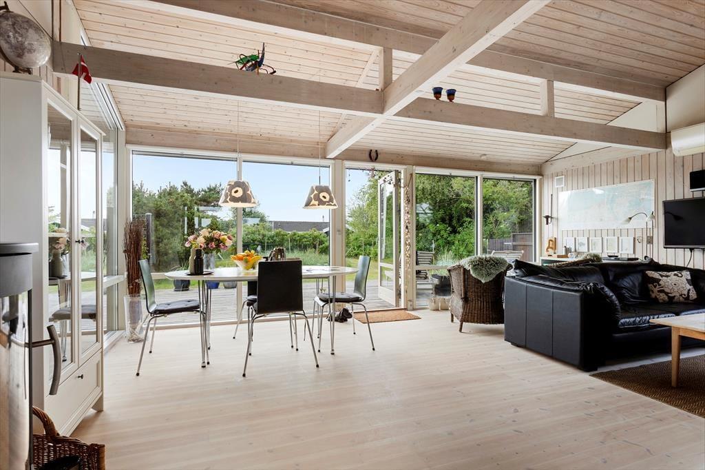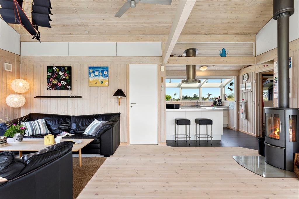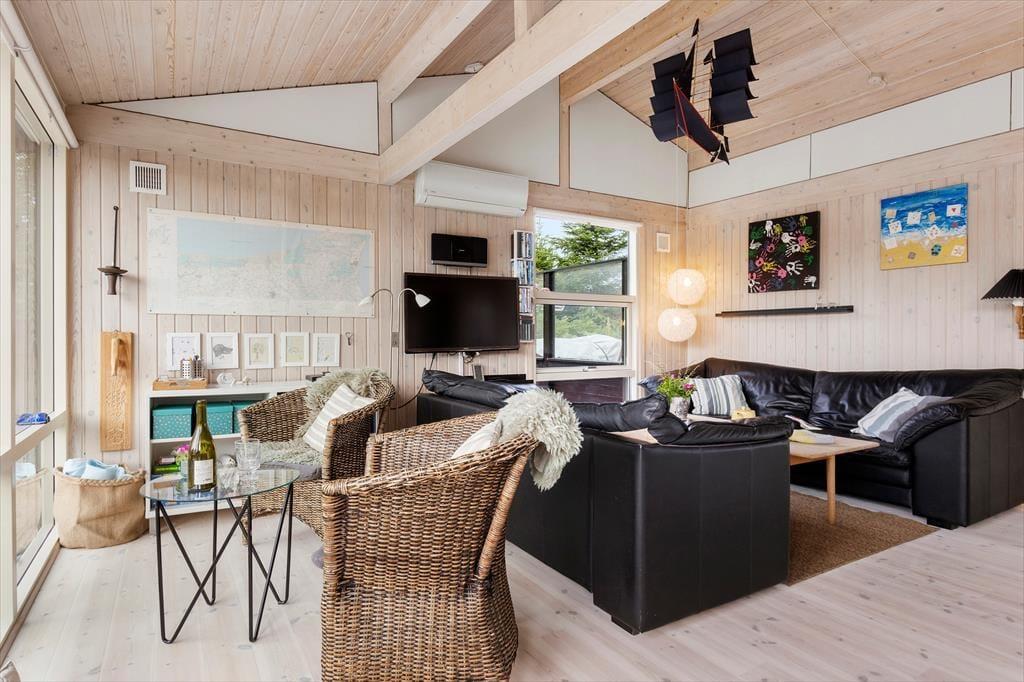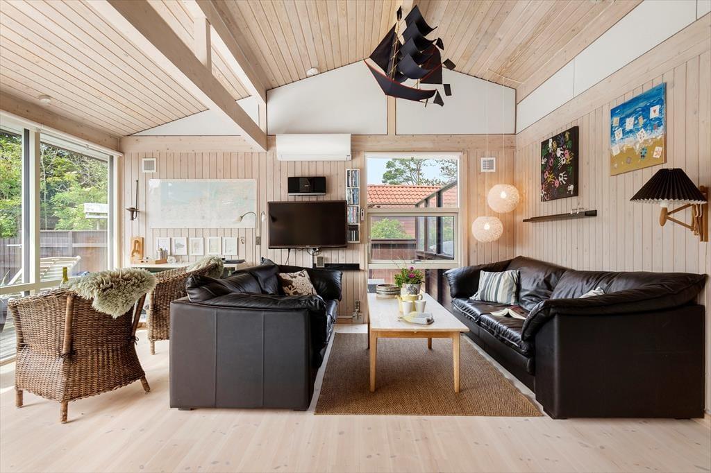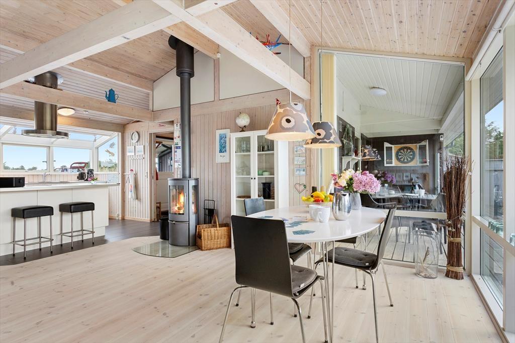 Indenfor venter en hyggelig atmosfære, hvor du og dine nærmeste kan slappe af efter dagens udflugter. Sommerhuset inviterer til samvær og ro med sin varme og hjemlige stemning, som hurtigt gør det let at finde feriehumøret frem. Her kan du fornemme, at der er plads til både afslapning og livlige samtaler, om det så er i sofaens bløde omfavnelse eller ved spisebordet, hvor måltiderne kan nydes i fred og ro. De rolige farver og det enkle interiør understøtter følelsen af et sommerhus, hvor man nemt kan falde til ro – og selvfølgelig er der plads til både børn og husdyr, så alle familiemedlemmer kan føle sig velkomne.