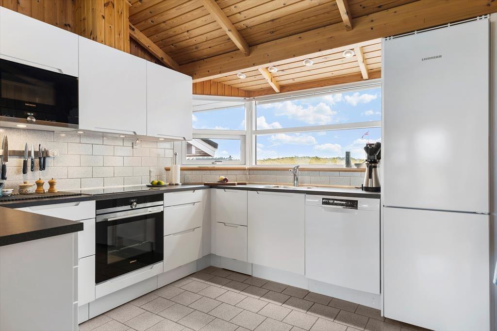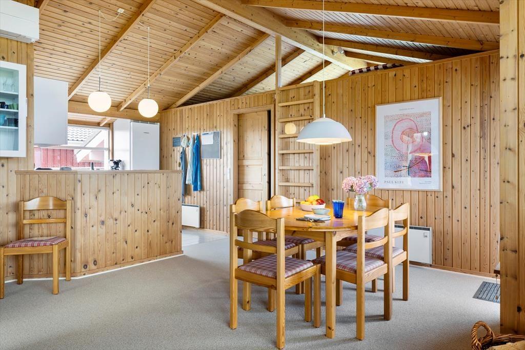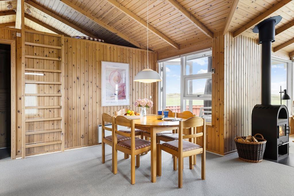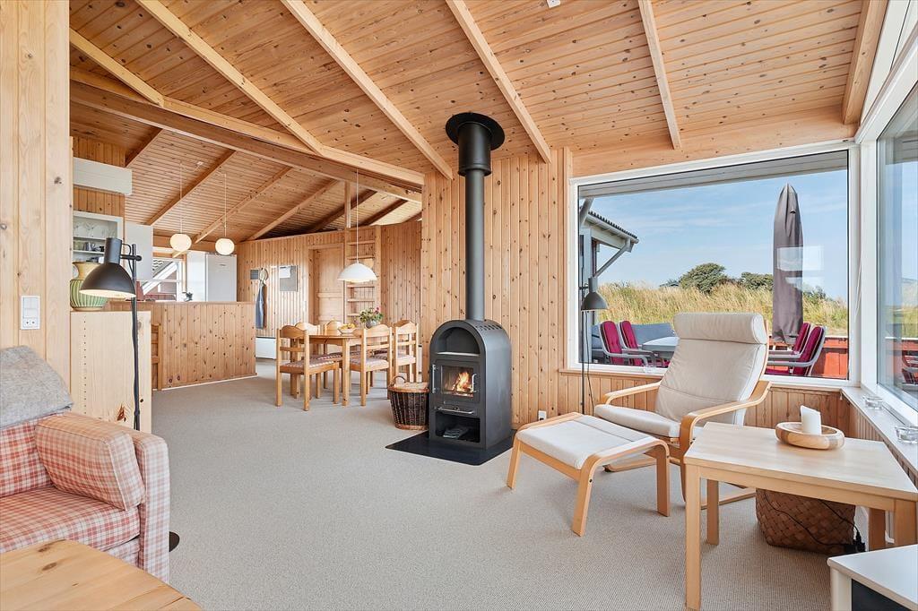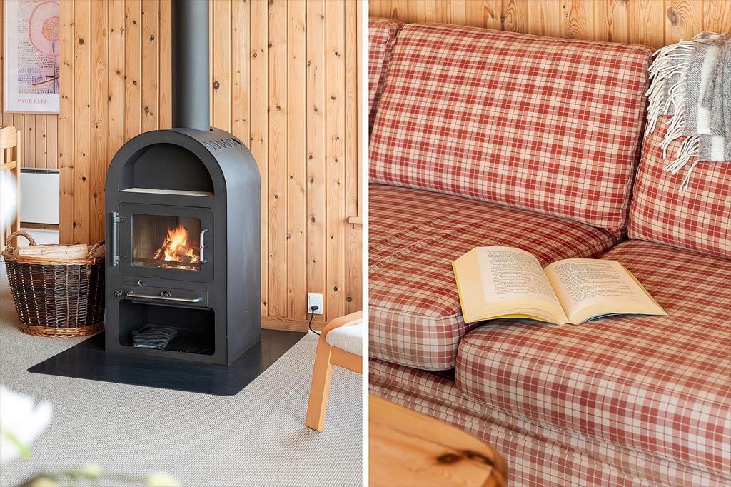 Det første, du lægger mærke til, når du træder indenfor, er den lyse og venlige atmosfære, som fylder hele sommerhuset. Indretningen er hyggelig og hjemlig – sådan et sted, hvor man hurtigt føler sig godt tilpas. I husets midte ligger stuen og køkkenet i åben forbindelse, hvilket skaber en naturlig ramme om feriedagene: Her kan du stå i køkkenet og tilberede morgenmaden, mens resten af familien samles omkring spisebordet eller langsomt vågner i sofaen med en kop kaffe i hånden. På kølige dage spreder brændeovnen varme og knitrende stemning, og når mørket falder på, kan I nyde en film eller bare falde i snak, mens ilden flakker bag ruden. Huset er praktisk indrettet med soveværelser og badefaciliteter i hver sin ende, så der er god plads og privatliv til alle – perfekt, hvis man er flere generationer afsted sammen eller rejser med gode venner.