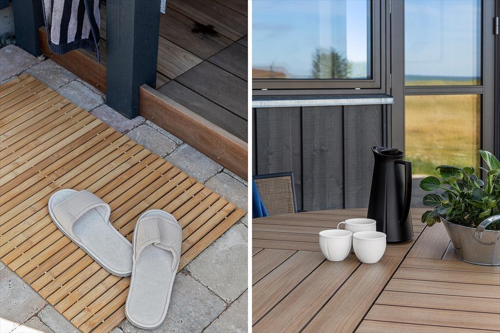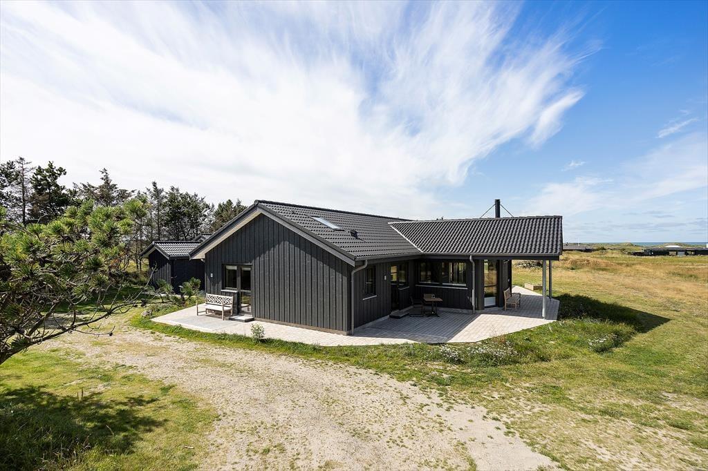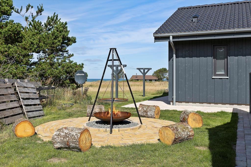 De udendørs rammer omkring sommerhuset er skabt til afslappende feriedage under åben himmel. Her er terrasser på begge sider af huset, så du kan følge solen eller finde skygge, alt efter humør og vejr. Den lukkede gårdhave skaber en privat og vindstille oase, hvor du kan tage et forfriskende bad under udebruseren efter en tur til stranden eller cykeltur i det nærliggende klitlandskab. Det åbne landskab omkring huset giver en følelse af frihed – og der er havudsigt. Der er læ at finde på grunden, hvilket gør det oplagt at tilbringe lange sommeraftener udendørs, måske omkring grillen, mens solen går ned og dagens sidste varme kaster et gyldent skær over terrassens træplanker. I det store skur er der god plads til cykler, så det er let at tage på tur, når I får lyst til at udforske området på to hjul.