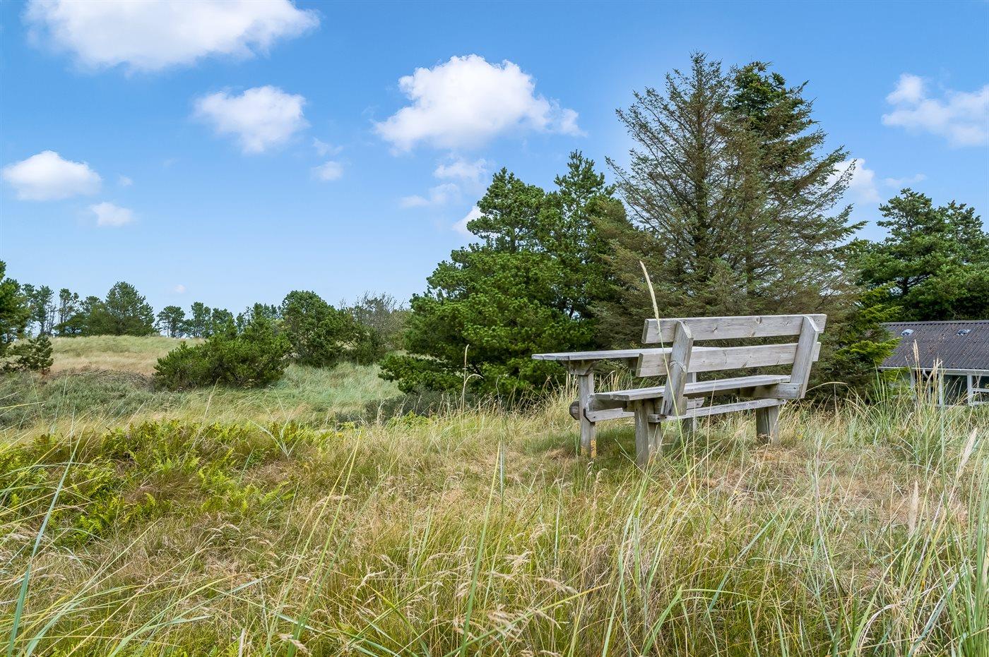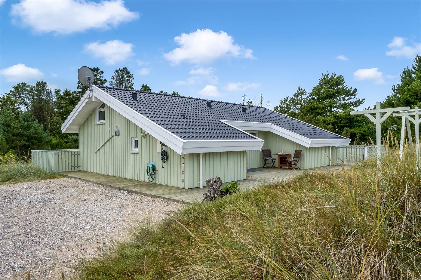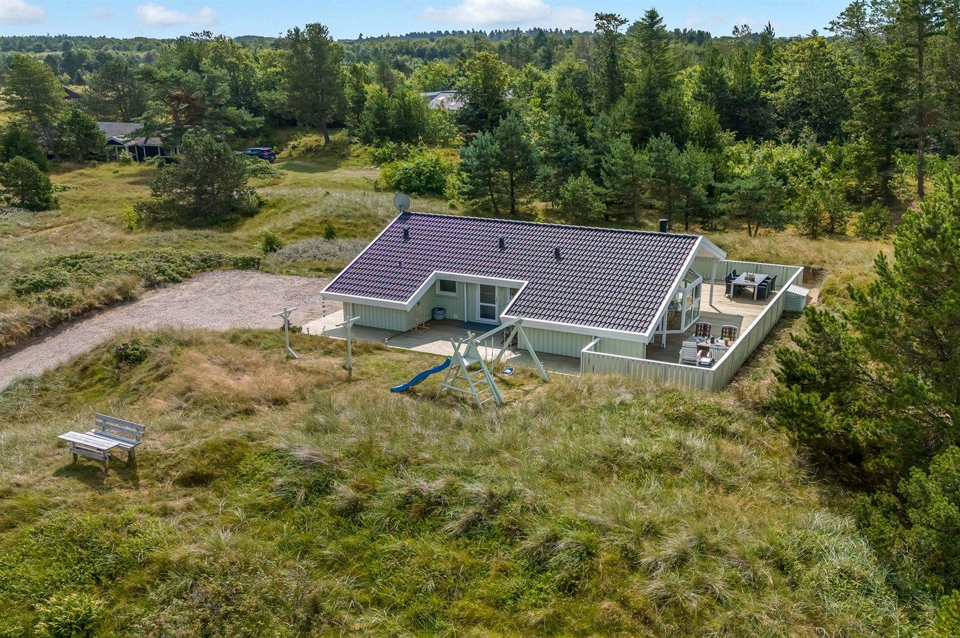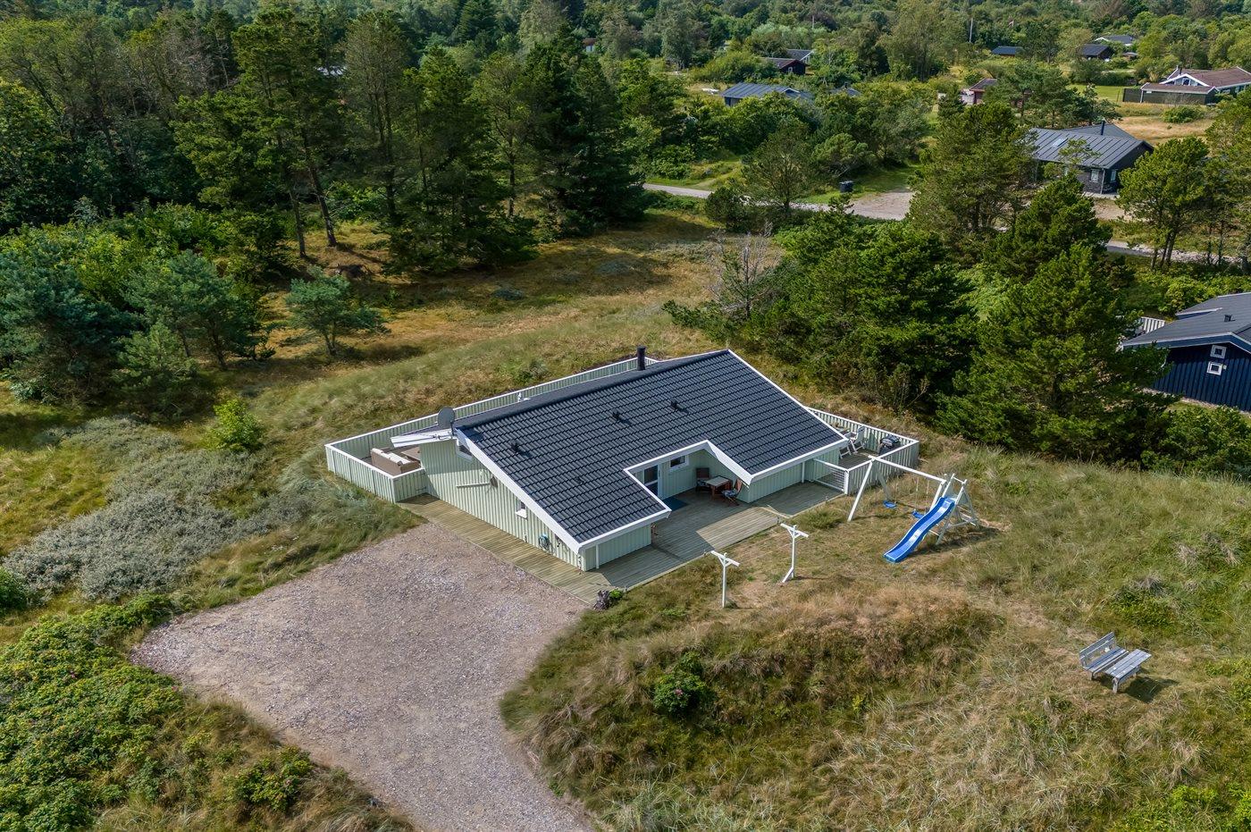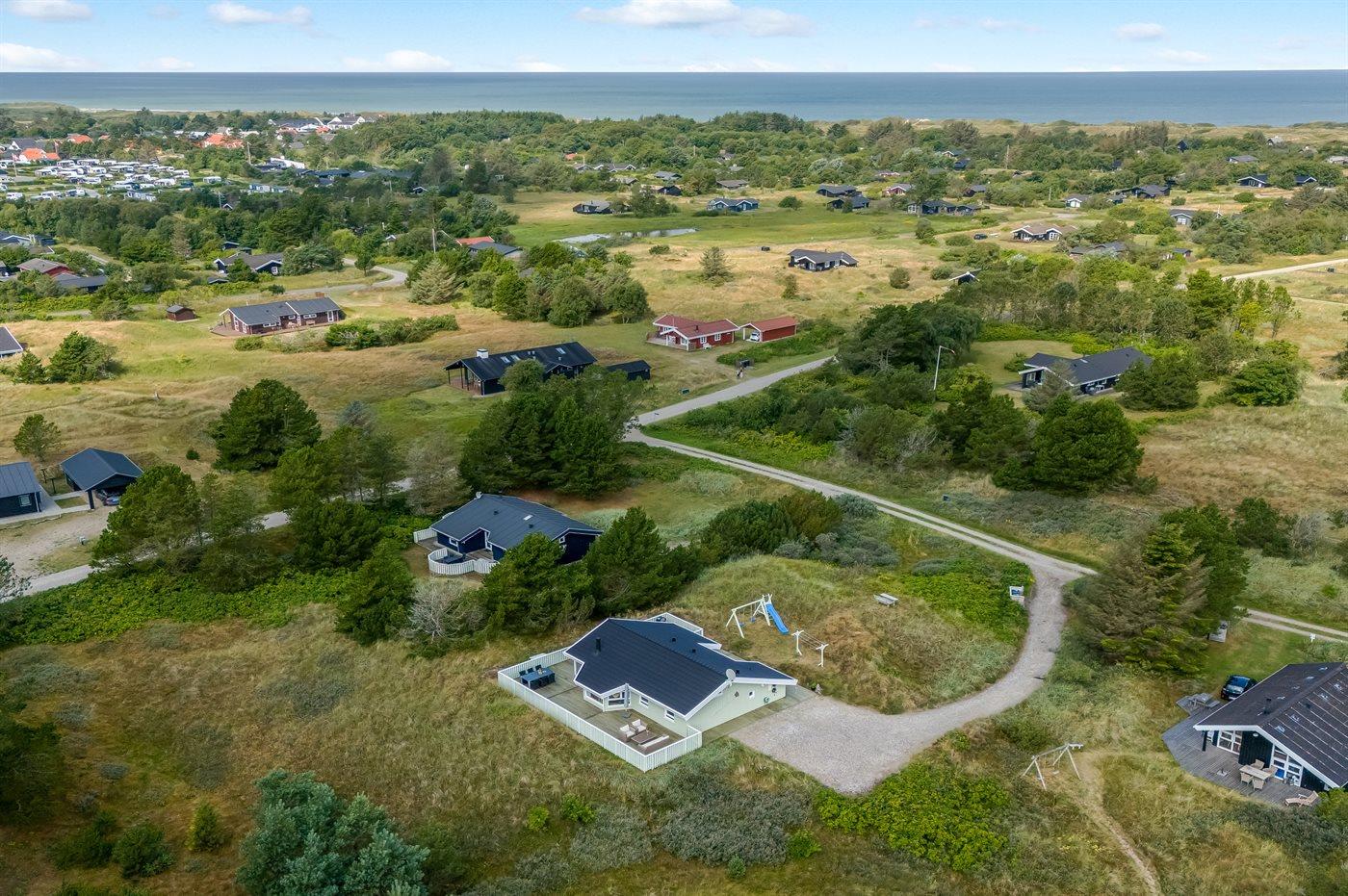 Ferieboligen er beliggende på en 2503 m² stor naturgrund. Der er 750 m til havet. Nærmeste forretning er beliggende i en afstand af 1000 m. Til ferieboligen hører 60 m² terrasseareal. Desuden er der 5 m² overdækket terrasse. Der er redskabsrum. Gynge. Der er installeret stik til opladning af elbil. Med 11 kW ladeeffekt. Parkering ved ferieboligen.