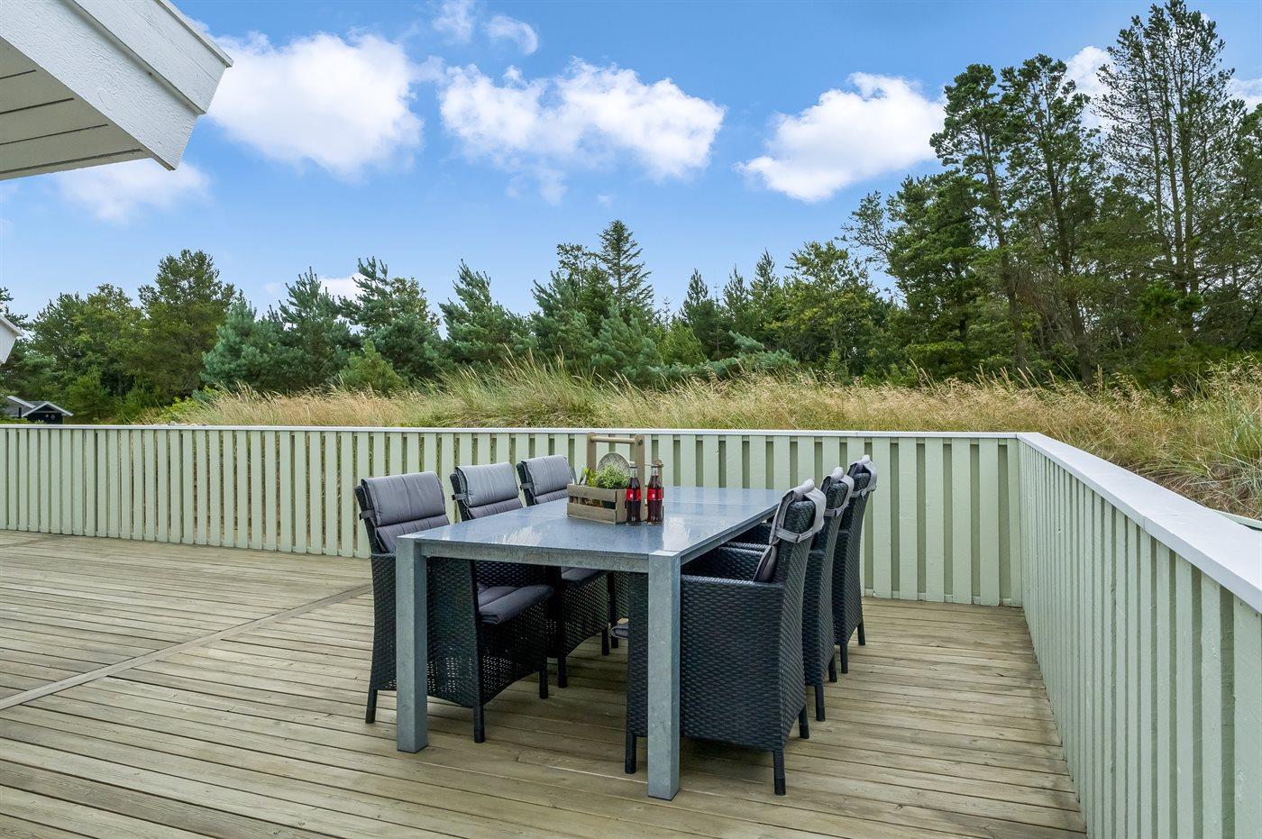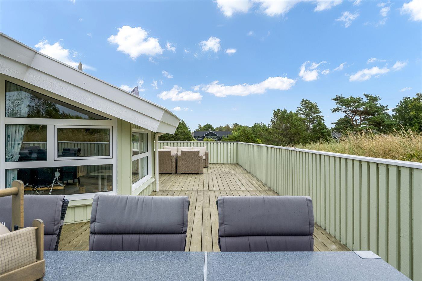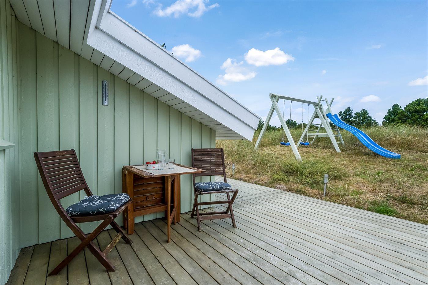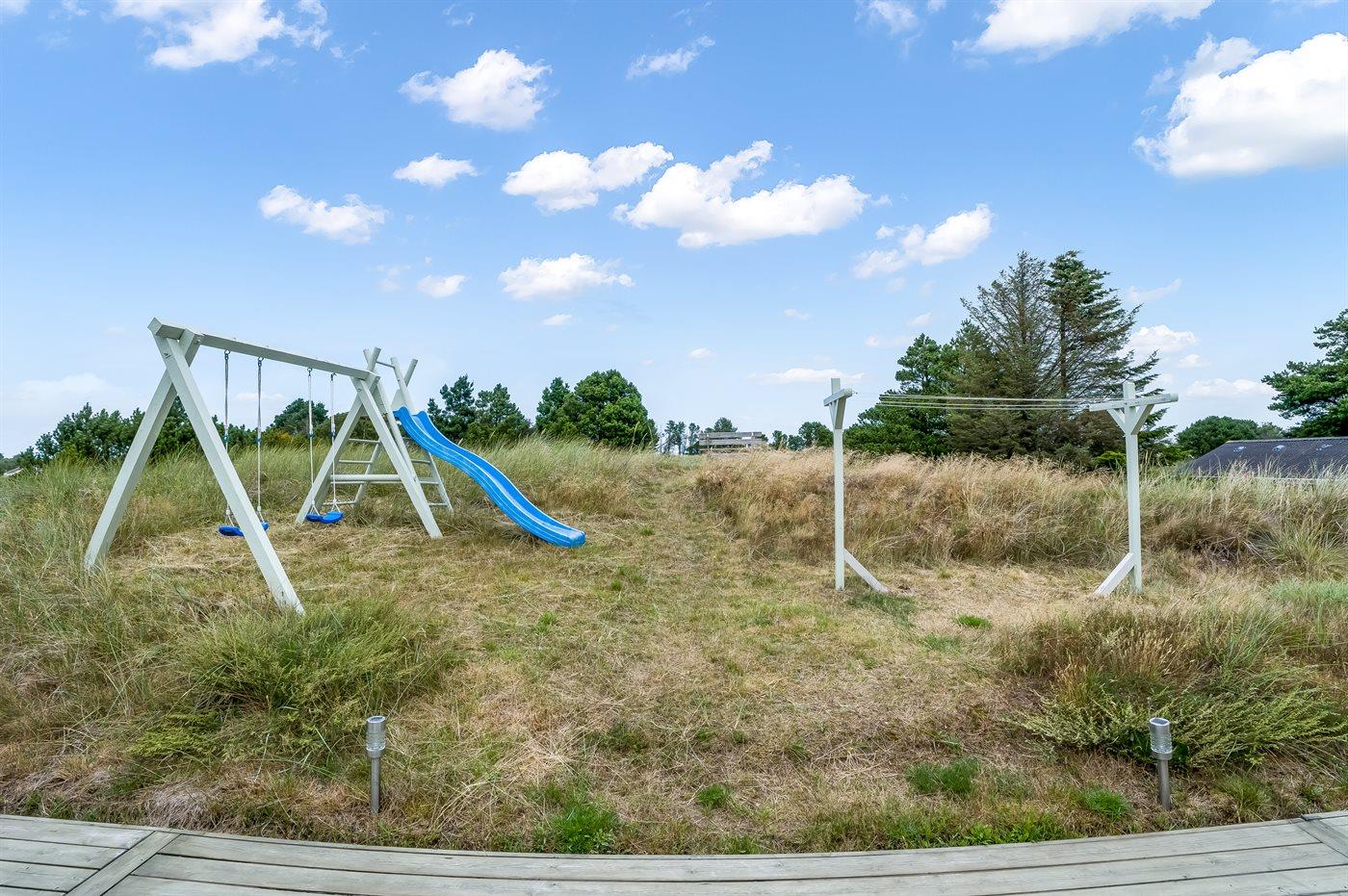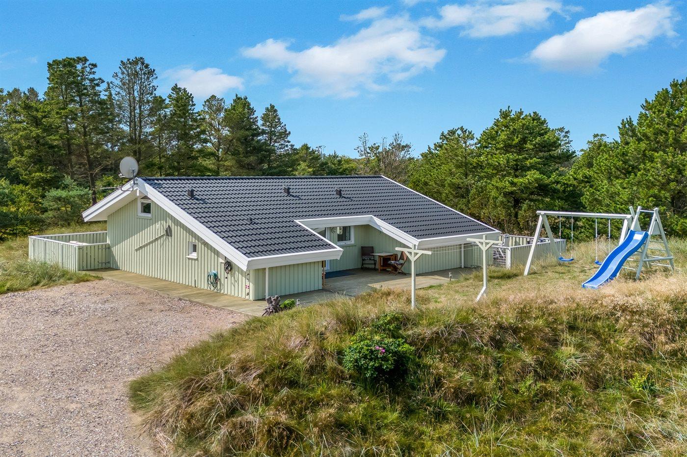 Ferieboligen er beliggende på en 2503 m² stor naturgrund. Der er 750 m til havet. Nærmeste forretning er beliggende i en afstand af 1000 m. Til ferieboligen hører 60 m² terrasseareal. Desuden er der 5 m² overdækket terrasse. Der er redskabsrum. Gynge. Der er installeret stik til opladning af elbil. Med 11 kW ladeeffekt. Parkering ved ferieboligen.