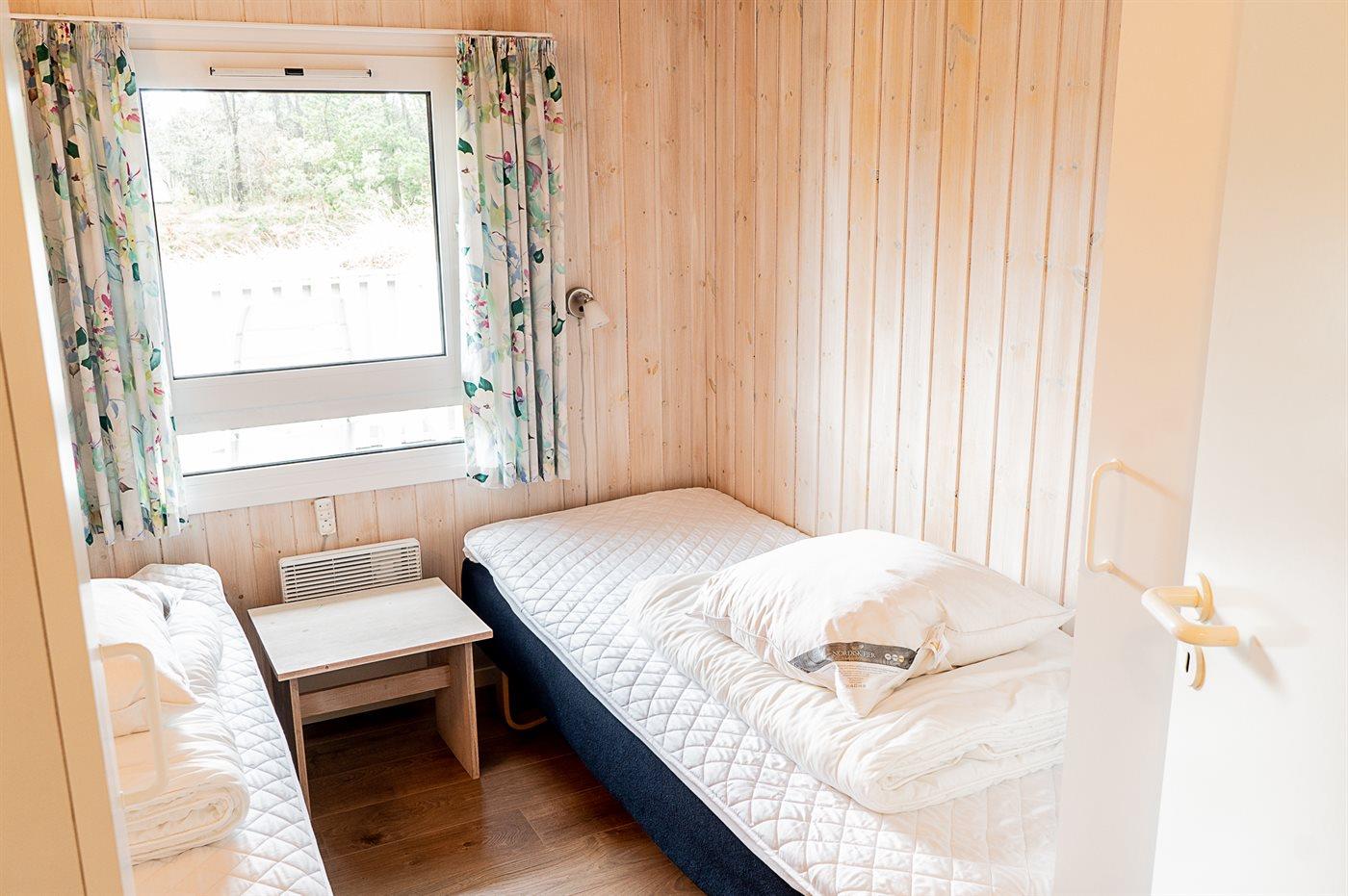 Der er i alt 3 soveværelser. Sovepladserne fordeler sig på: 2 sovepladser i dobbeltseng. 4 sovepladser i enkeltsenge. 1 af disse sovepladser befinder sig på husets hems. Derudover er der 1 stk. barneseng.