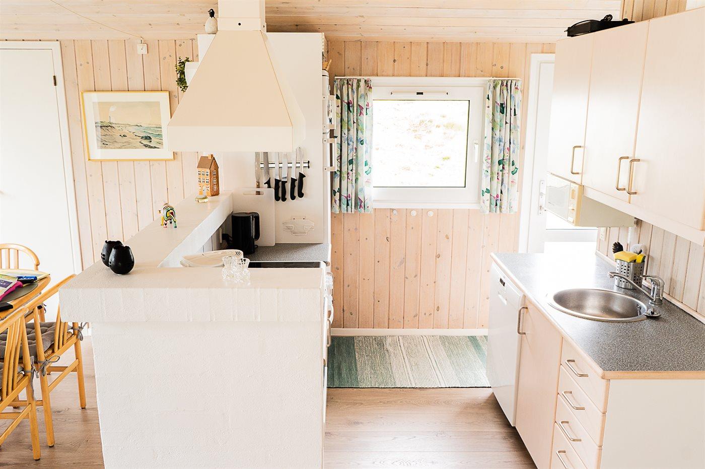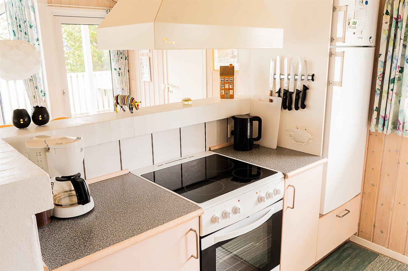 Køkkenet er udstyret med 1 køleskab. Der er 4 elkogeplader, varmluftovn, mikrobølgeovn samt opvaskemaskine.