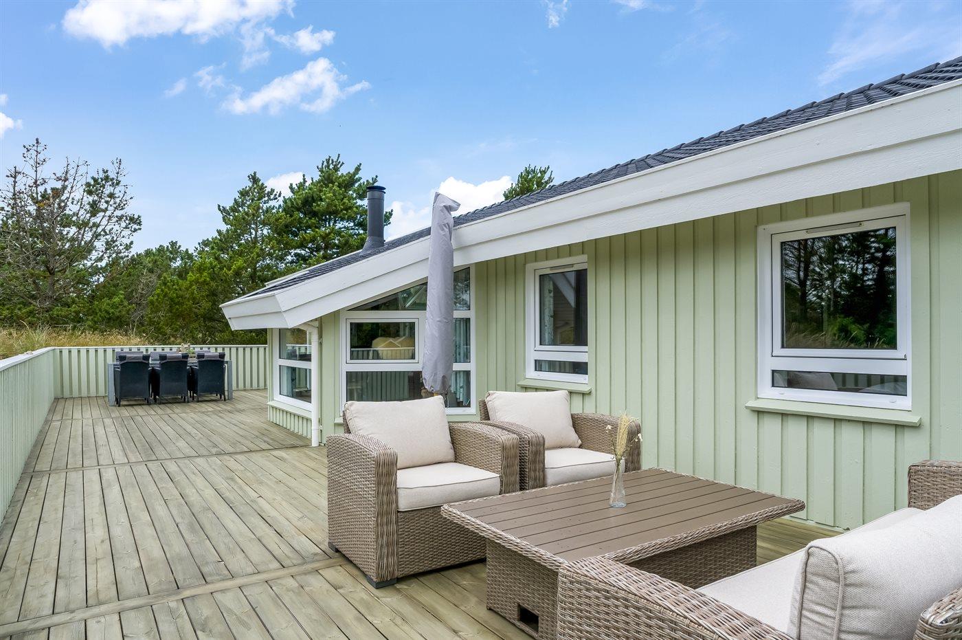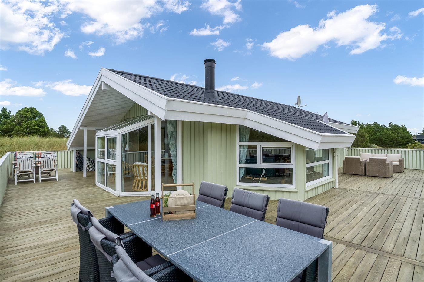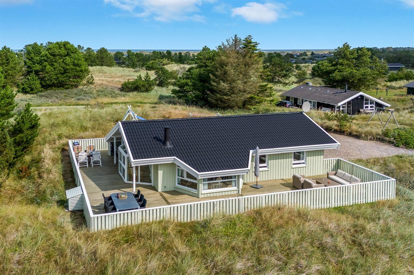 Dejligt sommerhus beliggende tilbagetrukket på en stor højt beliggende grund, på en blind vej, lige udenfor Tversted og nær stranden og Vesterhavet.
