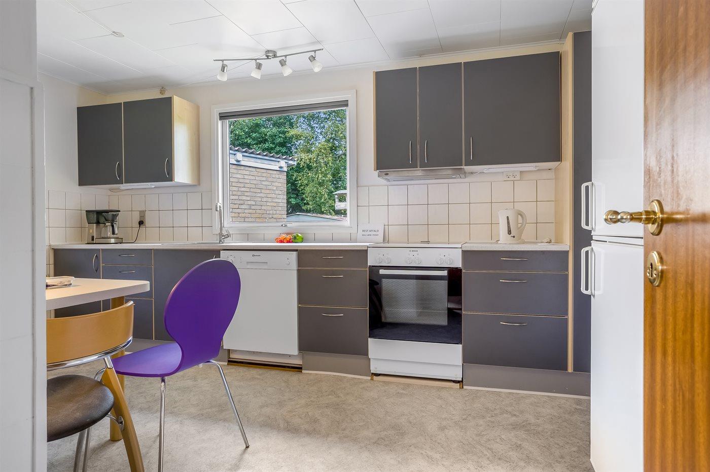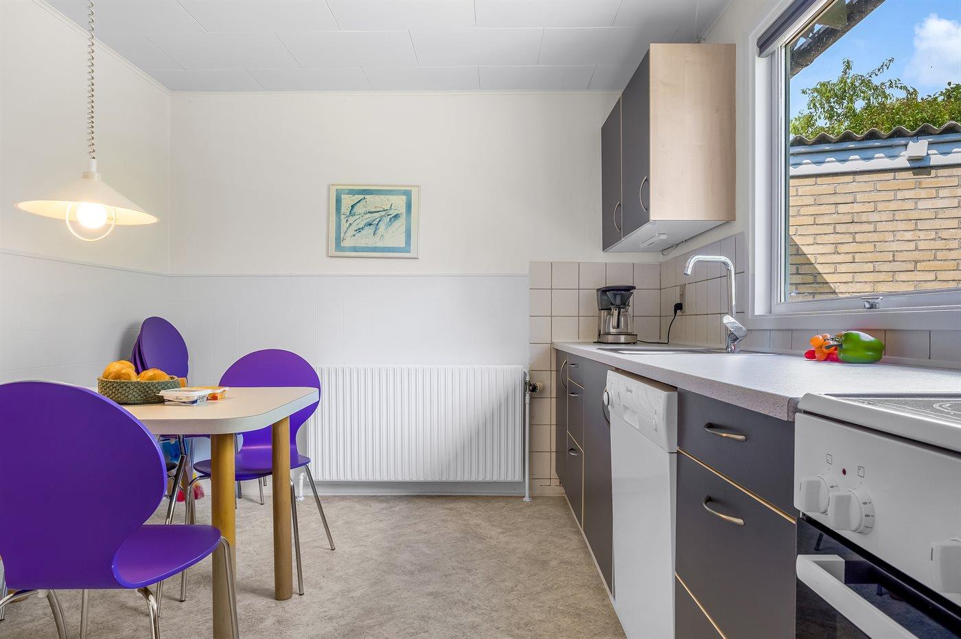 Køkkenet er udstyret med 1 køleskab. Der er 4 keramiske kogeplader, varmluftovn, mikrobølgeovn samt opvaskemaskine.