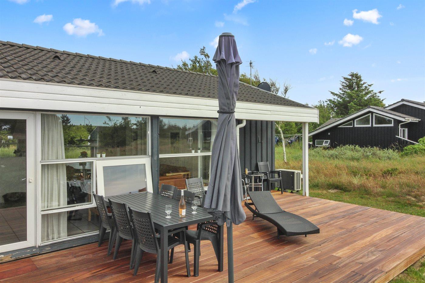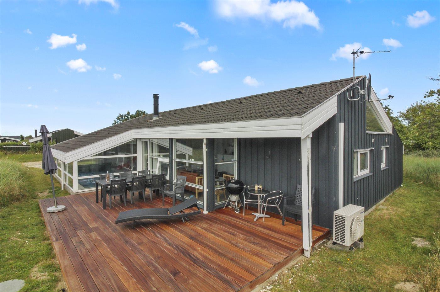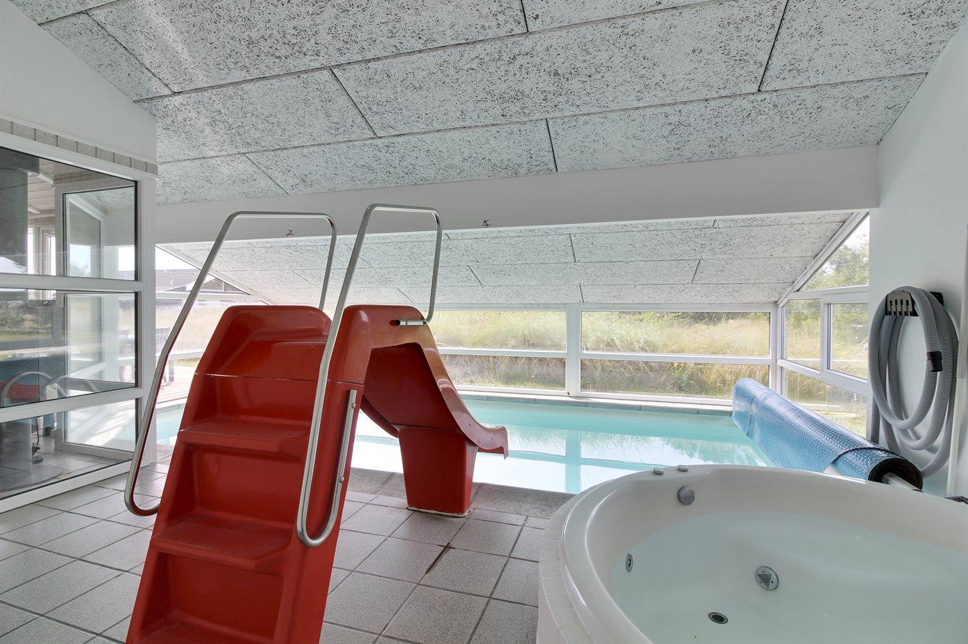 Dette sommerhus med swimmingpool ligger på en lukket, rolig vej og har udsigt til det fredede klitområde. Der er havkig fra ferieboligen. I poolafdelingen er der rutsjebane, 4 personers spa samt sauna. I 2025 er belysningen i poolområdet udskiftet med WiZ-belysning, der kan vise 16 mio. farver mv. I huset kan der være op til 9 personer samt 1 barn op til 3 år. Det er tilladt at medbringe 2 husdyr.