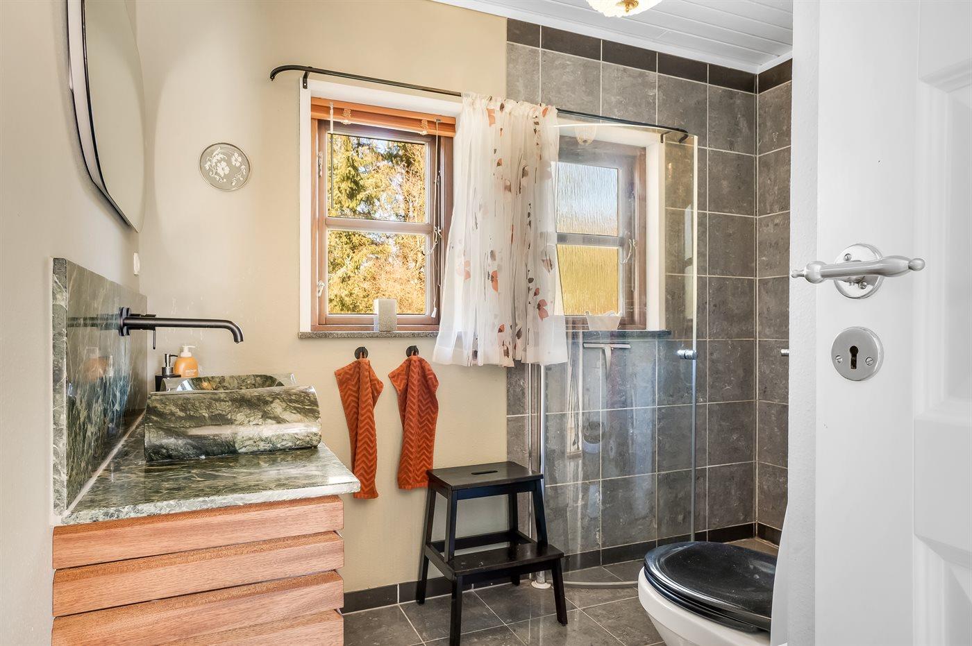Der er 1 badeværelse med bruseniche og 2 toiletter, heraf 1 gæstetoilet. Der er gulvvarme på 1 badeværelse.