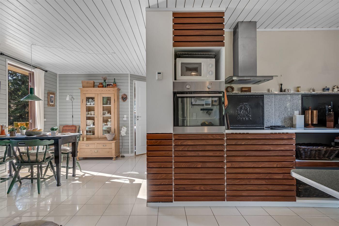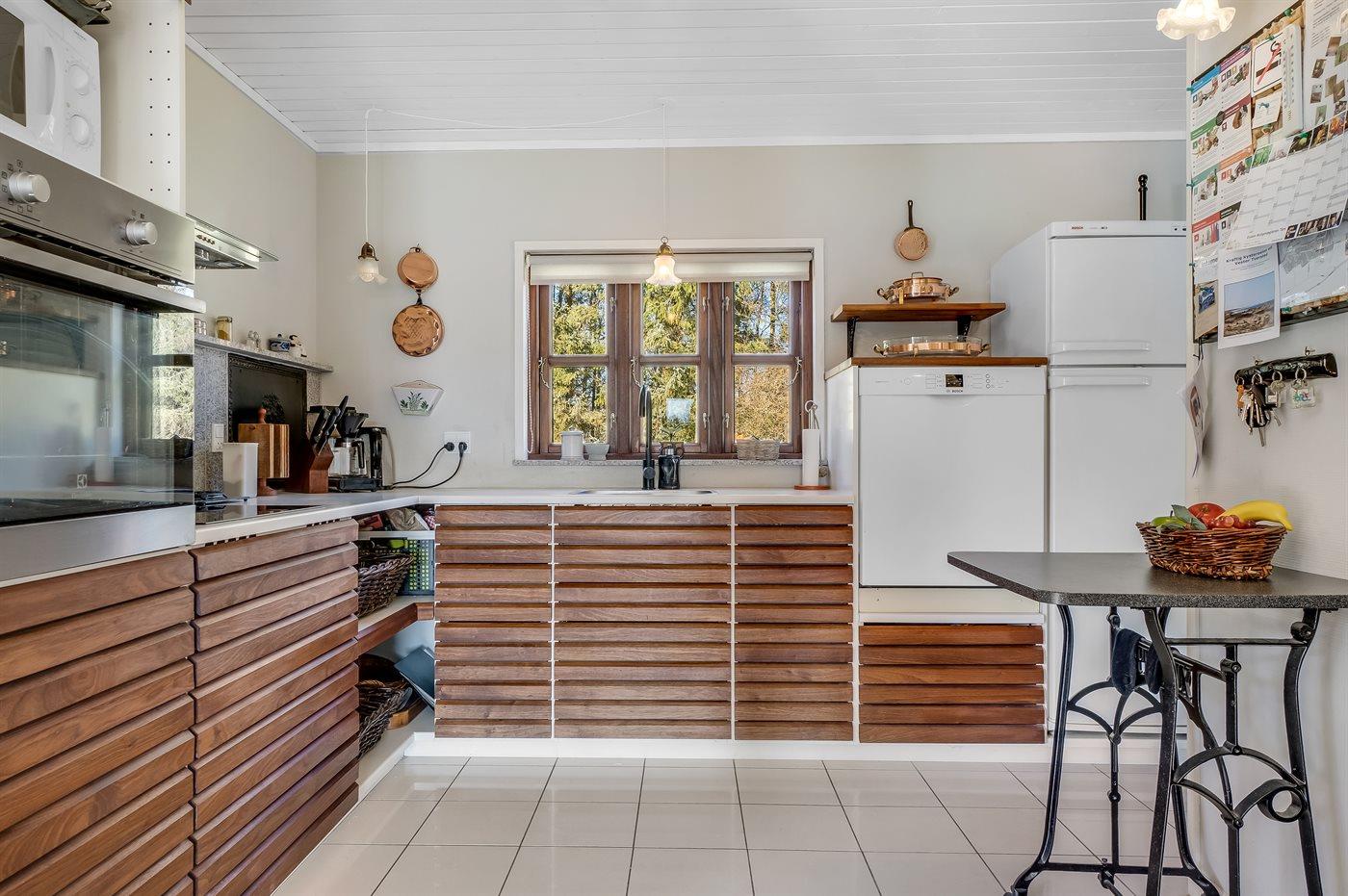Køkkenet er udstyret med 1 køleskab. Der er 4 keramiske kogeplader, varmluftovn, mikrobølgeovn samt opvaskemaskine.