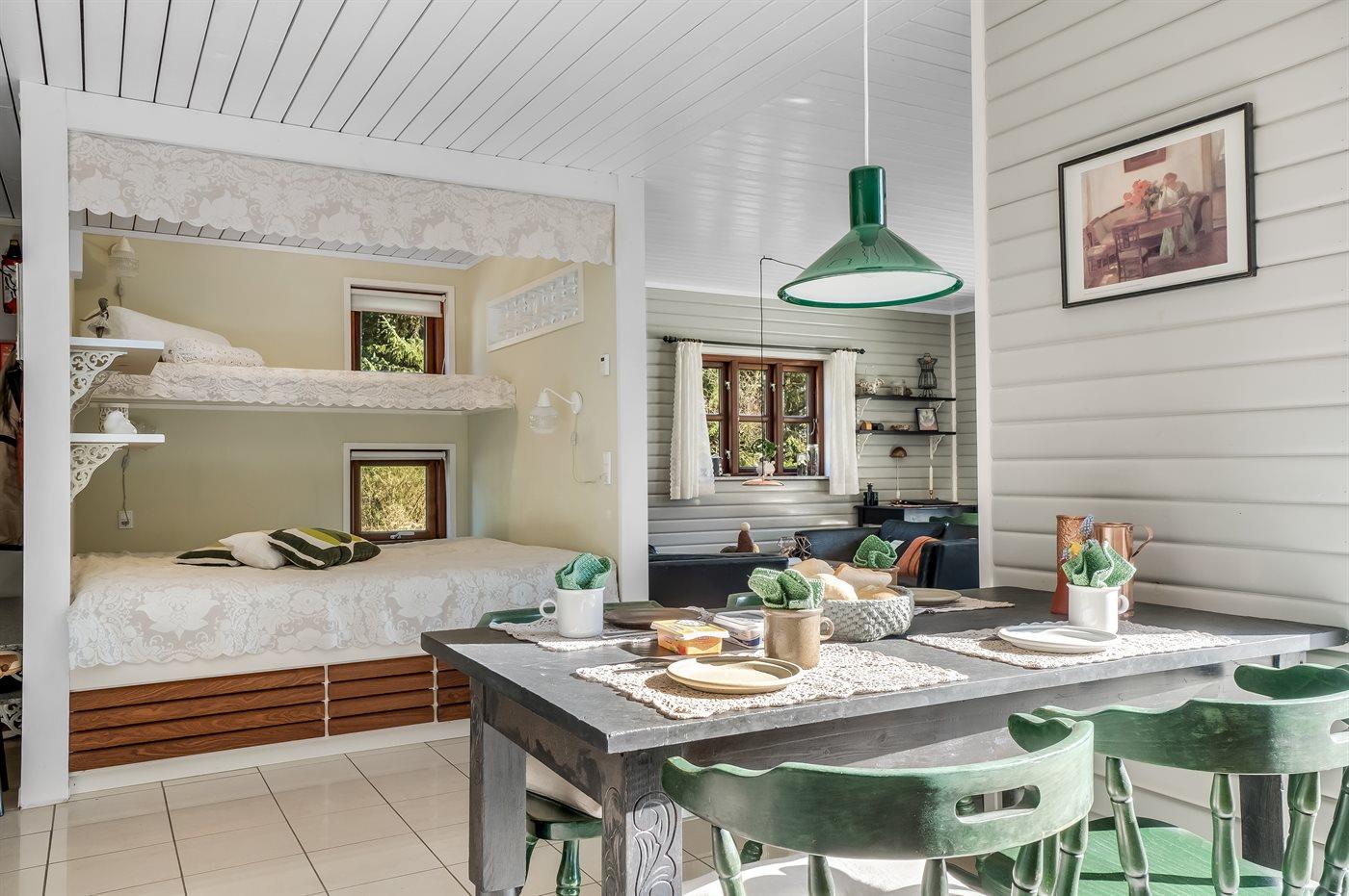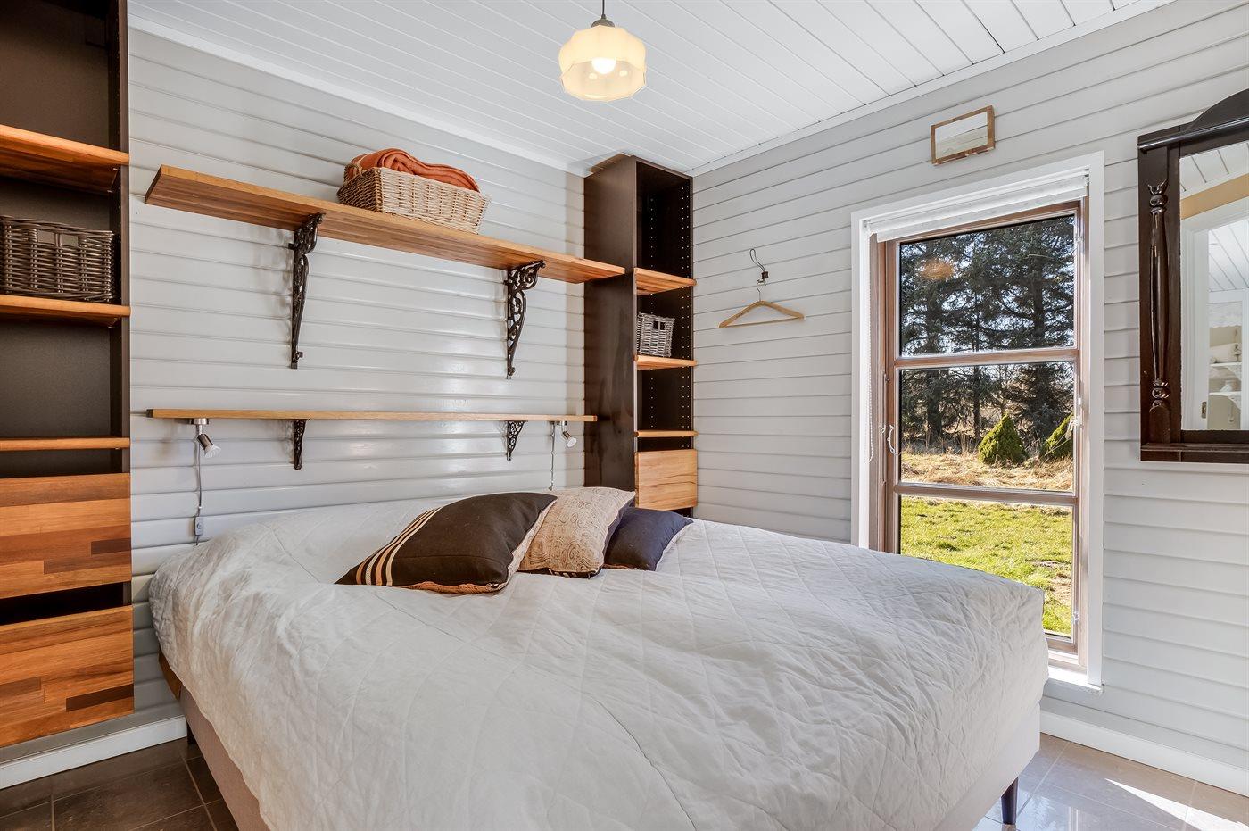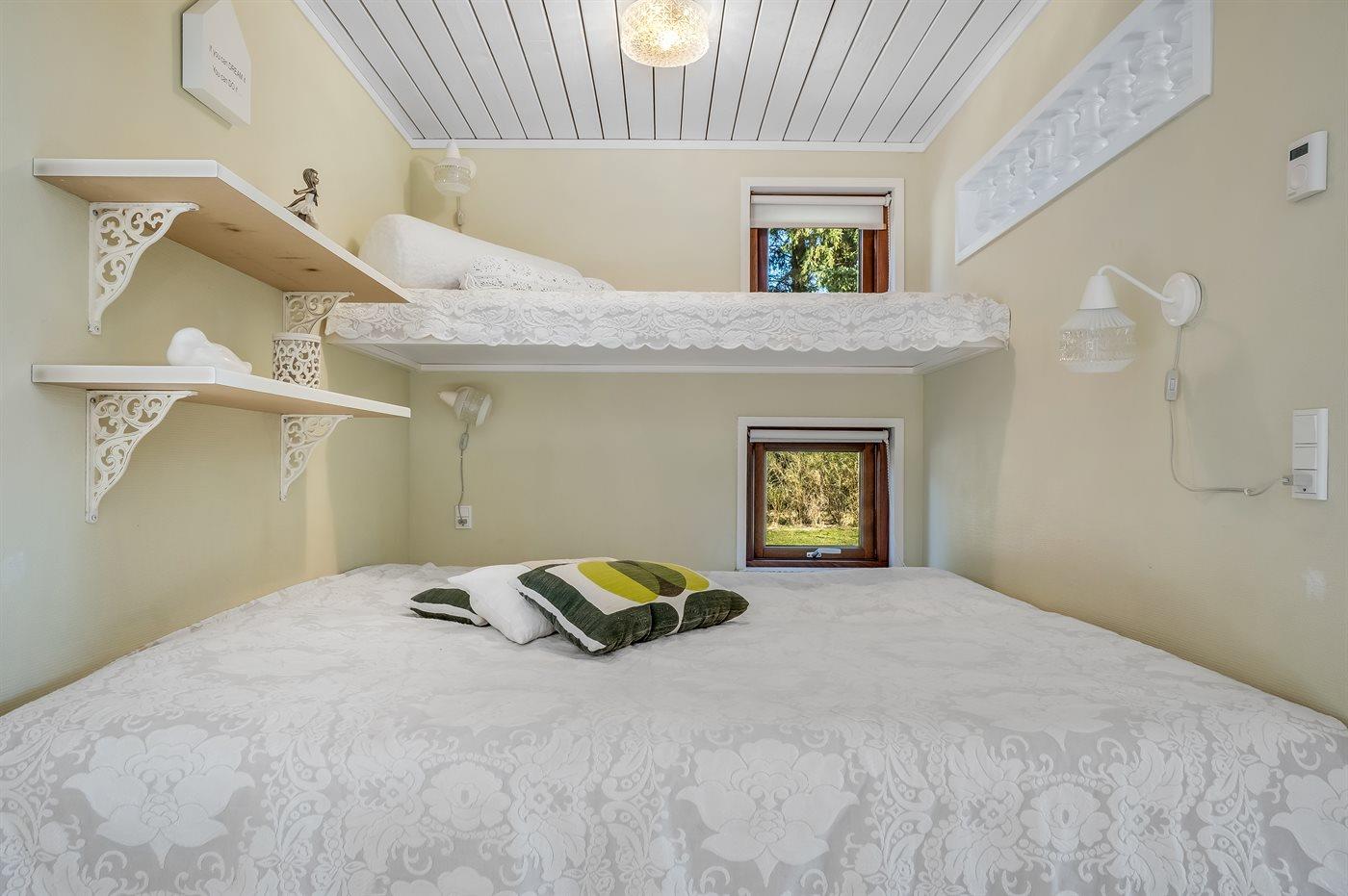Der er i alt 2 soveværelser. Sovepladserne fordeler sig på: 2 sovepladser i dobbeltseng. 2 sovepladser i enkeltsenge. 2 sovepladser i alkove. Derudover er der 1 stk. barneseng.