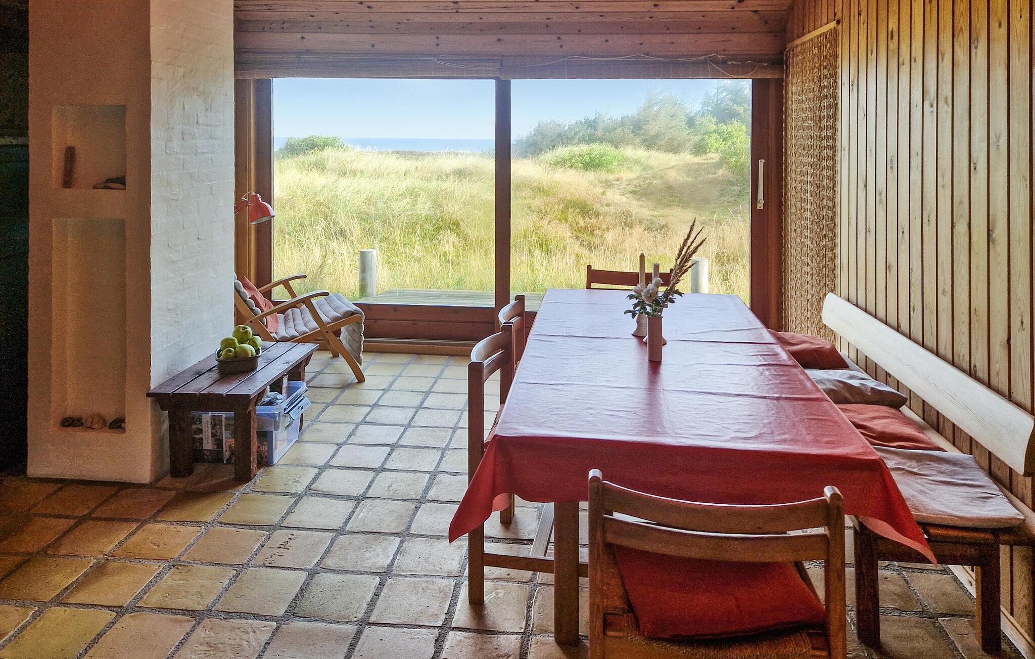 Glæd jer til jeres enkle, men charmerende feriehus, der udstråler karakter og komfort. Træd ind i det hyggelige interiør med træpaneler, varme farver og store vinduer, der tilbyder en fantastisk udsigt over klitterne og havet. Gør det behageligt på de komfortable siddepladser i stuen og nyd den afslappede atmosfære. Brug det åbne køkken og nyd hyggelige timer med familien ved spisebordet.