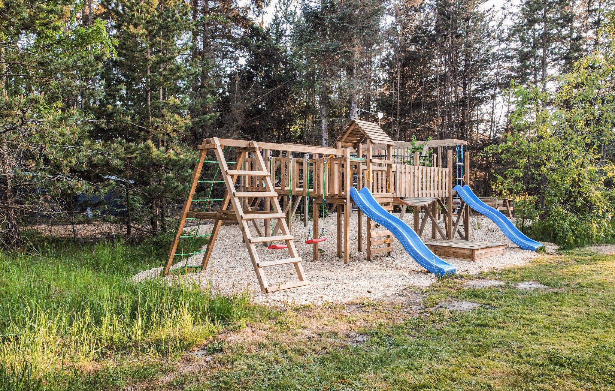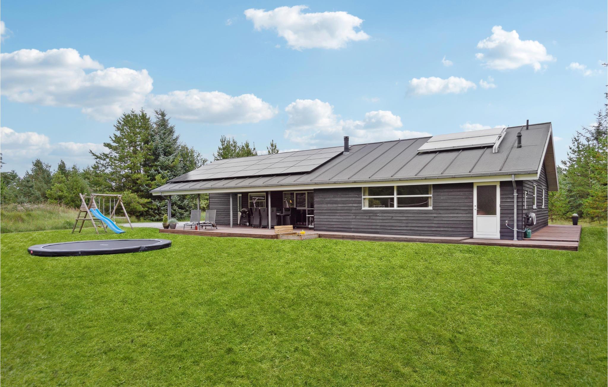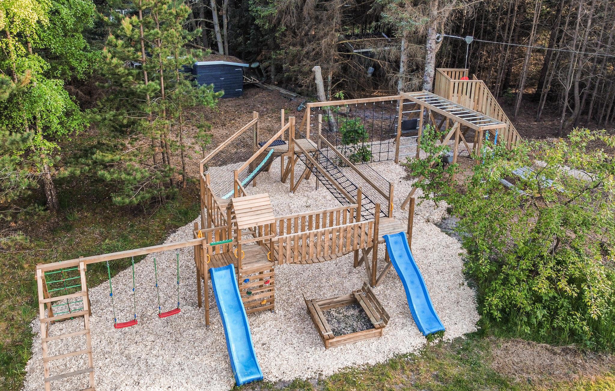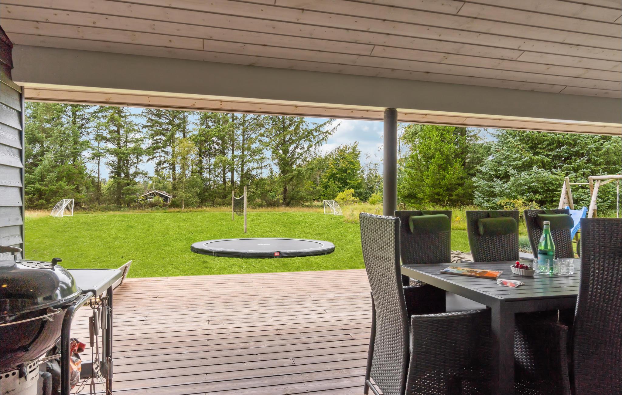 Udeområdet er tilsvarende fantastisk. Her er der masser af plads for børnene at boltre sig på, en trampolin og et veludstyret legeområde med en lang svævebane, der indbyder til mange timers sjov måske endda også for de voksne. Udfordr flokken til en fodbold- eller volleykamp på den store grund, inden I smider lidt lækkert på grillen og nyder en saftig bøf under aftensolen med et godt glas vin.
