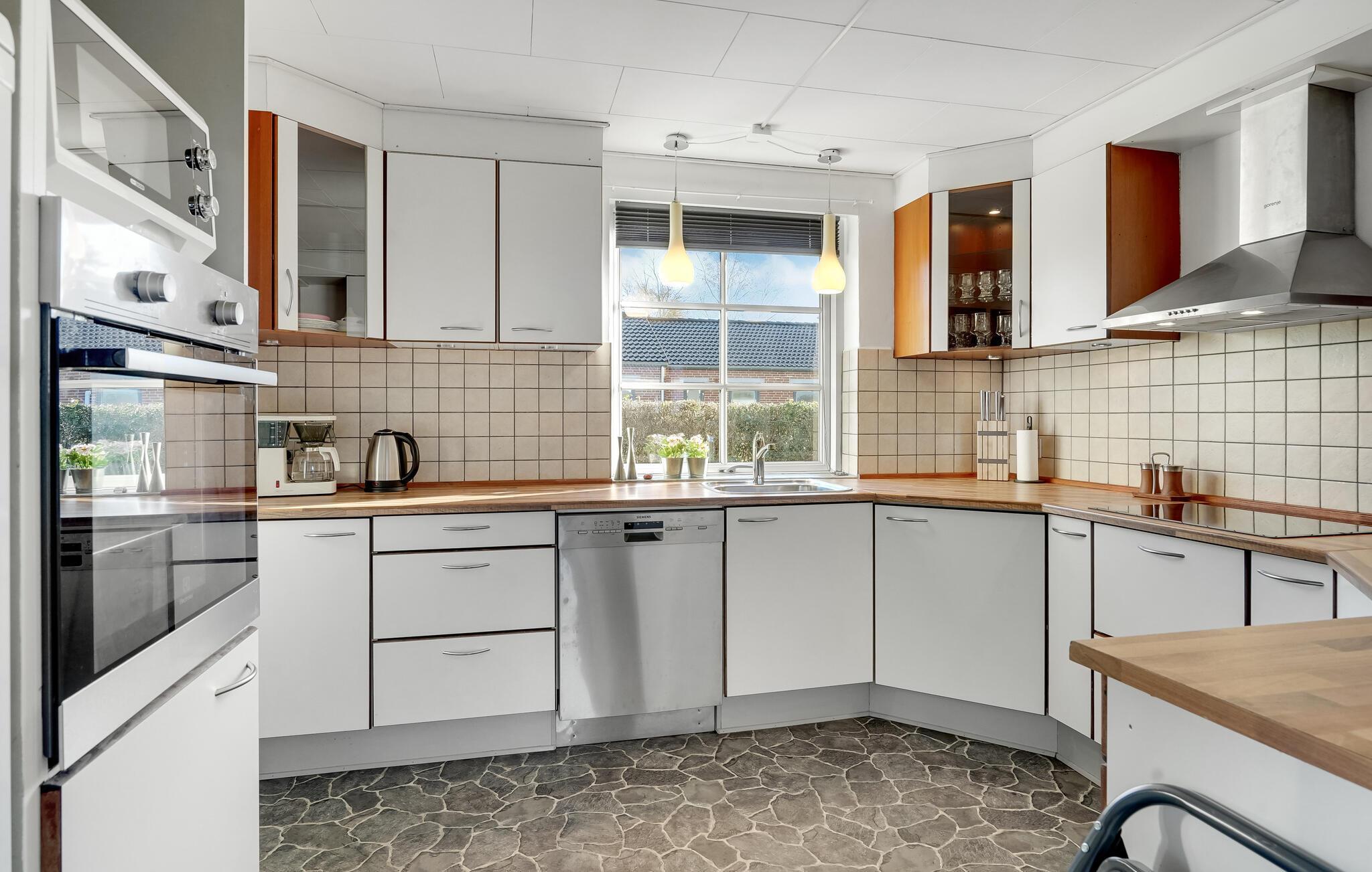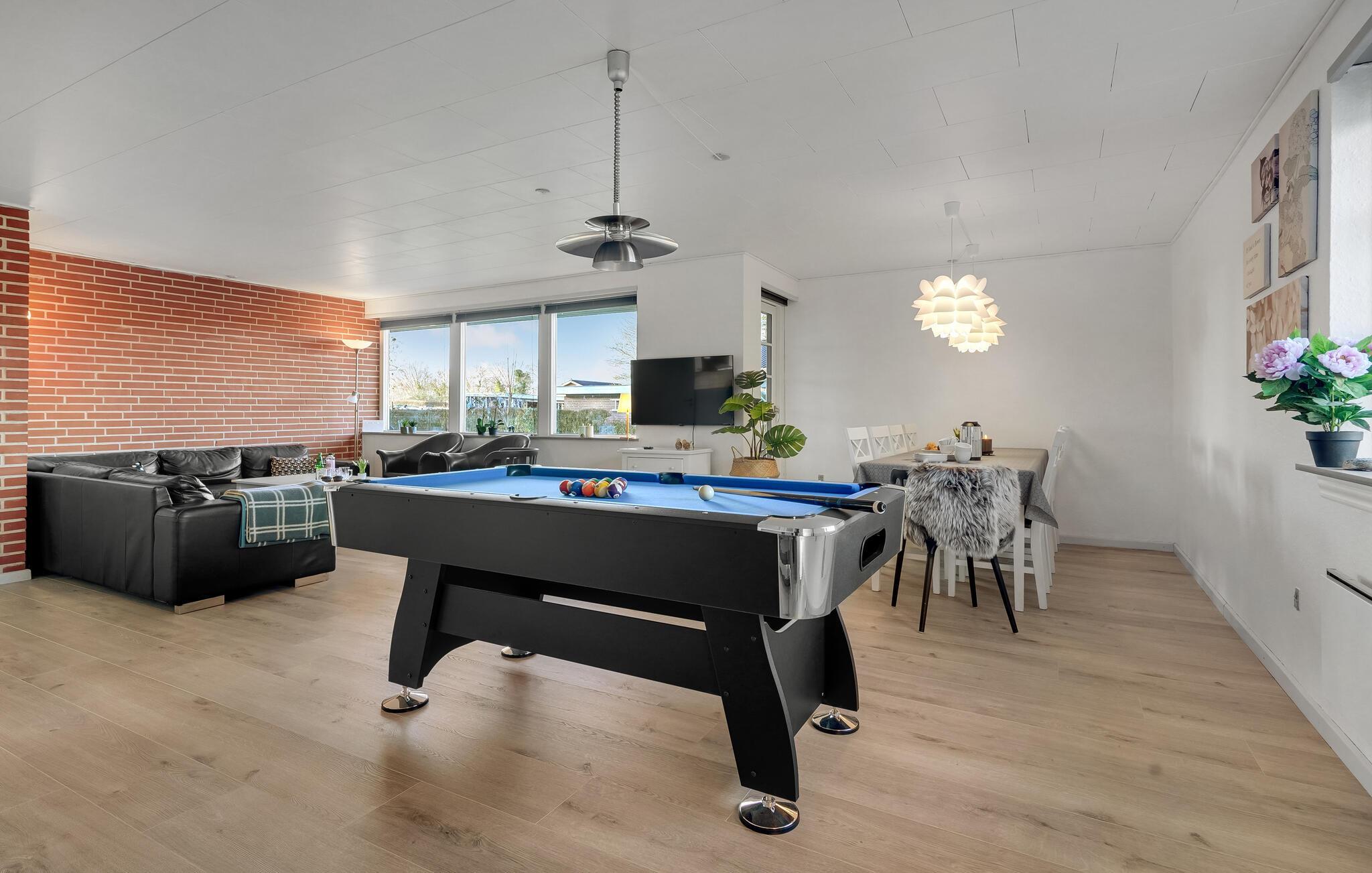 Velkommen til dette skønne feriehus, der byder på plads til jeres store familie. Alle, lige fra småbørn til bedsteforældre, vil føle sig hjemme her og tilbringe en afslappende tid. Mens nogle læser en bog i sofaen, kan andre spille et spil billard eller kort ved spisebordet. To terrasser inviterer jer til at nyde den friske luft og solbade. Nyd en lækker grillmiddag og se jeres børn boltre sig på græsplænen.