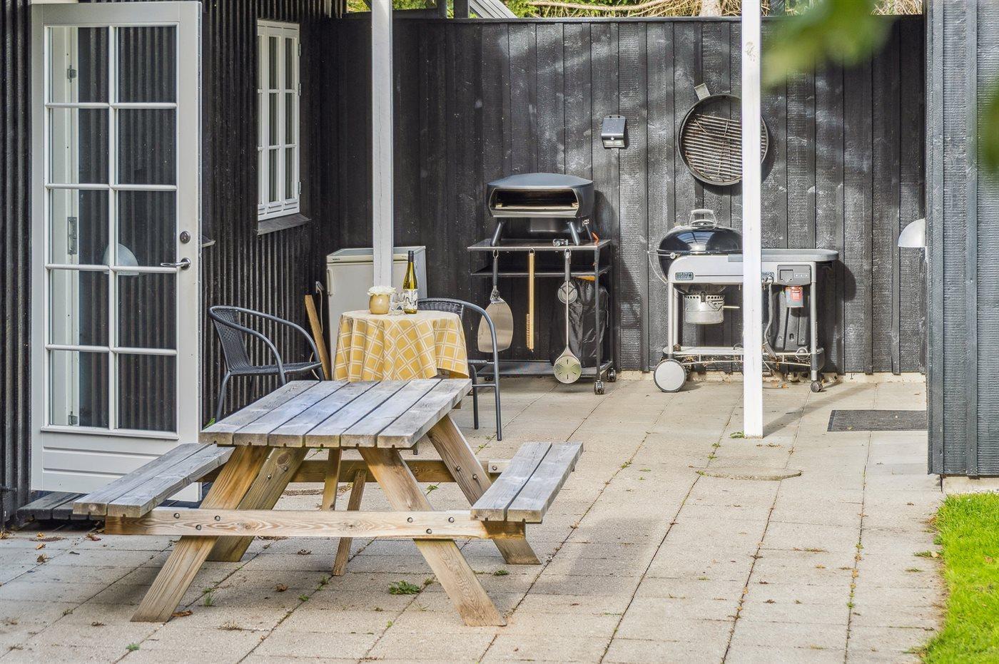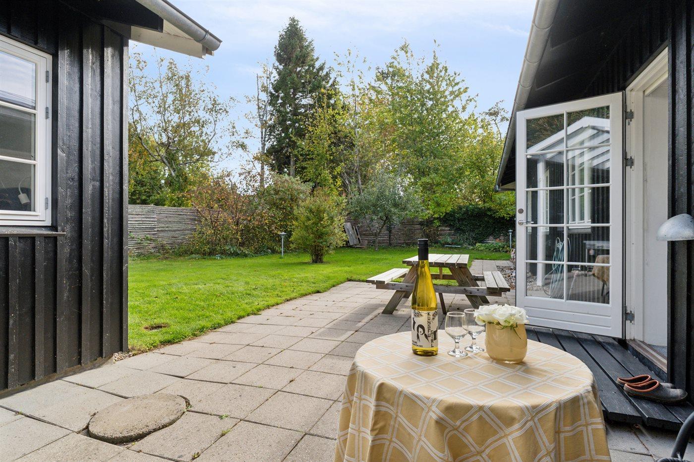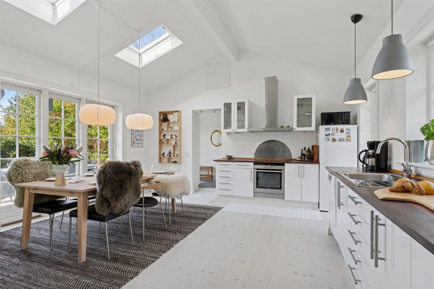 Det rummelige køkken lægger op til fælles madlavning og hyggelige stunder. Udenfor indbyder flere dejlige terrasser til måltider i solen eller i skyggen – alt efter tidspunktet på dagen. I den store have er der god plads til leg og boldspil, og når aftenen falder på, kan I tænde lanternerne og slutte dagen af med en hyggelig grillmiddag under åben himmel.
