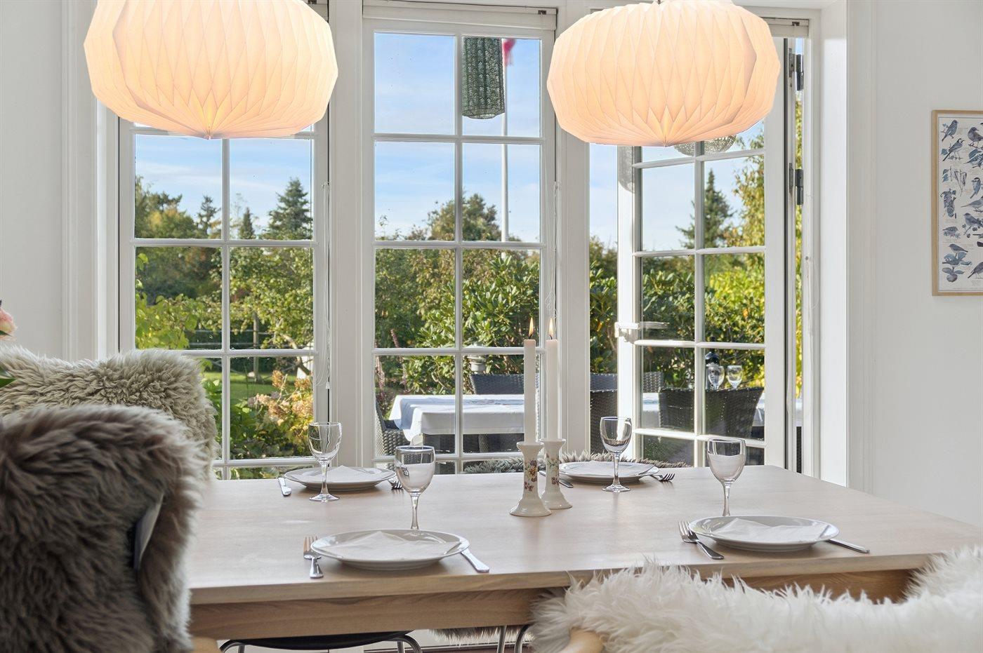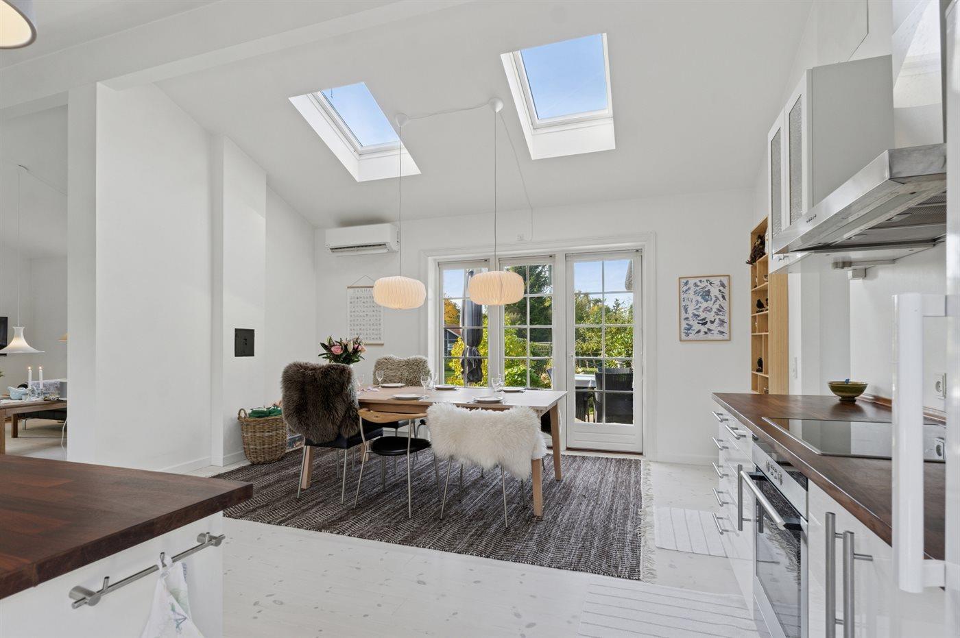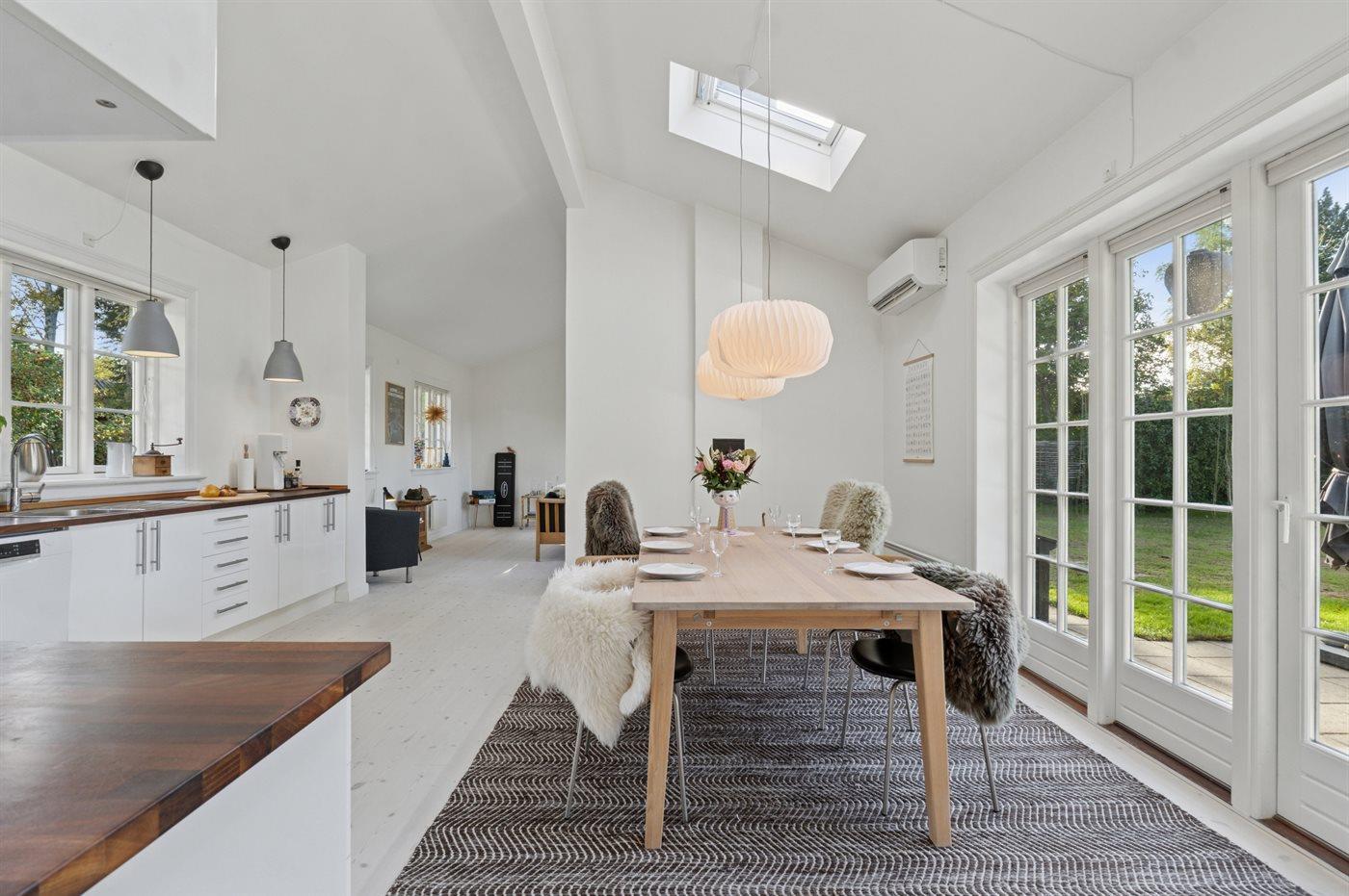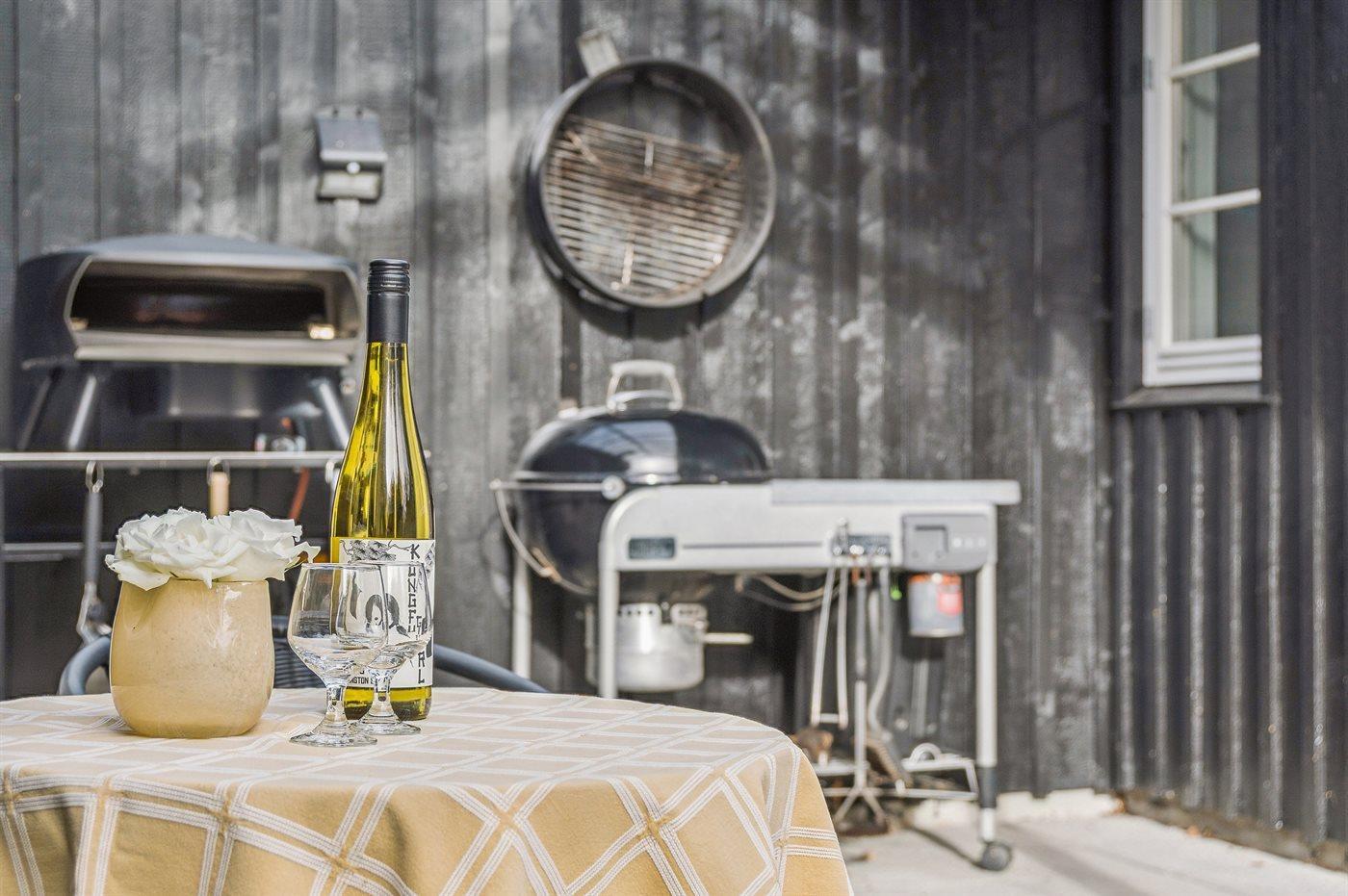 Det rummelige køkken lægger op til fælles madlavning og hyggelige stunder. Udenfor indbyder flere dejlige terrasser til måltider i solen eller i skyggen – alt efter tidspunktet på dagen. I den store have er der god plads til leg og boldspil, og når aftenen falder på, kan I tænde lanternerne og slutte dagen af med en hyggelig grillmiddag under åben himmel.