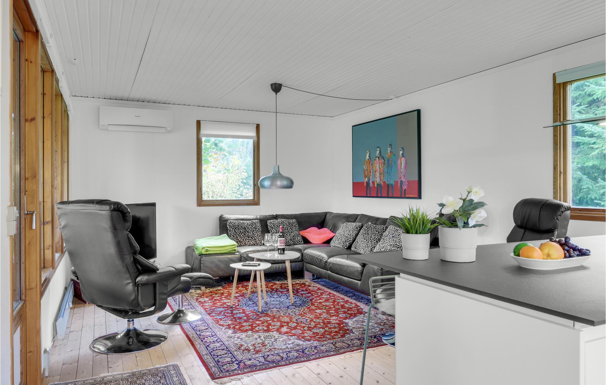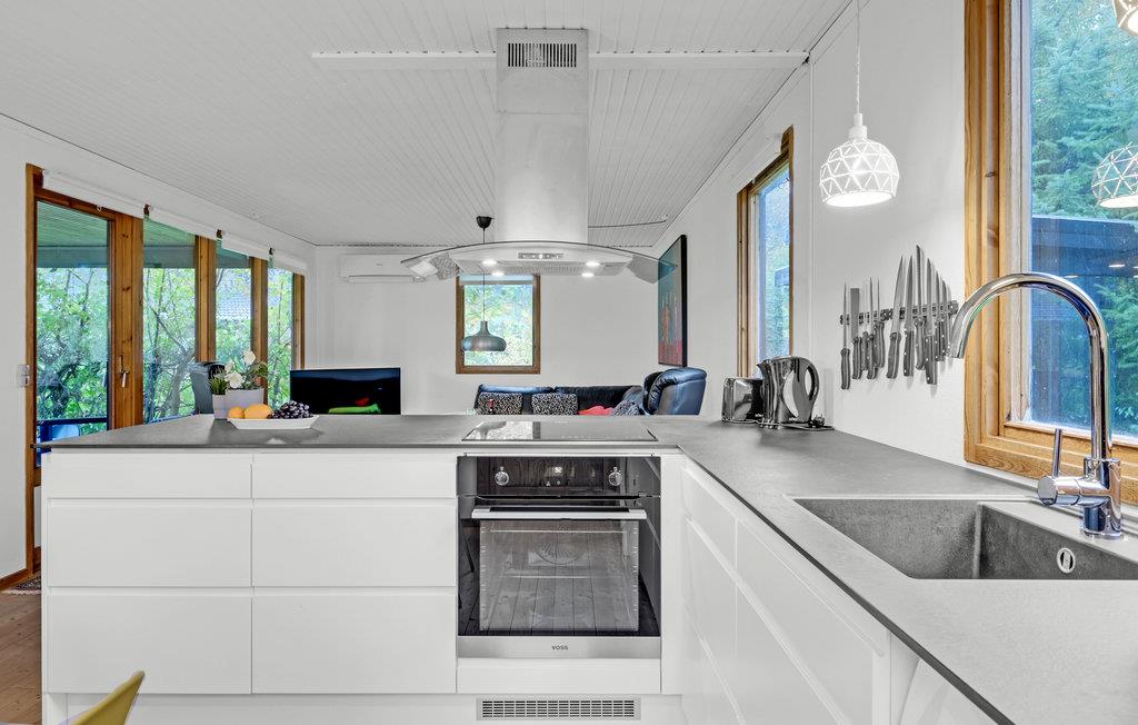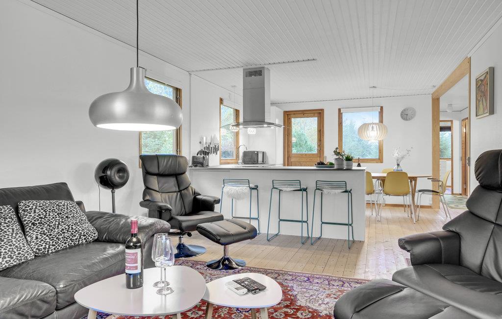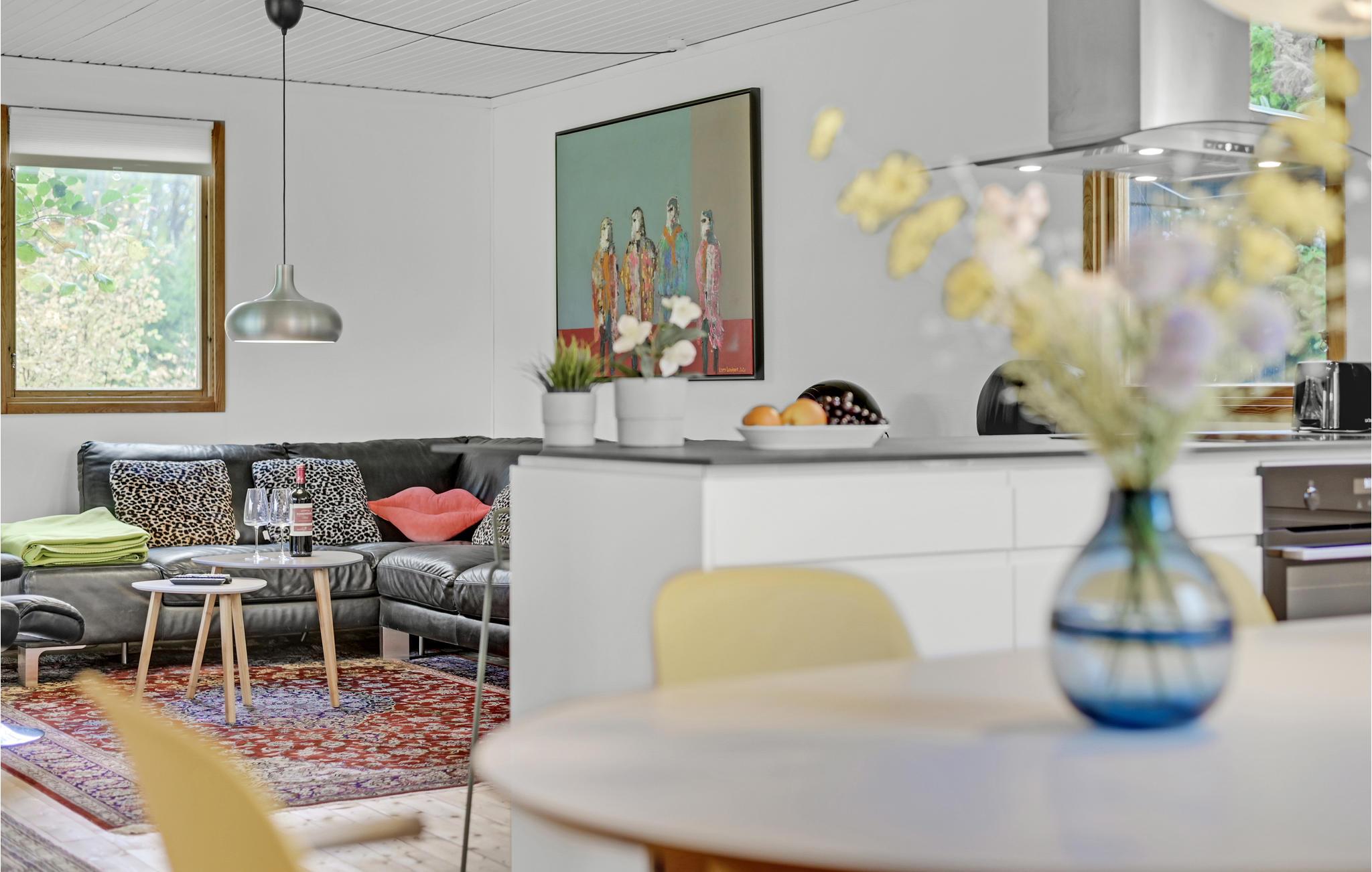Velkommen til dette sommerhus, hvor I kan slappe vidunderligt af både inde og ude. Den skønne opholdsstue med åbent køkken er husets naturlige samlingspunkt og lægger op til masser af hyggestunder. Her kan I sætte jer med en god film, mens I flader ud i de komfortable møbler.