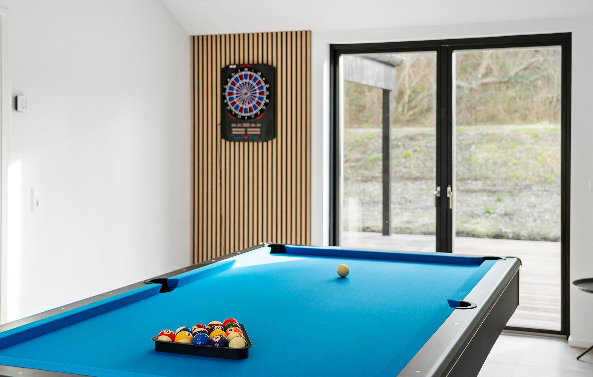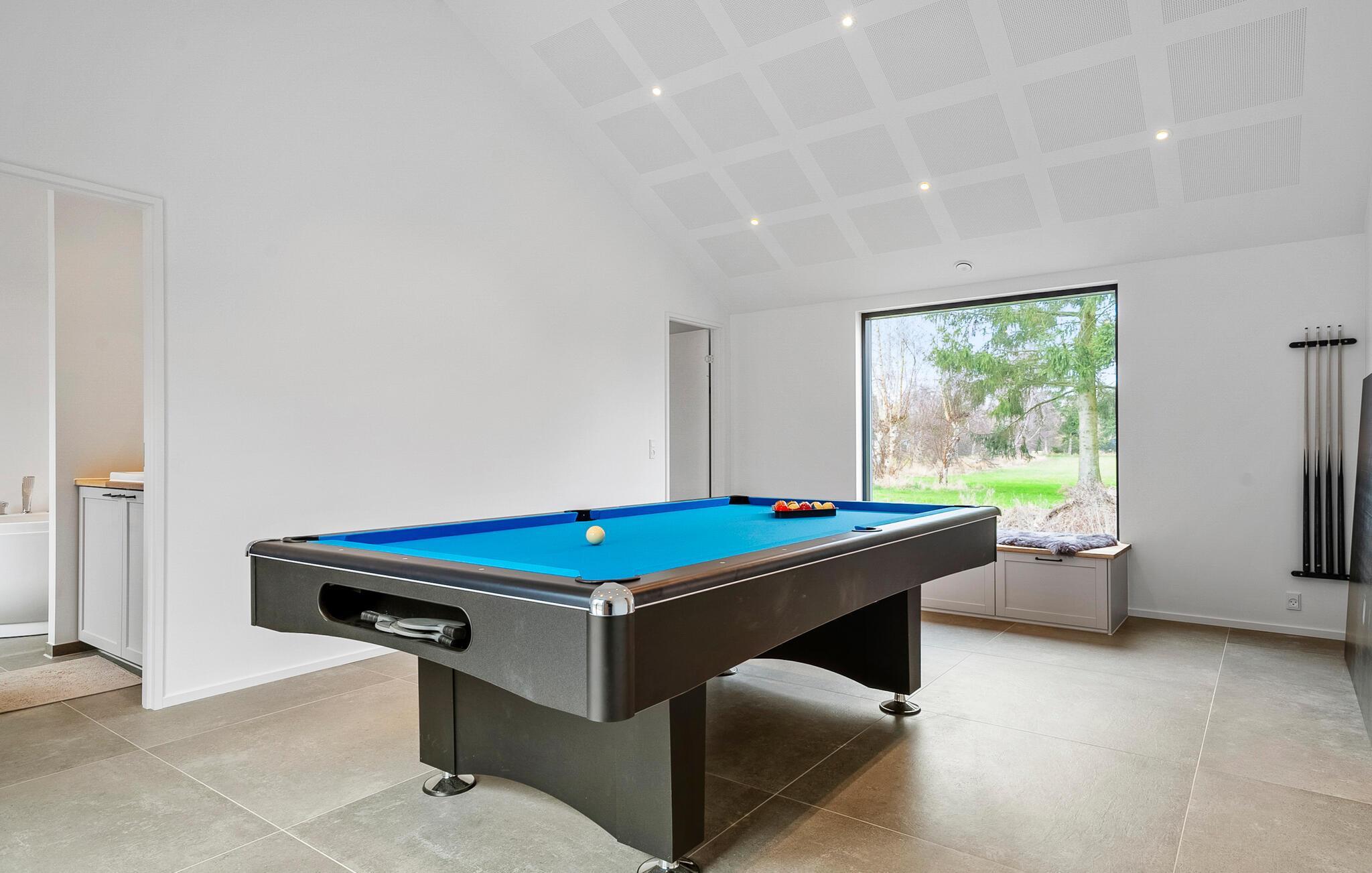 Moderne sommerhus nær Ulvshales sandstrand med spa, poolbord og stor terrasse.