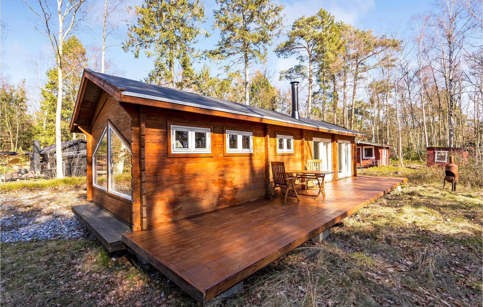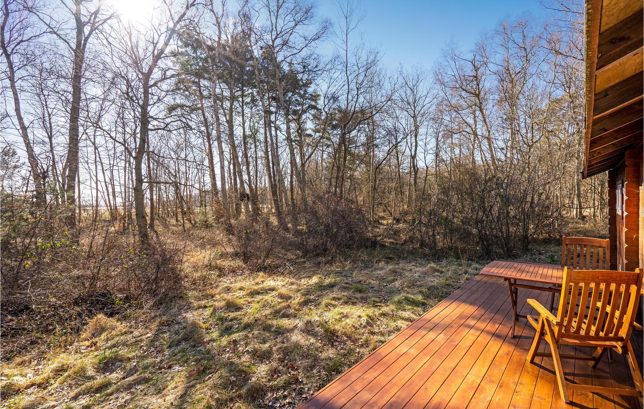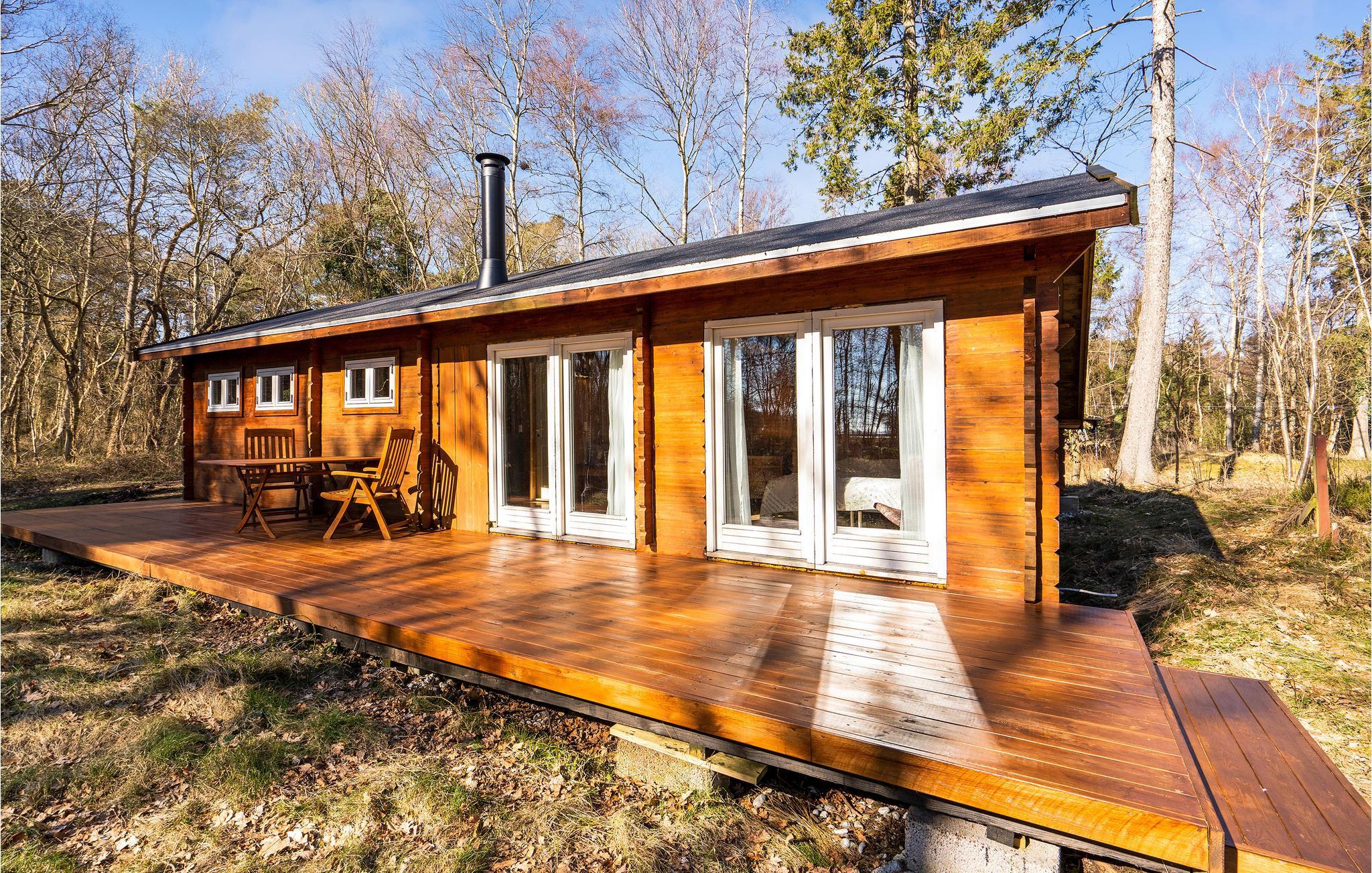 Hyggeligt træhus ved Ulvshale Strand med brændeovn og terrasse i naturskønne omgivelser.