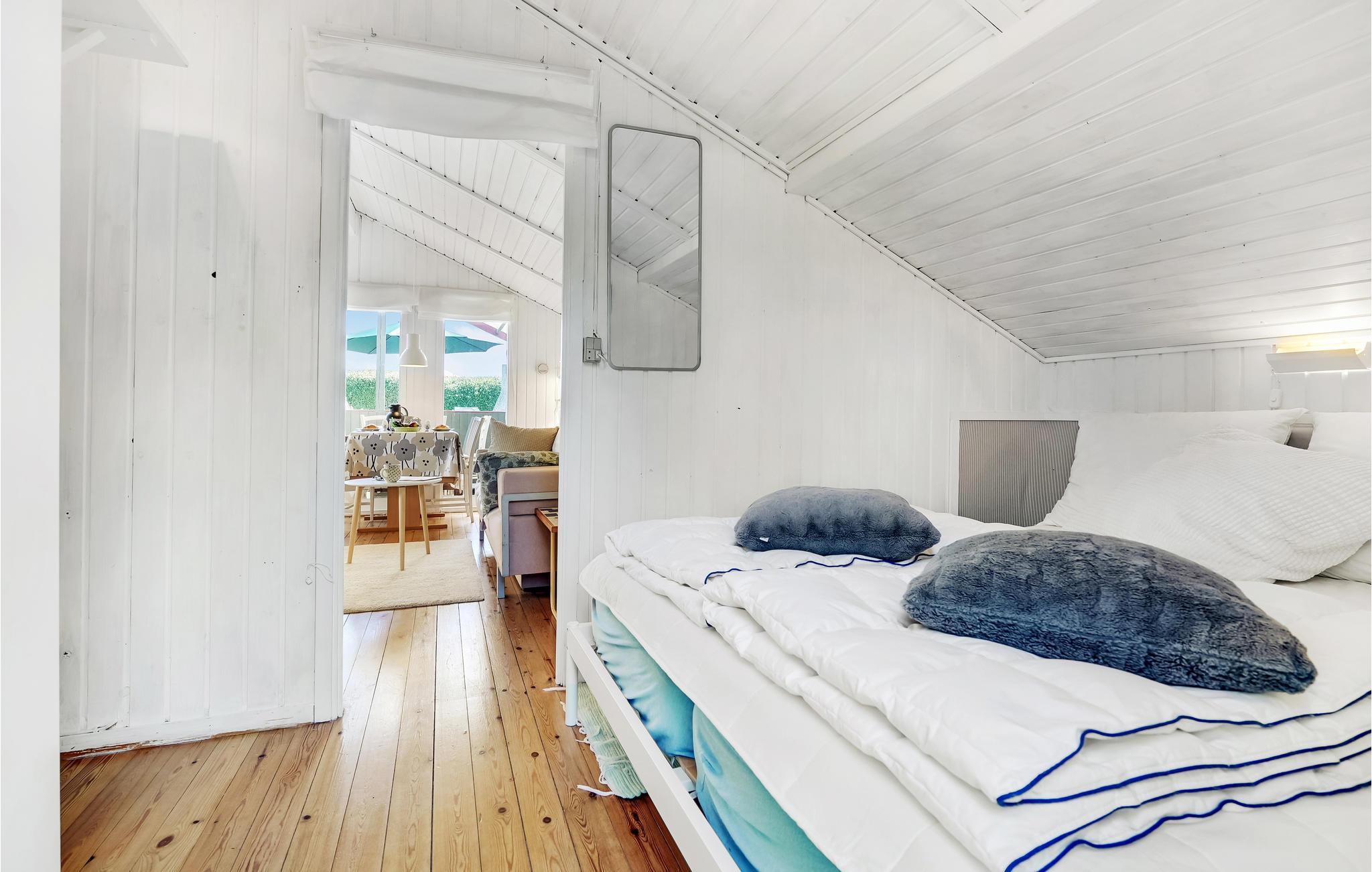 Sommerhuset består af køkken/opholdsstue, et badeværelse og et enkelt soveværelse med dobbeltseng. Huset er derfor ideelt til et par, der ønsker en dejlig og afslappende ferie sammen i naturskønne omgivelser. Der er DAB-radio og Bluetooth-højttaler i huset, så I kan nemt afspille musik og jeres yndlingspodcasts på ferien.