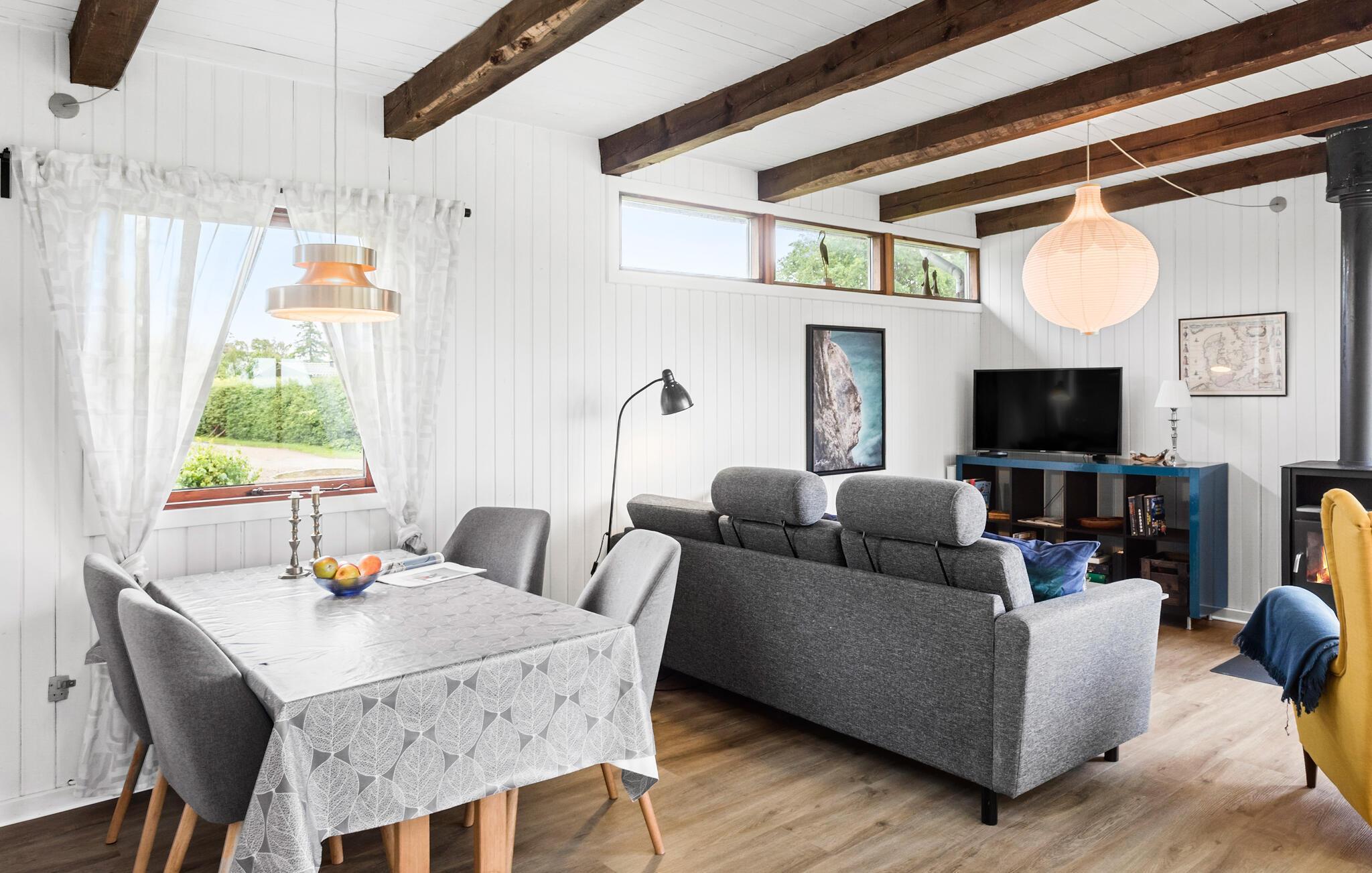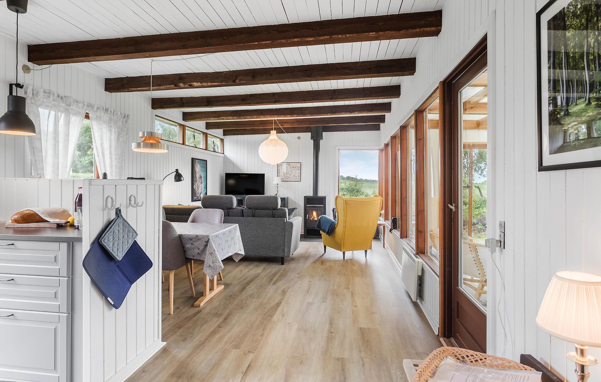Huset byder jer velkommen i en god beliggenhed nær stranden. Lad tankerne vandre i de lyse lokaler, som med deres moderne, komfortable indretning og venlige farver danner den ideelle ramme for jeres afslapning. Den tiltalende opholdsstue er indrettet, så I kan tilbringe hyggelige timer sammen, for eksempel mens I spiser eller sidder sammen om aftenen i den behagelige sofa med flammerne knitrende i brændeovnen. De dekorative træbjælker giver rummet sin særlige charme. Sæt jer ud på terrassen med en kop kaffe, nyd solen og server senere grillede lækkerier for hele familien.