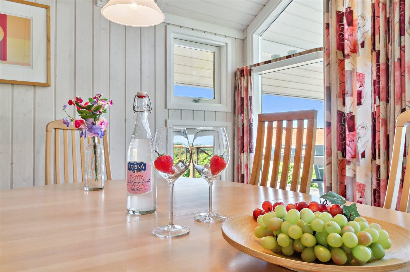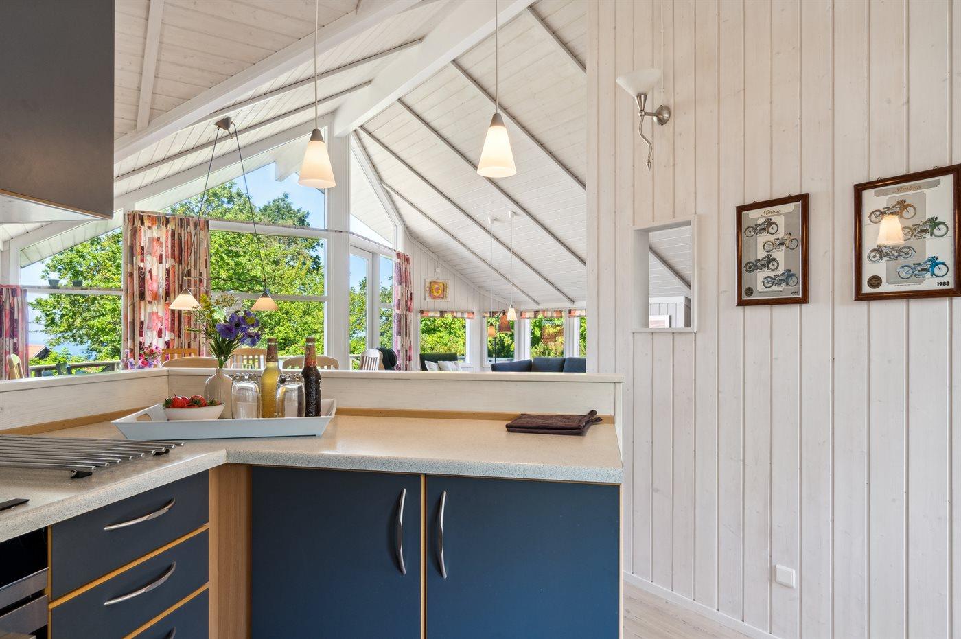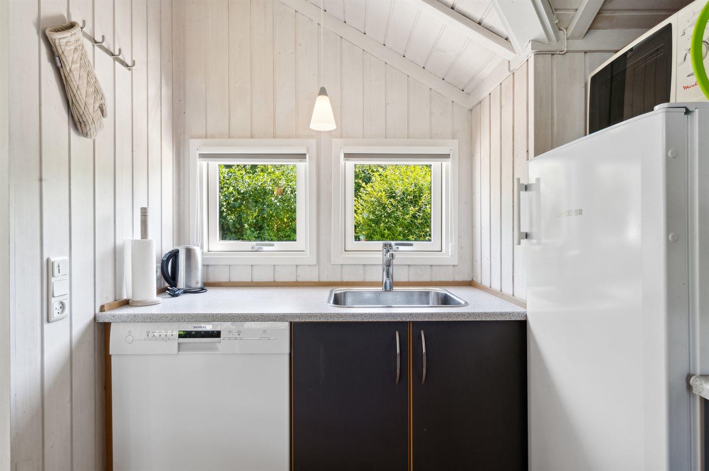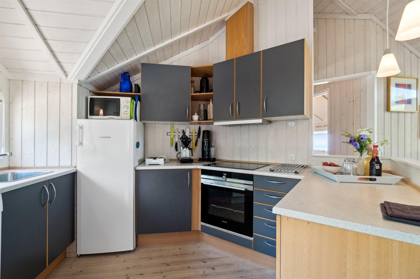 Køkkenet er udstyret med 1 køleskab. Der er 4 keramiske kogeplader, varmluftovn, mikrobølgeovn samt opvaskemaskine.