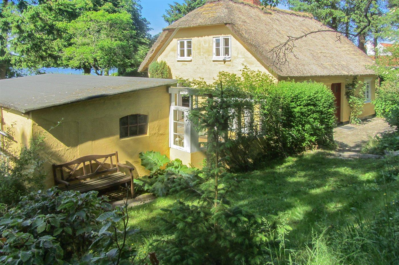 Charmerende, autentisk, ældre sommerhus med stråtag holdt i den oprindelige stil beliggende i første række til vandet med skøn udsigt over fjorden fra såvel hus som grund. Huset ligger tilbagetrukket på en stor delvis lukket grund på en blind vej som går igennem grunden tæt på kysten.