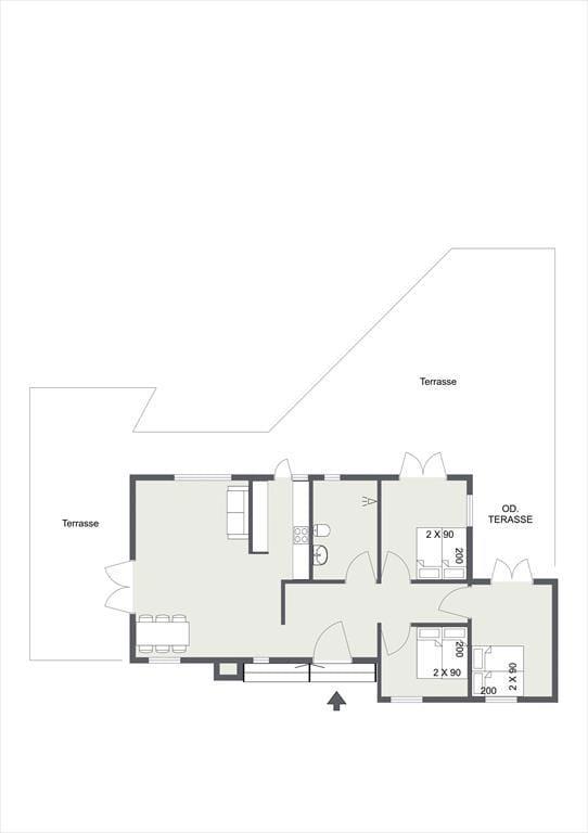 Entré med varmepumpe og adgang til badeværelse med bruser og vaskemaskine. 3 store soveværelser med dobbeltseng, hvoraf 2 har udgang til den store træterrasse. Stor lys stue med opdelt opholds- og spiseafdeling med brændeovn. Køkken i åben forbindelse med stuen, hvorfra der er udgang til terrassen.