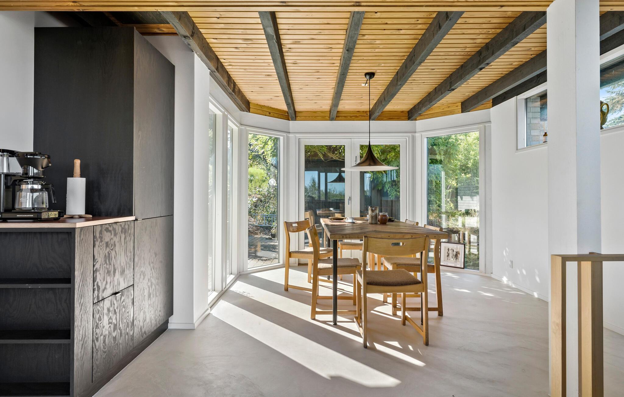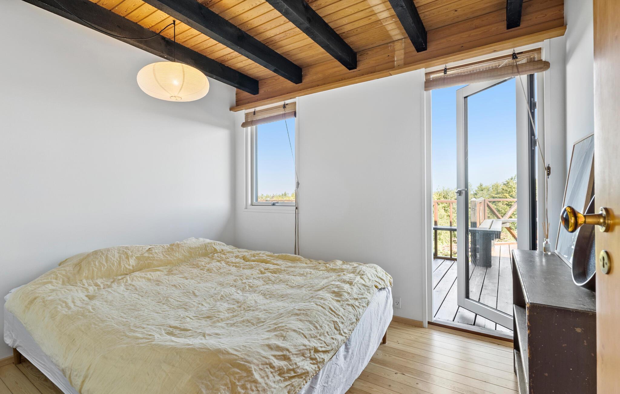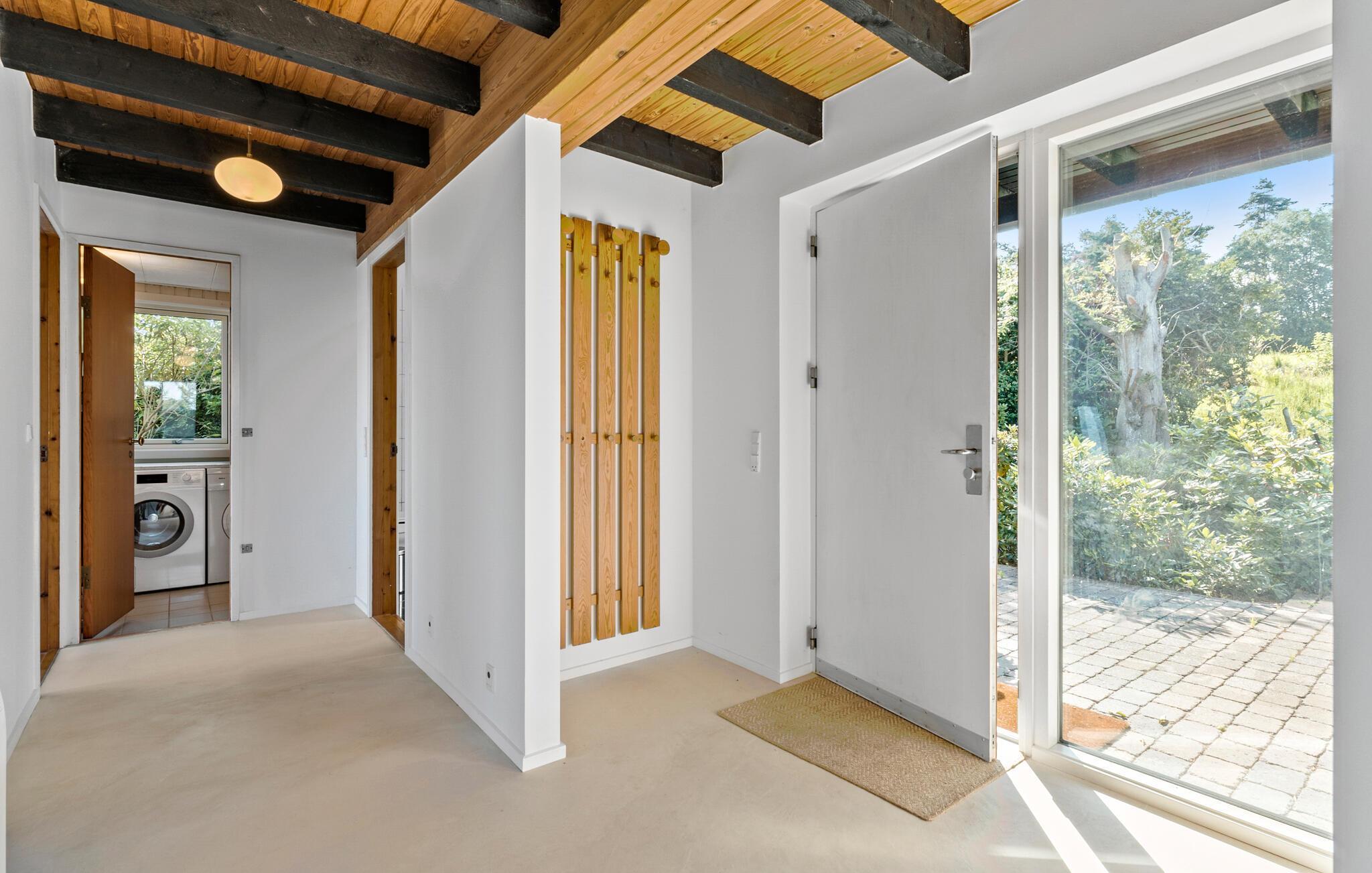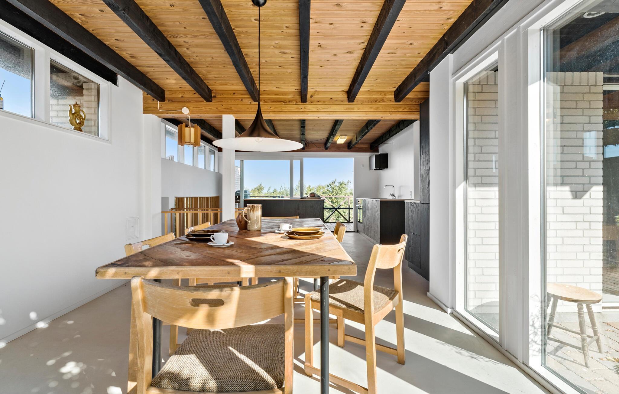 Dette skønne sommerhus ligger på en bakke og I har derfor en vidunderlig udsigt over det omkringliggende landskab og delvis havudsigt over Sejerø Bugt. Indenfor skaber de smukke træbjælker i loftet og cementgulvet en rustik og varm stemning, der passer helt optimalt ind i husets ellers moderne og stilrene udtryk. Der er store vinduespartier flere steder i huset, så naturen bliver nærmest en del af indretningen. Så om I forbereder mad i det åbne køkken, nyder morgenkaffen ved spisebordet eller blot får en stille stund i sofaen, kan I kigge ud på den smukke natur I er omgivet af.