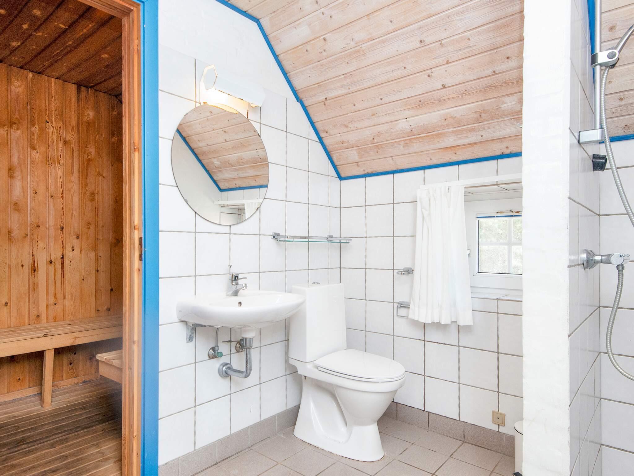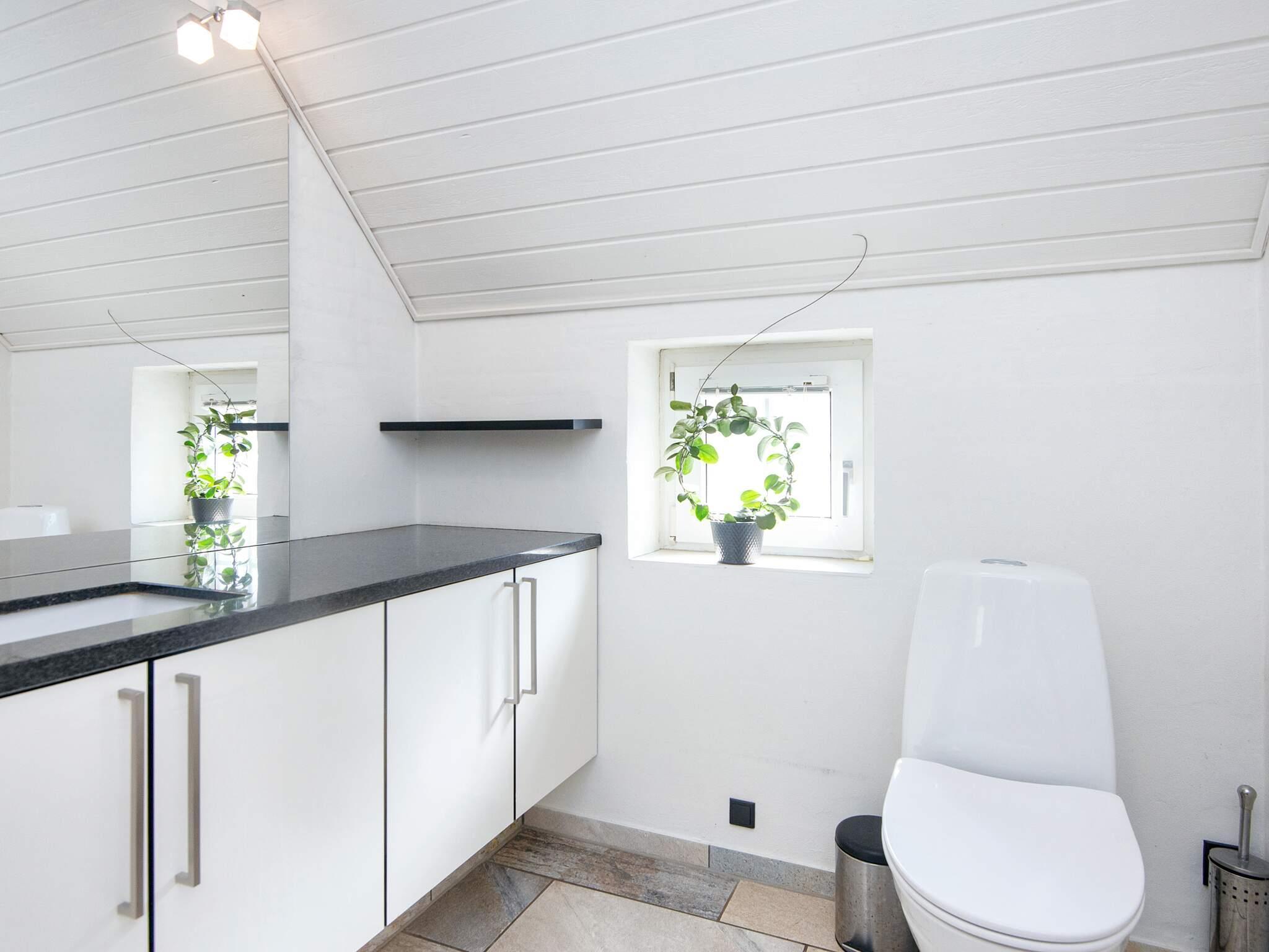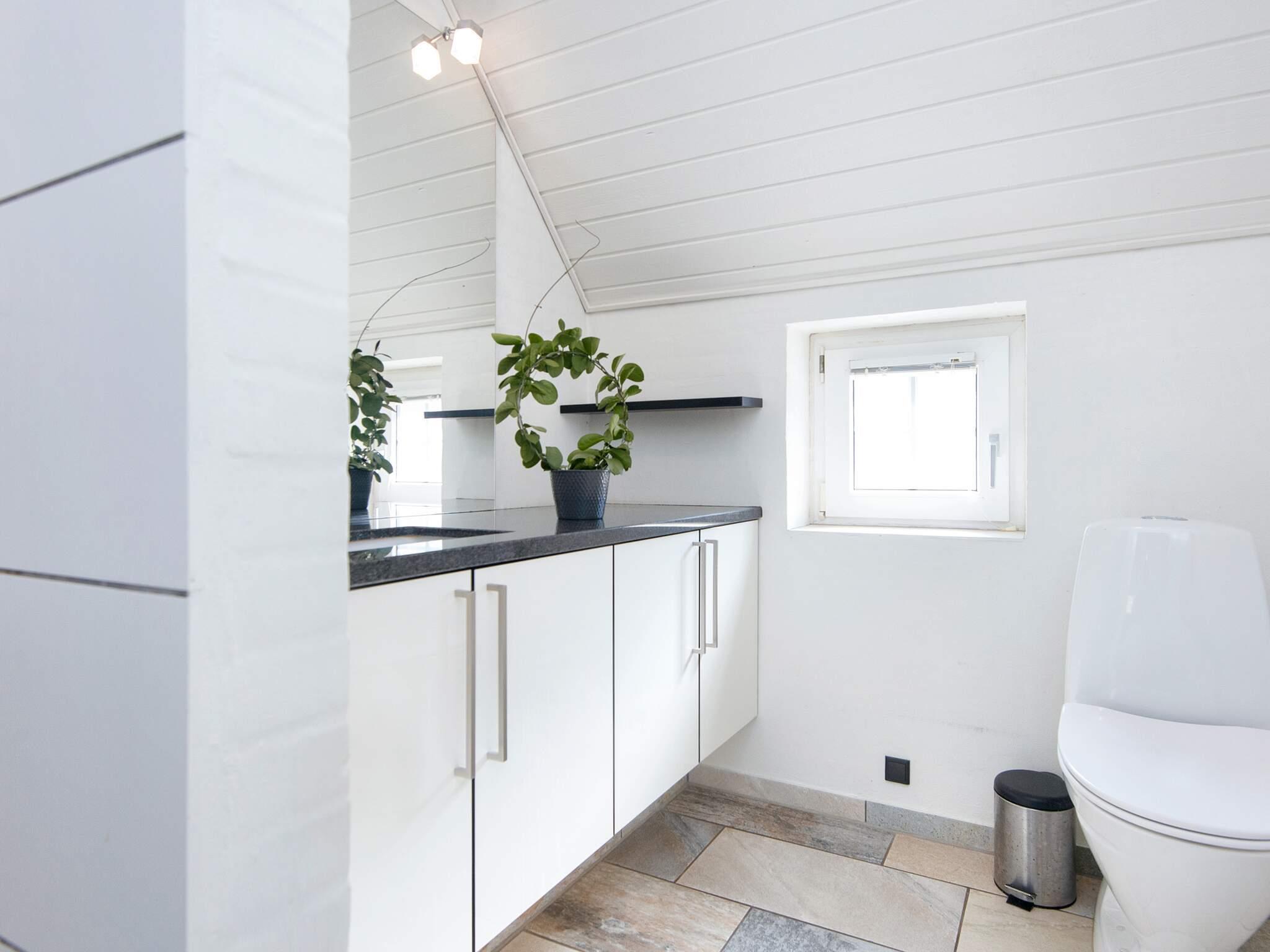 Der er 3 badeværelser med toilet, håndvask og bruser i huset, hvoraf det ene badeværelse befinder sig i poolafdelingen.