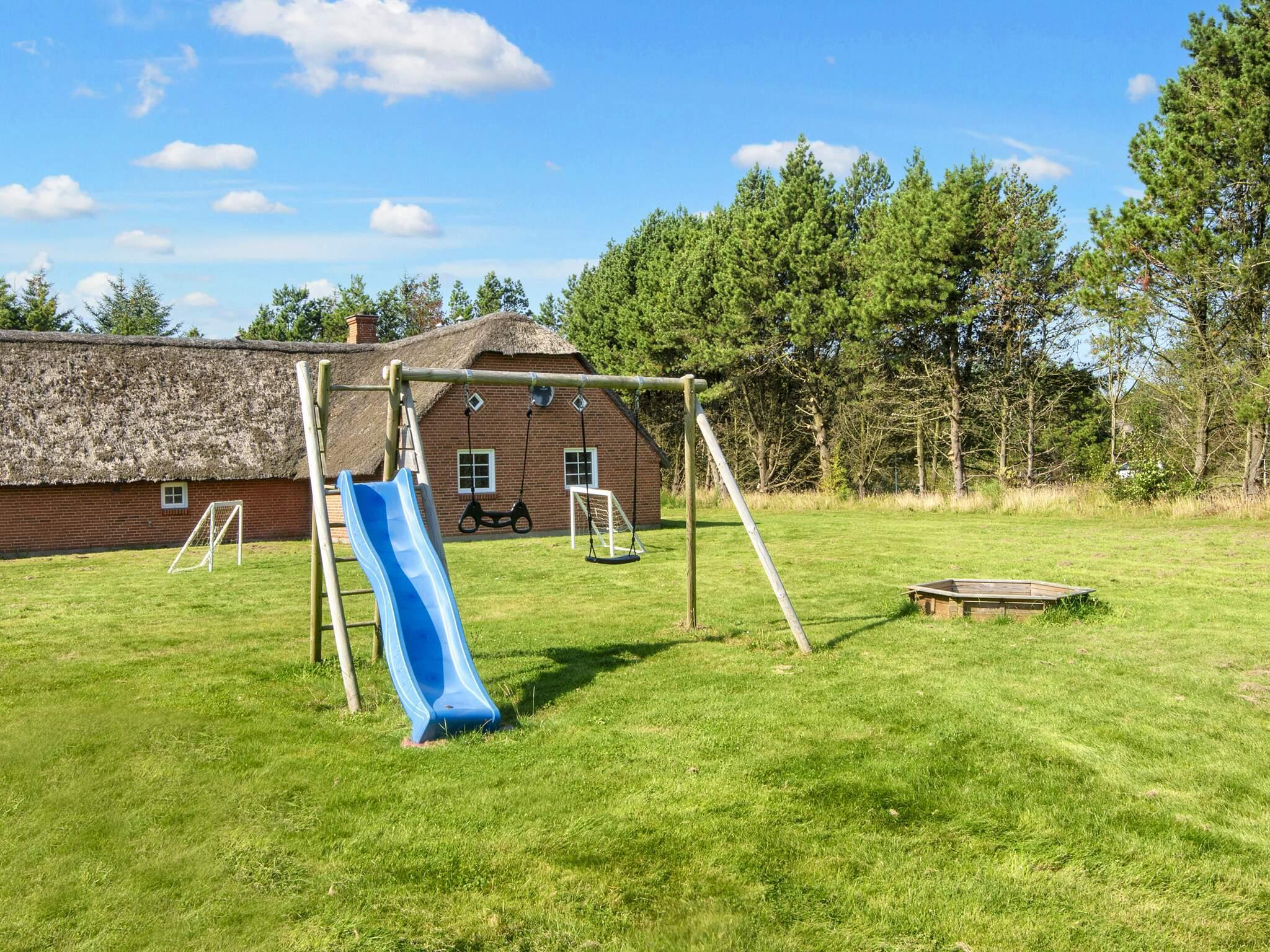 Med direkte udgang fra huset er der en åben terrasse med havemøbler og grill til rådighed. Til børnene er der hoppepude, fodboldmål, gynge og sandkasse.