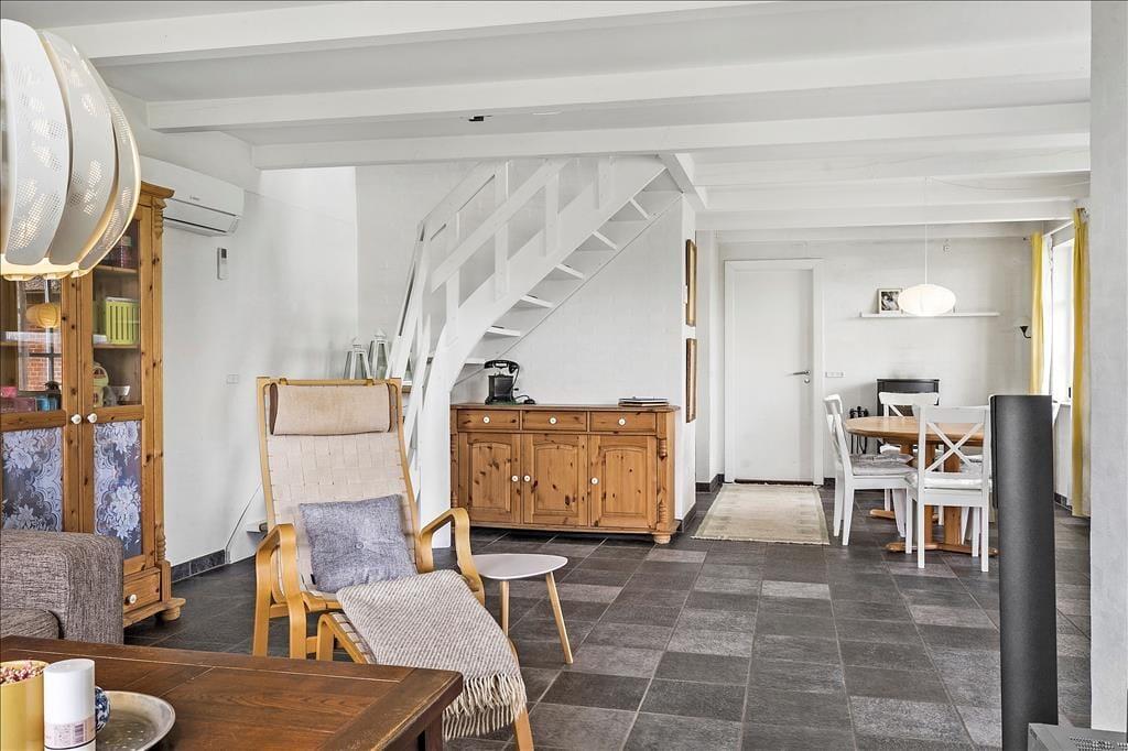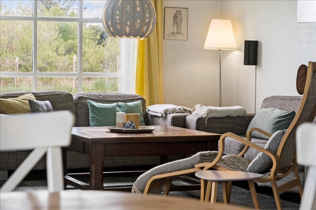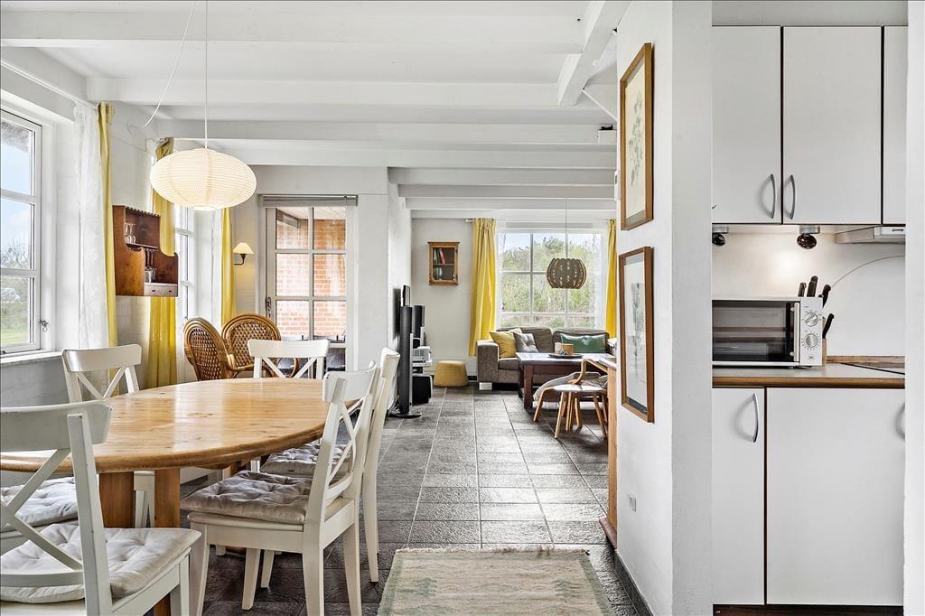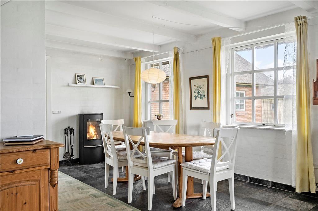 Gule detaljer pryder huset og giver det en herlig sommerlig stemning hvor I kan nyde hinandens selskab i ro og mag. Det lækre køkken ligger i åben forbindelse med både opholdsstue og spiseafdeling så her kan I rigtigt nyde hinandens selskab på trods af at I laver forskellige ting. Når I skal nyde aftensmaden så husk at tænde op for den fantastiske brændeovn og nyd dens dejlige varme og hyggelige knitren der spreder sig imens I nyder maden og hinandens selskab