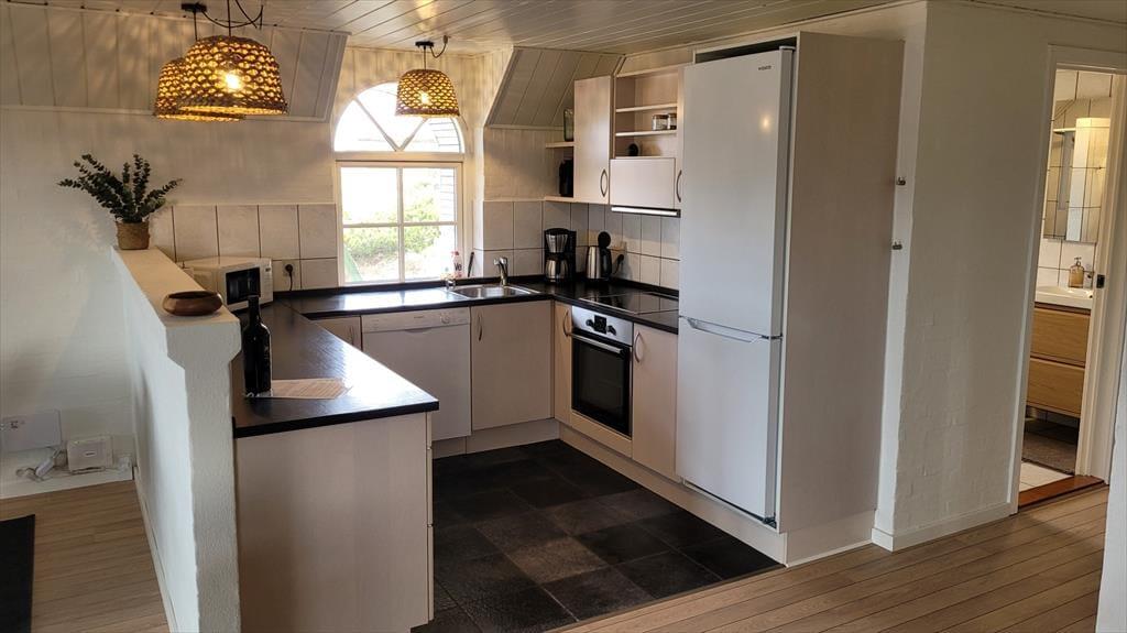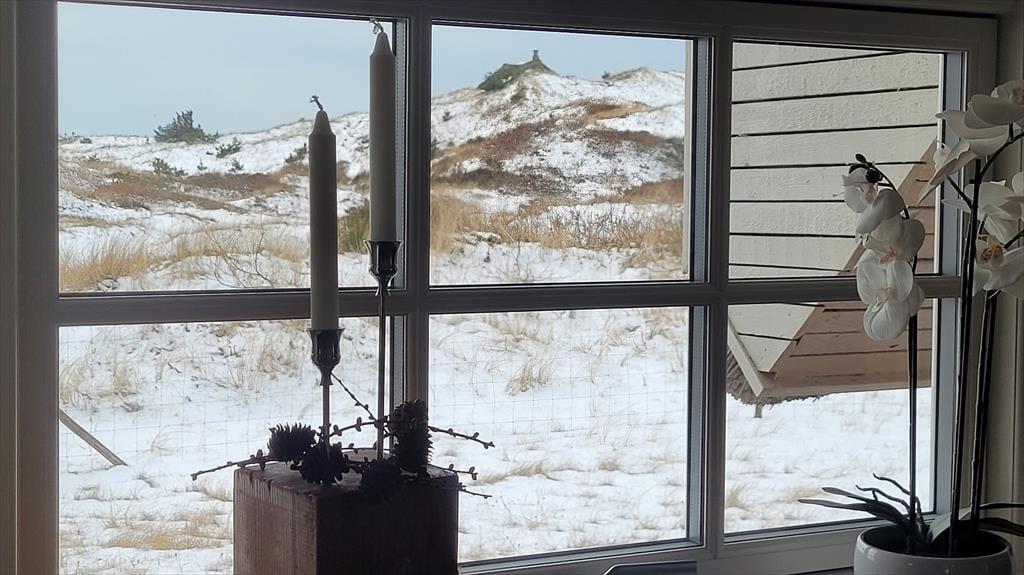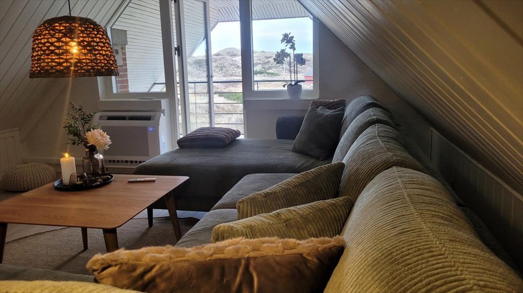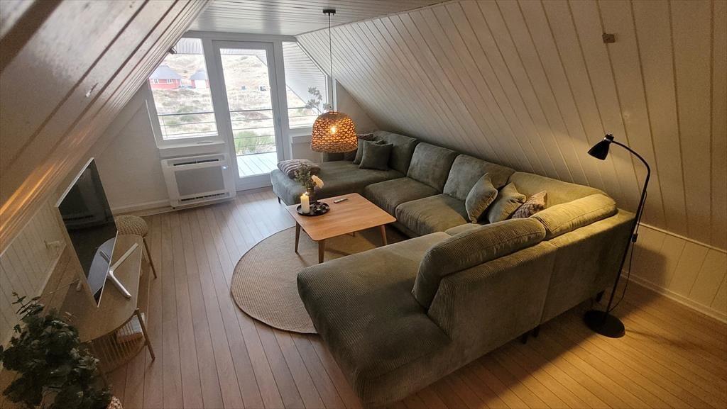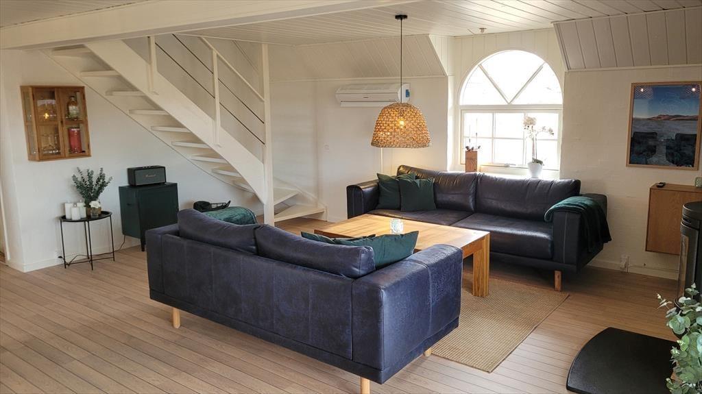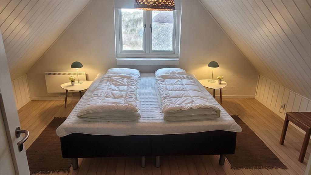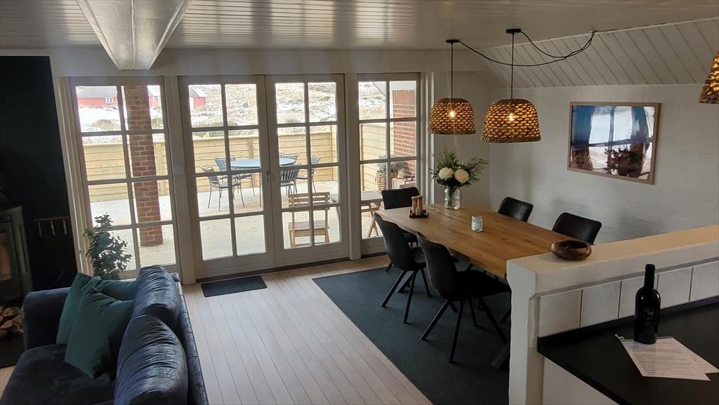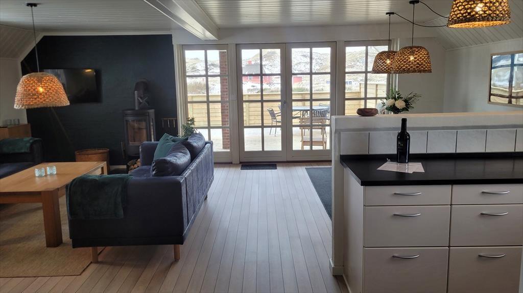 Det store vinduesparti inviterer naturen helt indenfor og lader lyset strømme ind, mens udsigten over klitter og marehalm – så langt øjet rækker – fuldender oplevelsen af idyl og vild natur. Feriehuset er indrettet med sjæl og personlig indretning, som giver en varm og hjemlig atmosfære. Sæt dig godt til rette i sofaen, mærk brændeovnens knitren og lad roen sænke sig. Her er plads til nærvær, samvær og til at tage en tiltrængt pause fra hverdagens stress. Efter en frisk tur ved havet kan I forkæle jer selv i husets spabad og runde dagen af i fuldendt velvære.