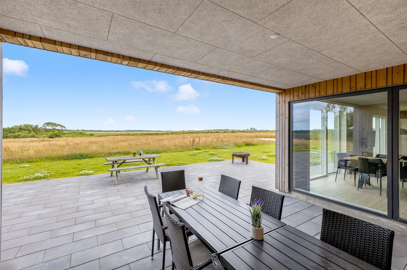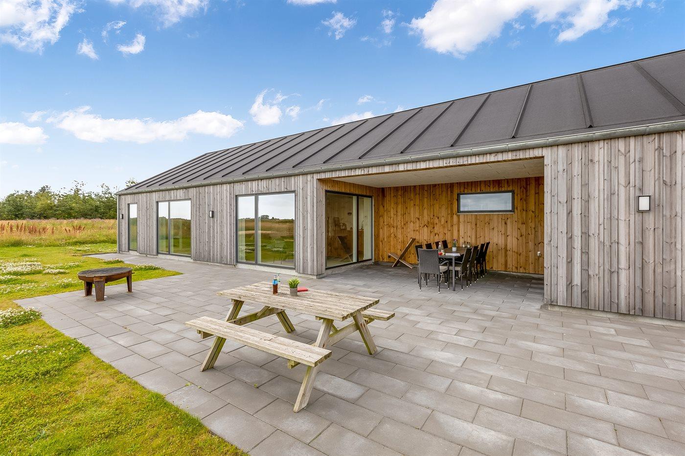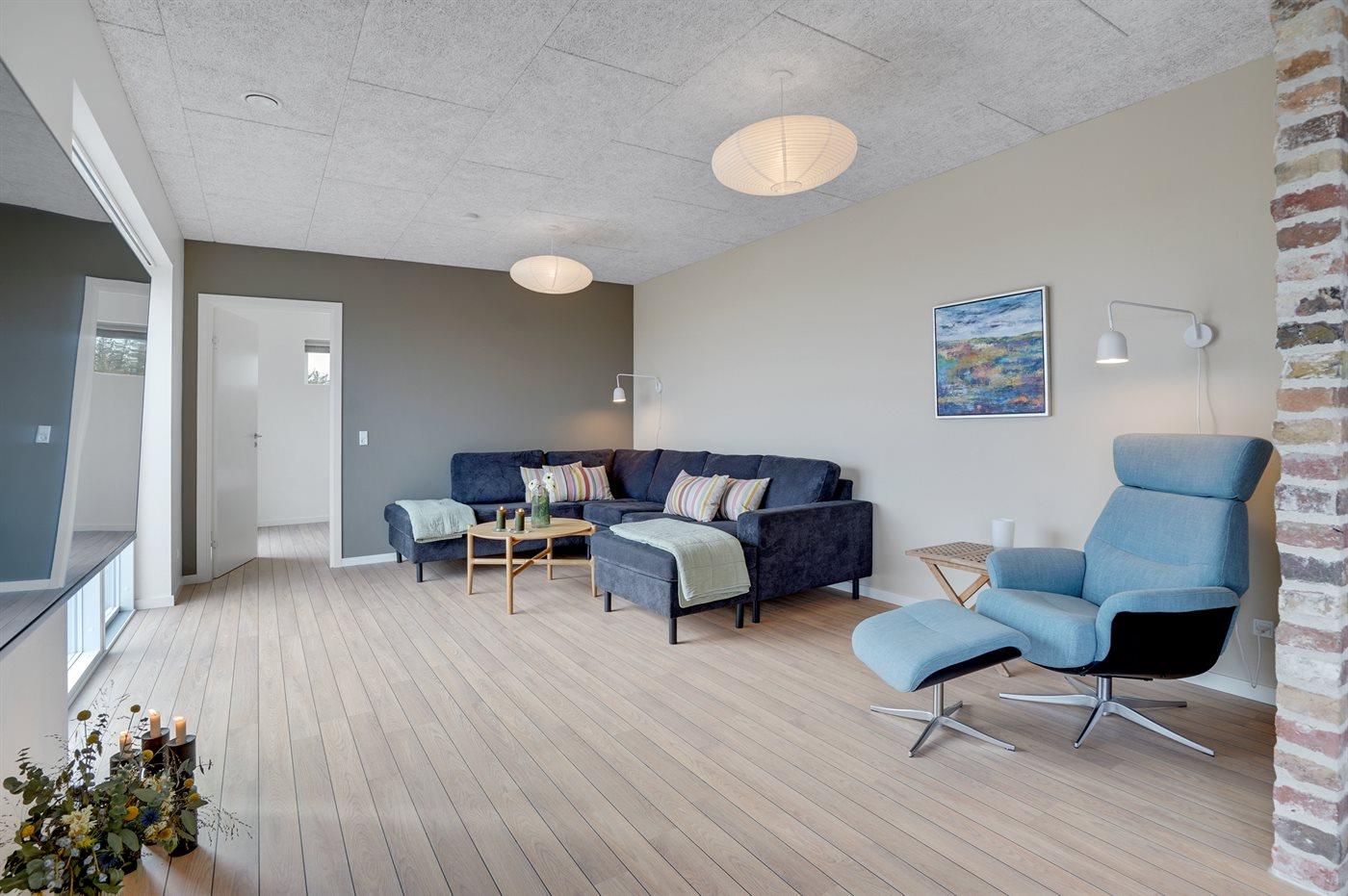 Flot sommerhus i Vedersø Klit med aktivitetsrum, store terrasser og naturgrund, perfekt til familieferie og afslapning.