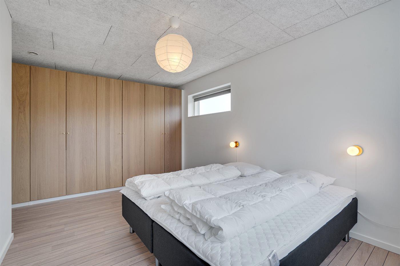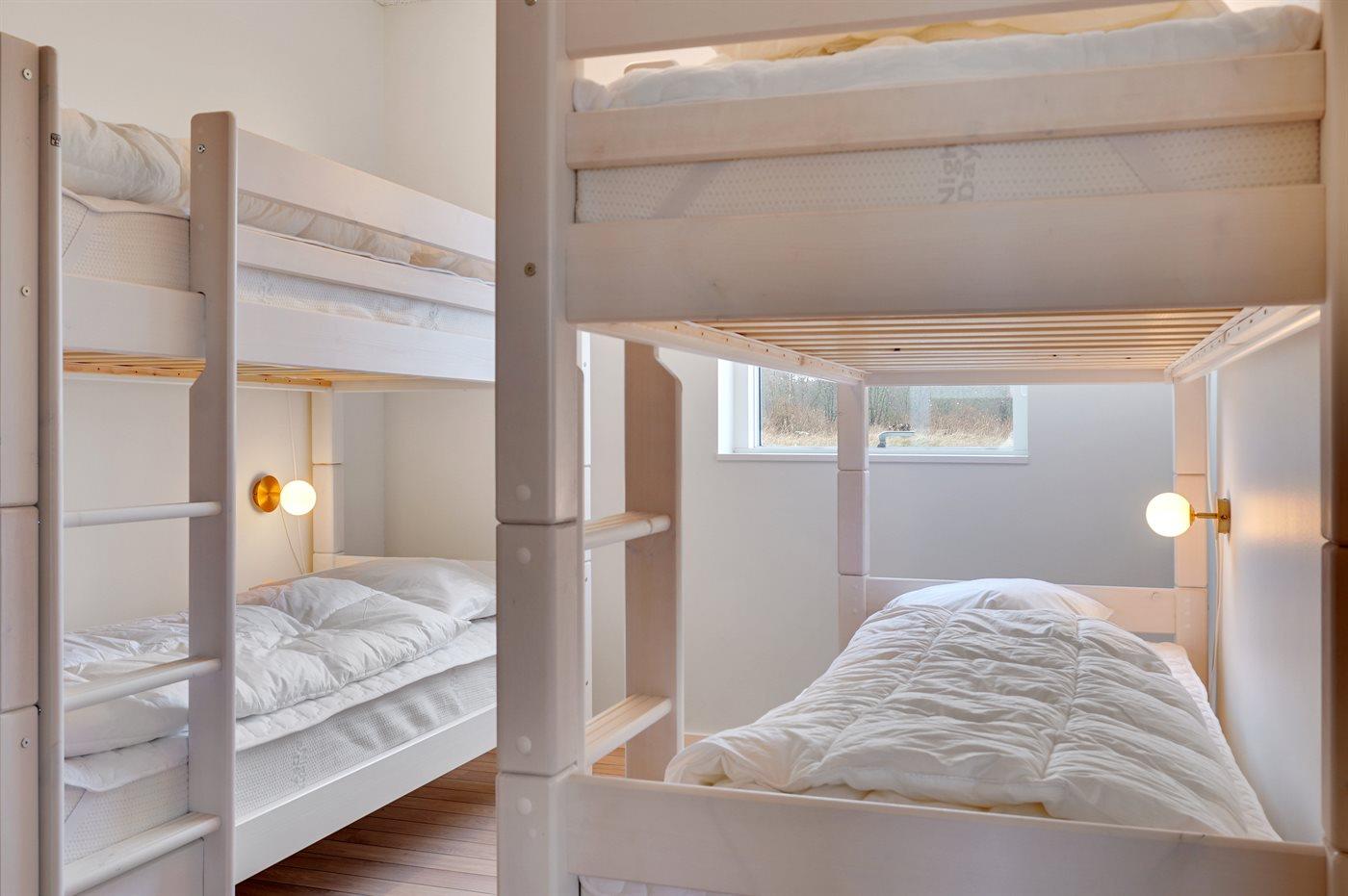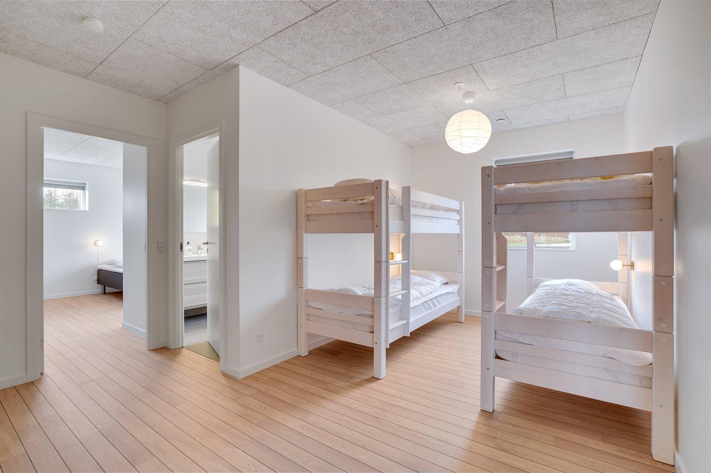 Der er i alt 5 soveværelser. Sovepladserne fordeler sig på: 8 sovepladser i dobbeltsenge. 4 sovepladser i køjesenge. Derudover er der 1 stk. barneseng.