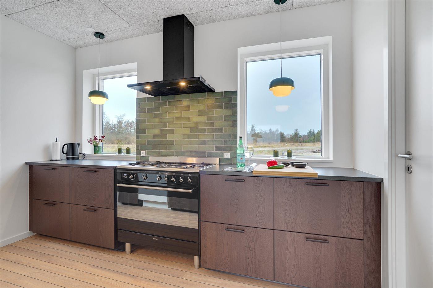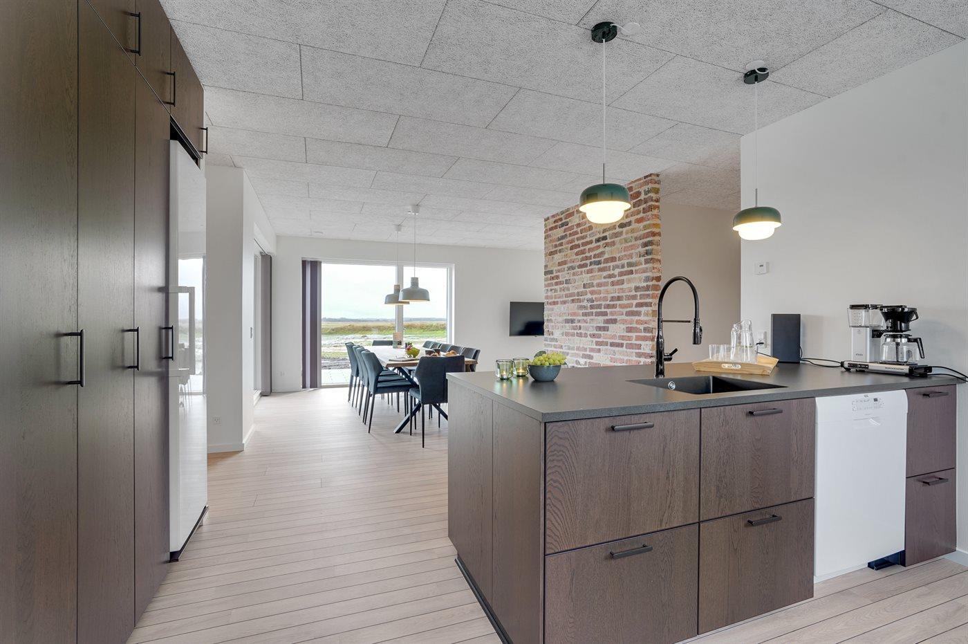Køkkenet er udstyret med 1 køleskab. Der er 4 keramiske kogeplader, varmluftovn, mikrobølgeovn samt opvaskemaskine.