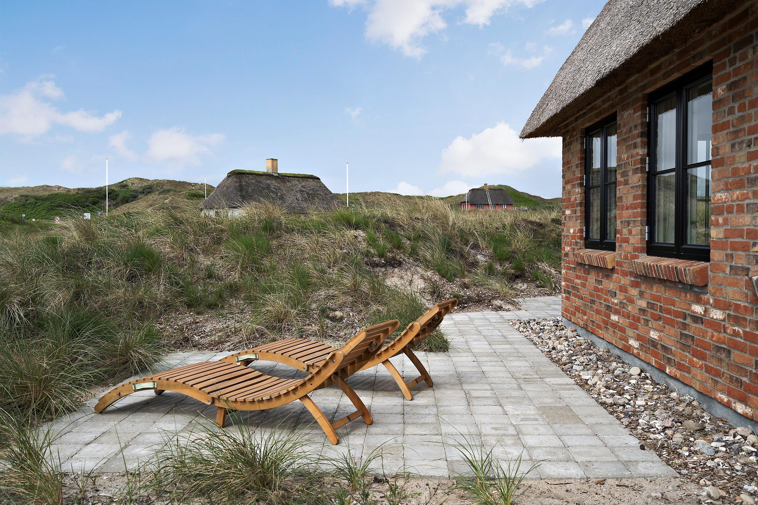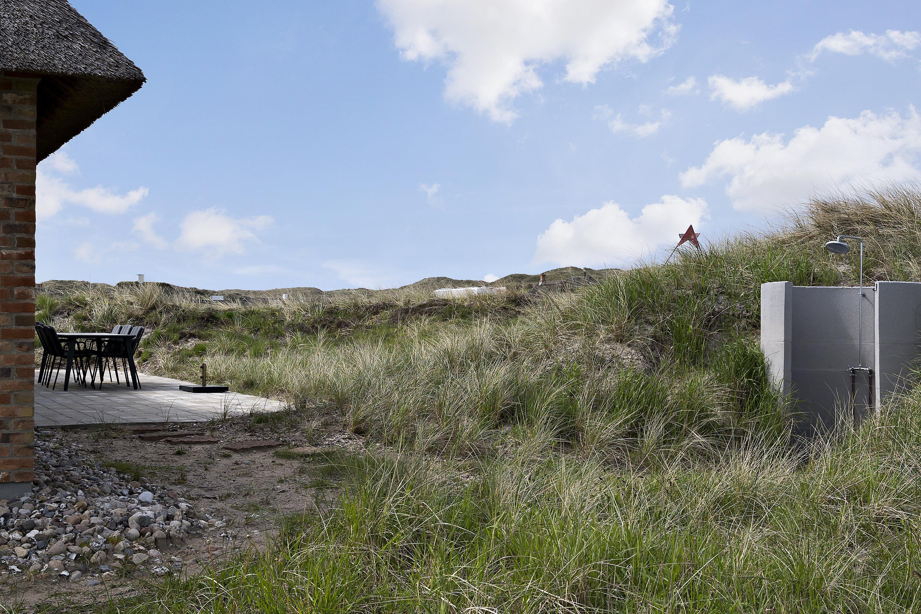 Udenfor er der gode terrasser mod syd og vest med udendørs brus med varmt vand, der kan bruges efter en badetur ved havet. Et feriehus med mange velovervejede detaljer, på en af de bedste grunde på det ”gamle” Vedersø Klit.