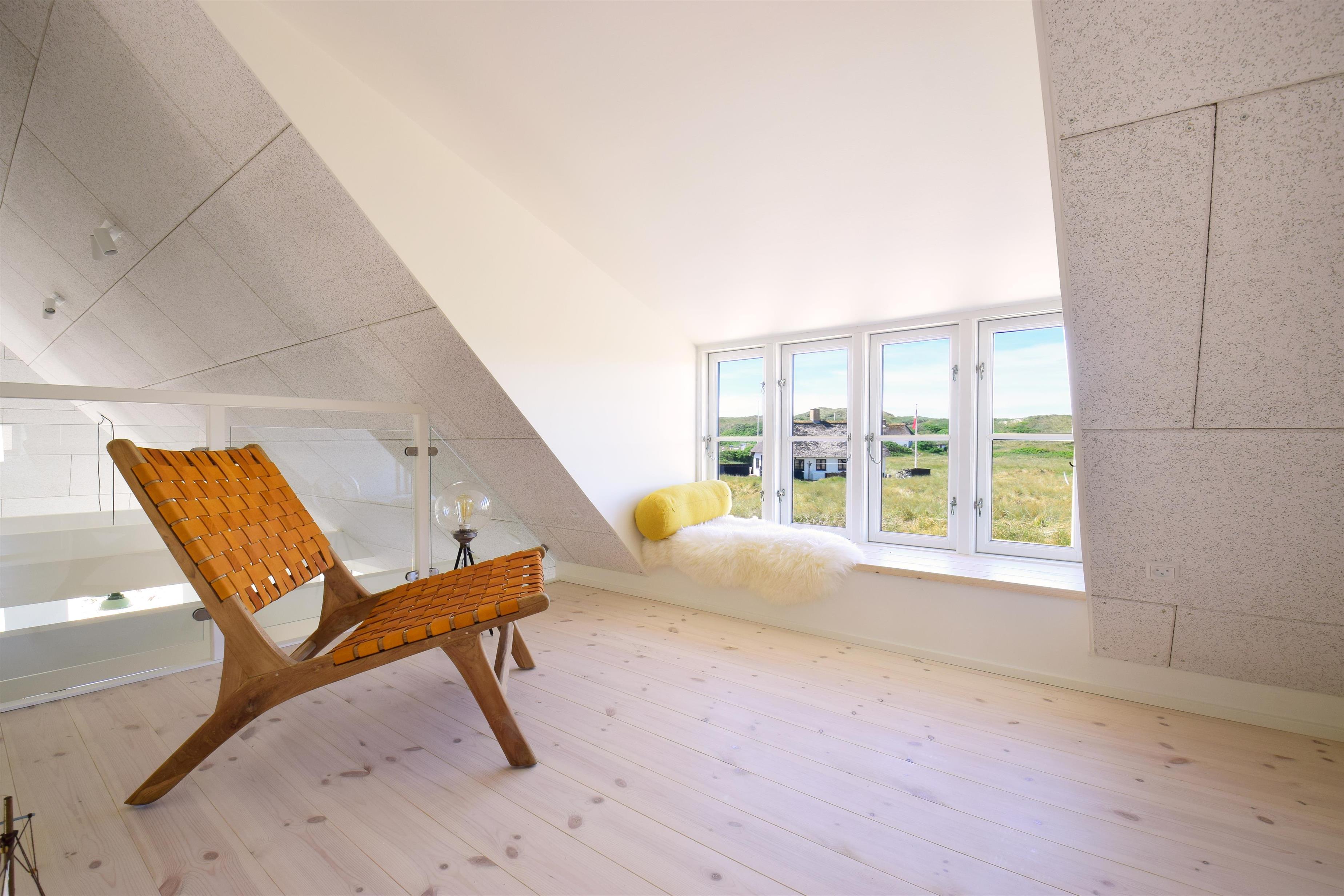 Indretning: Stor lys entre med trappe til 1. sal samt vaskemaskine og tørretumbler. I stueplan der et stort badeværelse med dobbelt bruseniche, sauna samt badekar med udsigt til klitterne. Stort soveværelset (1) med dobbeltseng (180 cm bred), hvor vinduer åbner op for syd, vest og nord så det næsten giver en 180 grader udsigt til klitterne. Derudover rummer værelset et skrivebord med skærm; her kan du sidde med udsigt til Sømærket. Køkkenet er af høj kvalitet og veludstyret, og i åben forbindelse med stuen. Mod vest mellem det store soveværelse og køkkenet er en lille overdækket terrasse, der giver mulighed for at sidde ud i ly for blæst og regn. Husets stue er lys med mange vinduer mod øst, syd og vest så udsigten til de naturskabte klitter og det ikoniske sømærke kan nydes både fra spiseplads og sofa.