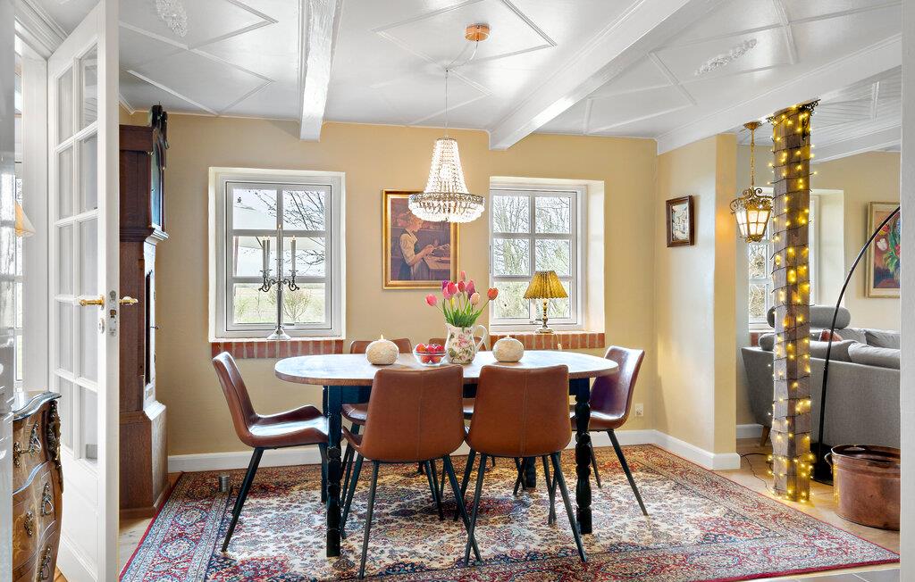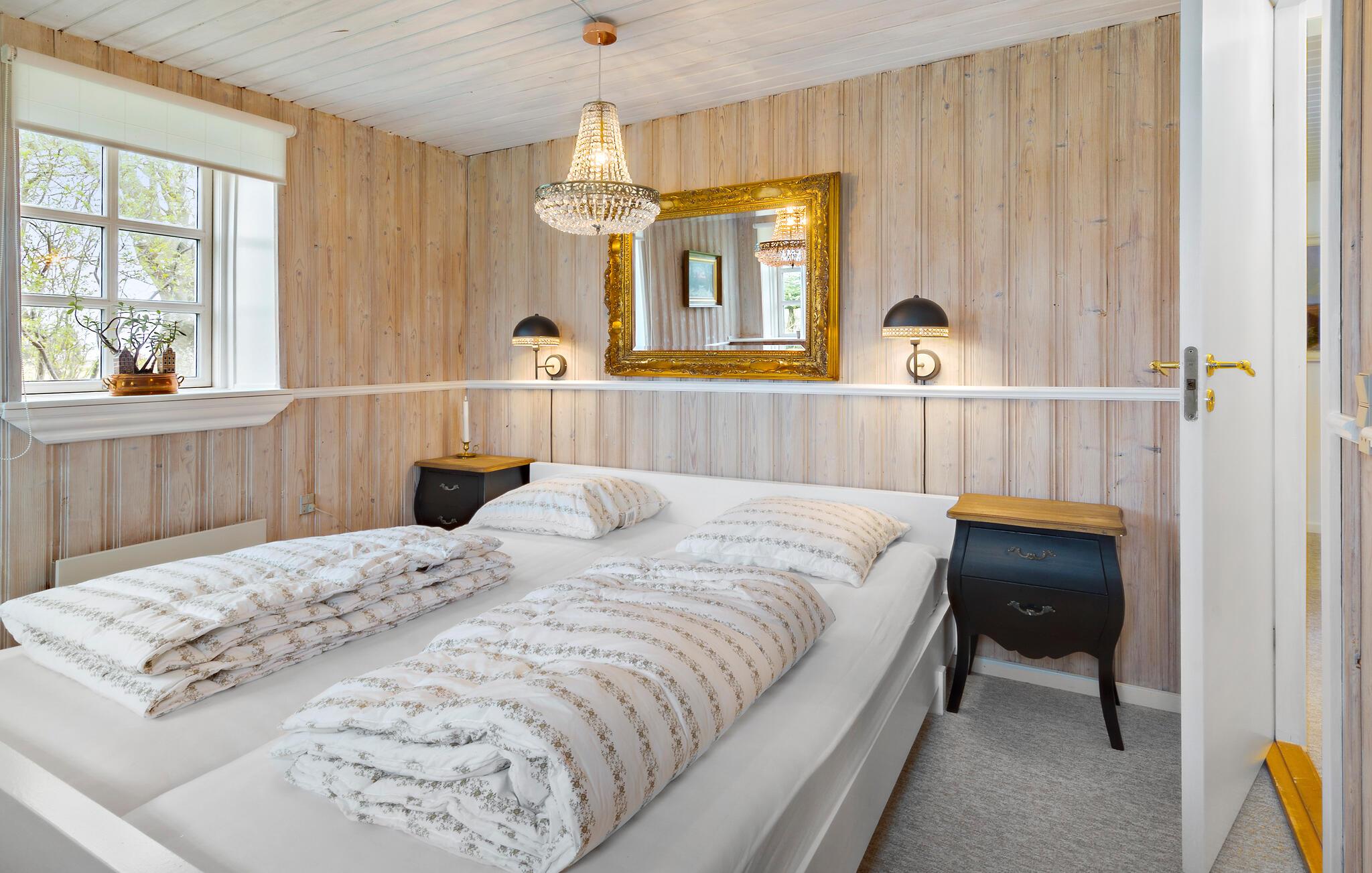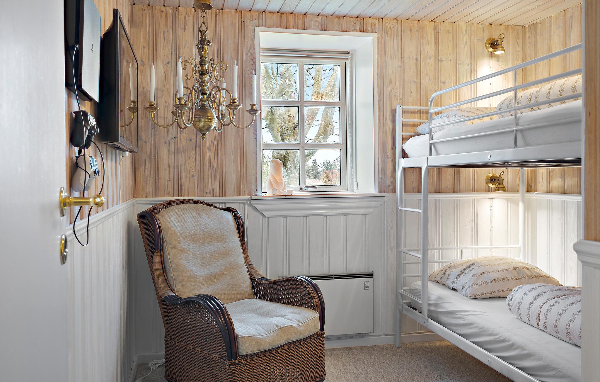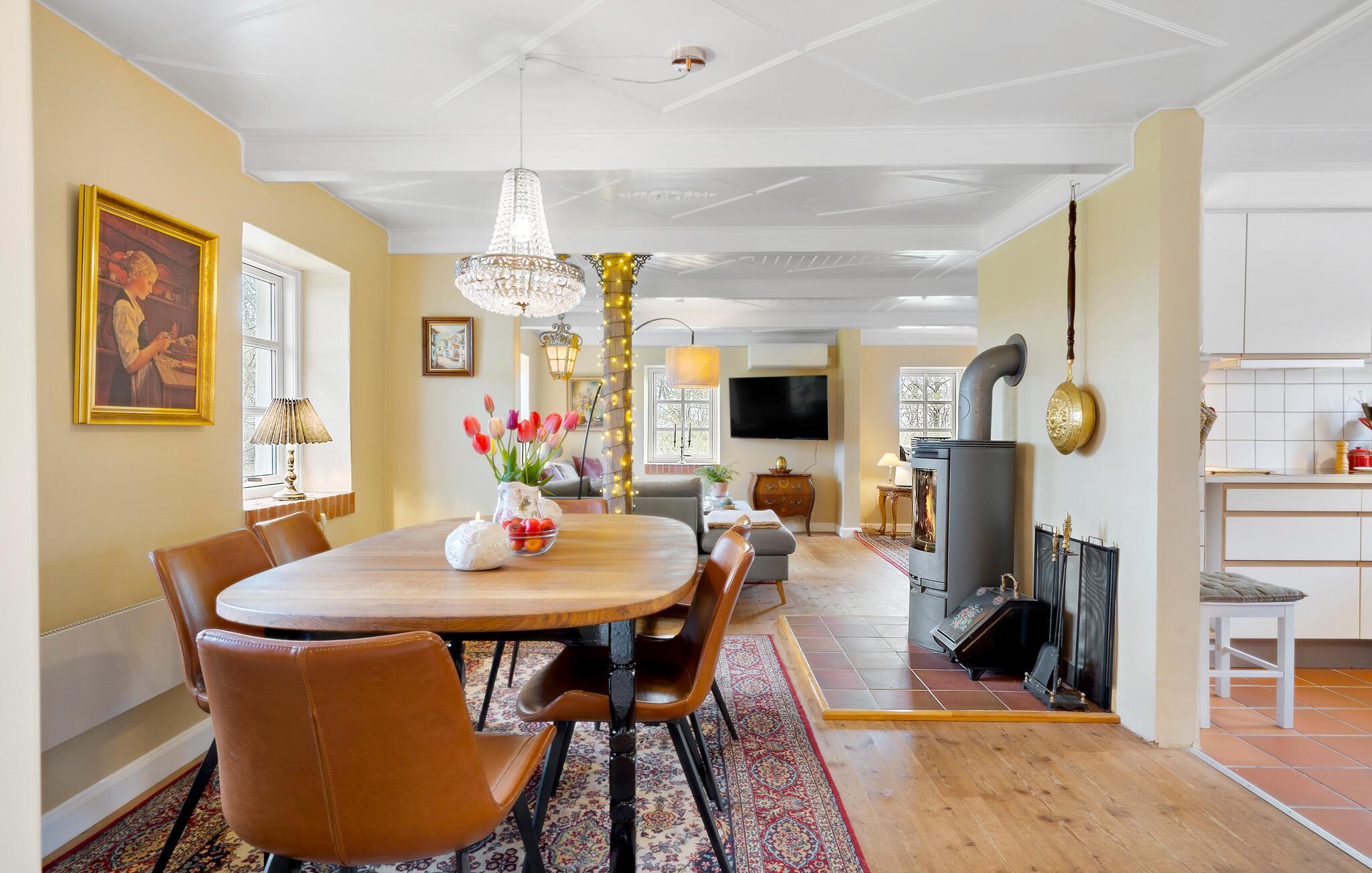 Velkommen til dette dejlige hus, der ligger på en dejlig, ugeneret grund uden for Vedersø, og som med sine mange kvadratmeter danner basen om et komfortabelt ophold med den lidt større familie. Huset er flot indrettet med et behageligt møblement, varme farver og flotte hvide trælofter, der giver rummene et lyst og luftigt udtryk. På de lidt køligere dage kan I tænde op i brændeovnen og nyde dens blide varme, mens kokkene kræser om livretterne i køkkenet og andre flader ud i stuen. Efter aftensmaden kan I snuppe et spil kort eller rykke over i stuen med snacks og en god film på tv'et, mens I lægger planer for den kommende dag.