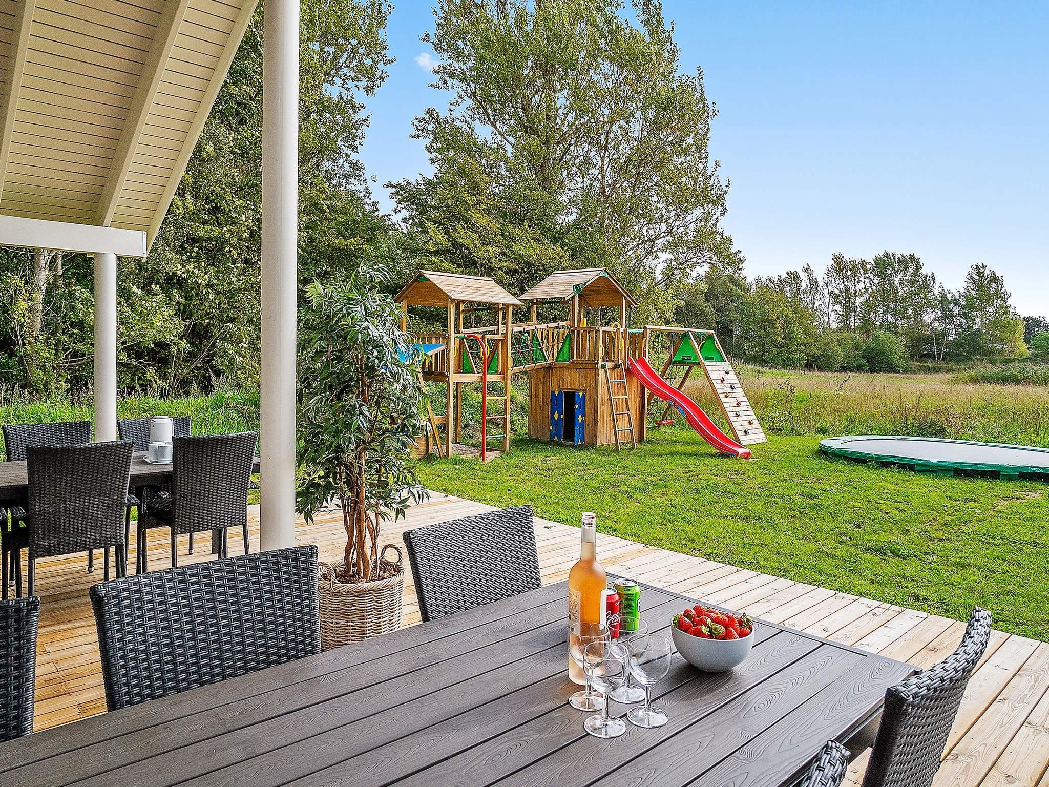 Udendørs er der sandkasse, gynger og stort legetårn med masser af plads til de mindstes fornøjelser. Der er stor, åben solterrasse og overdækket terrasse - perfekt til en hyggelig grillaften med familie og venner. Der er også trampolin (brug af denne sker på eget ansvar/forsikring).