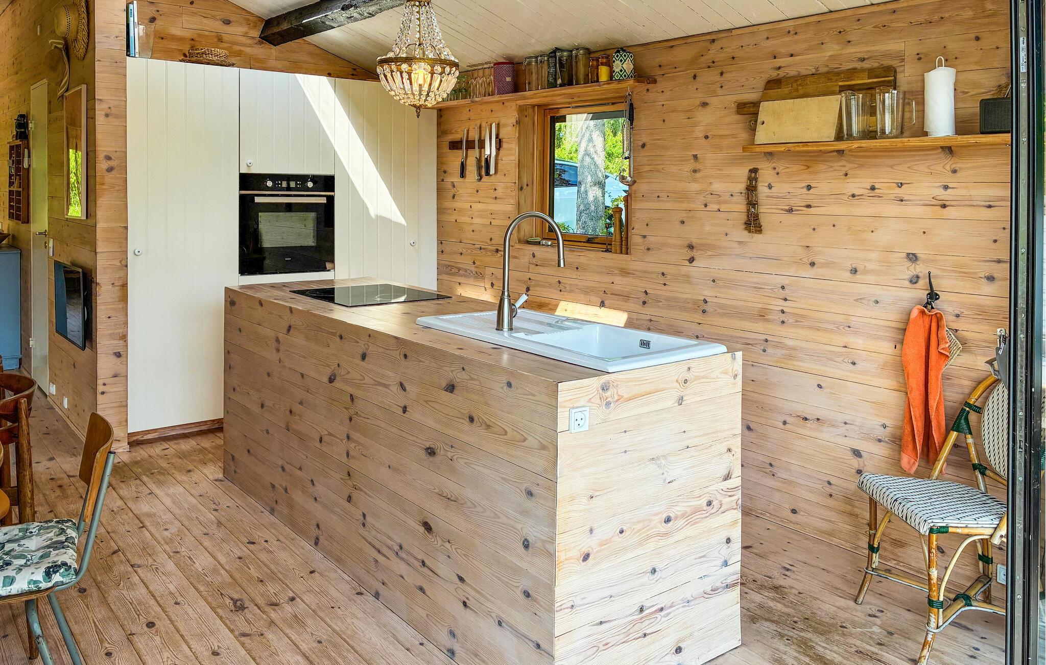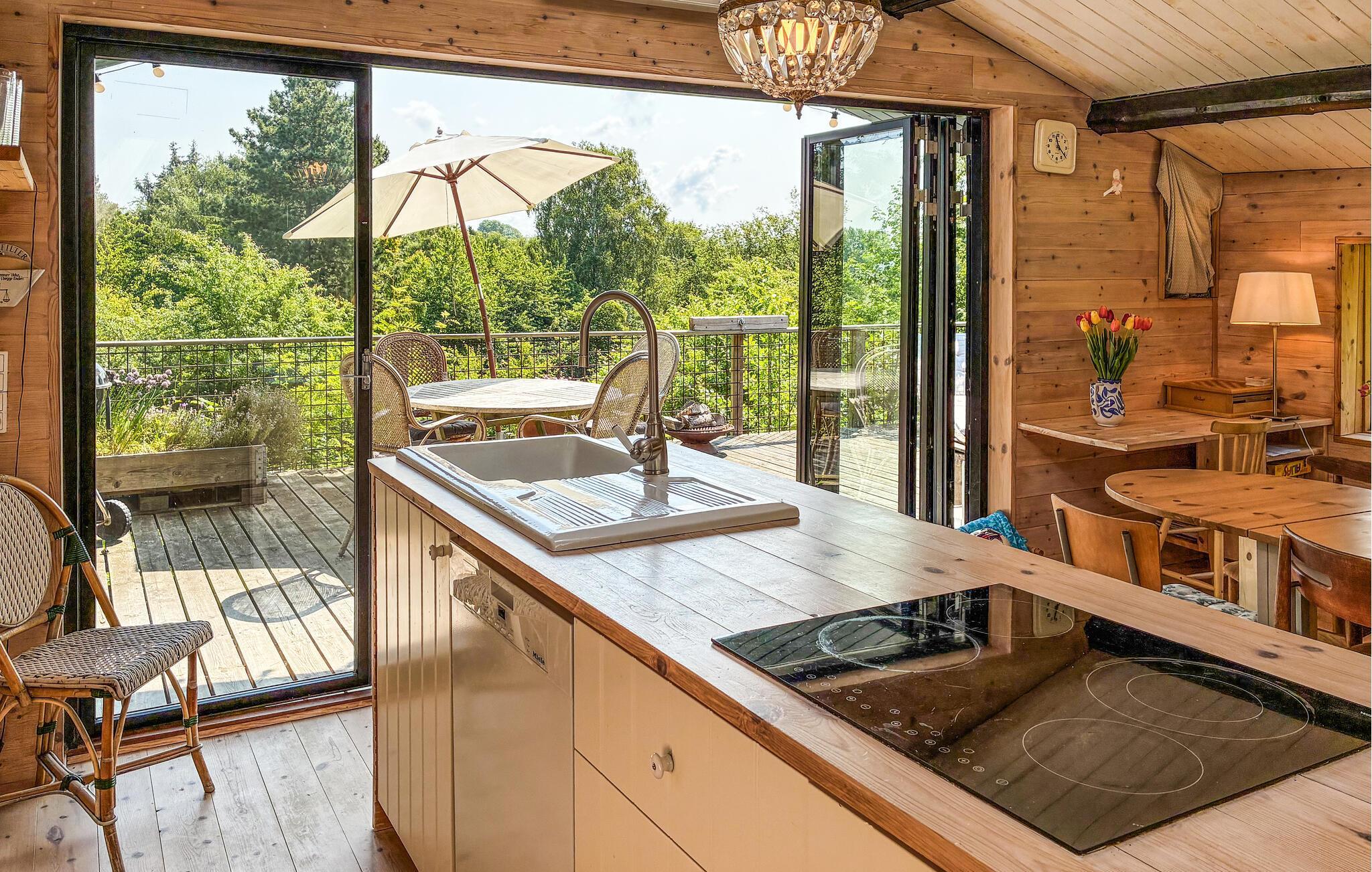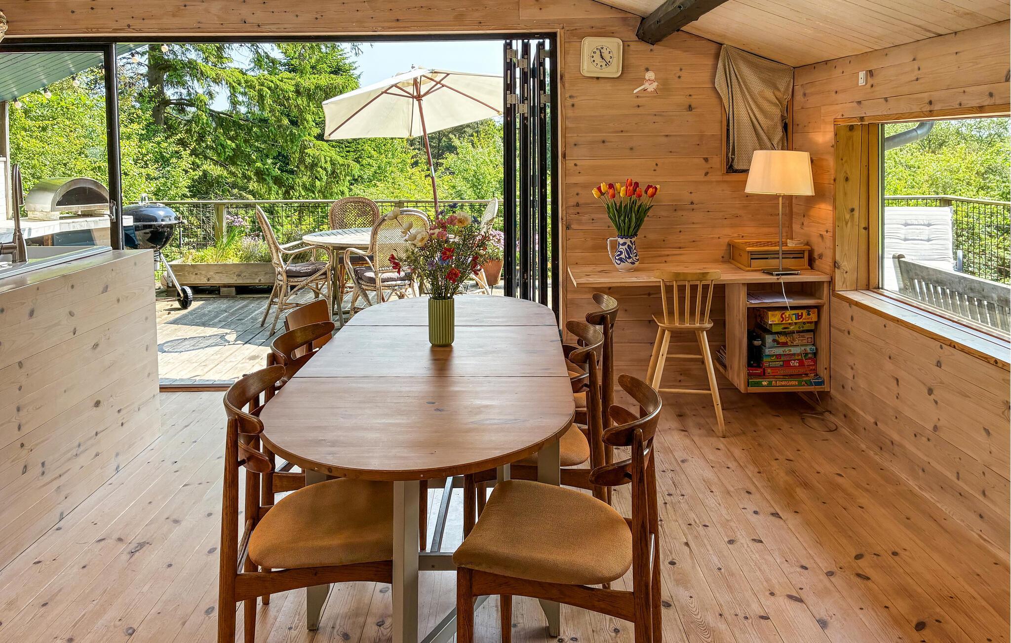 Takket være de varme træelementer og smukke detaljer kommer I straks i feriestemning, så snart I træder ind i dette venlige feriehus. Hyg jer sammen, mens I laver mad i det åbne køkken, nyd jeres måltider med udsigt til det grønne, og slut en lang dag af med en hyggelig spilleaften.