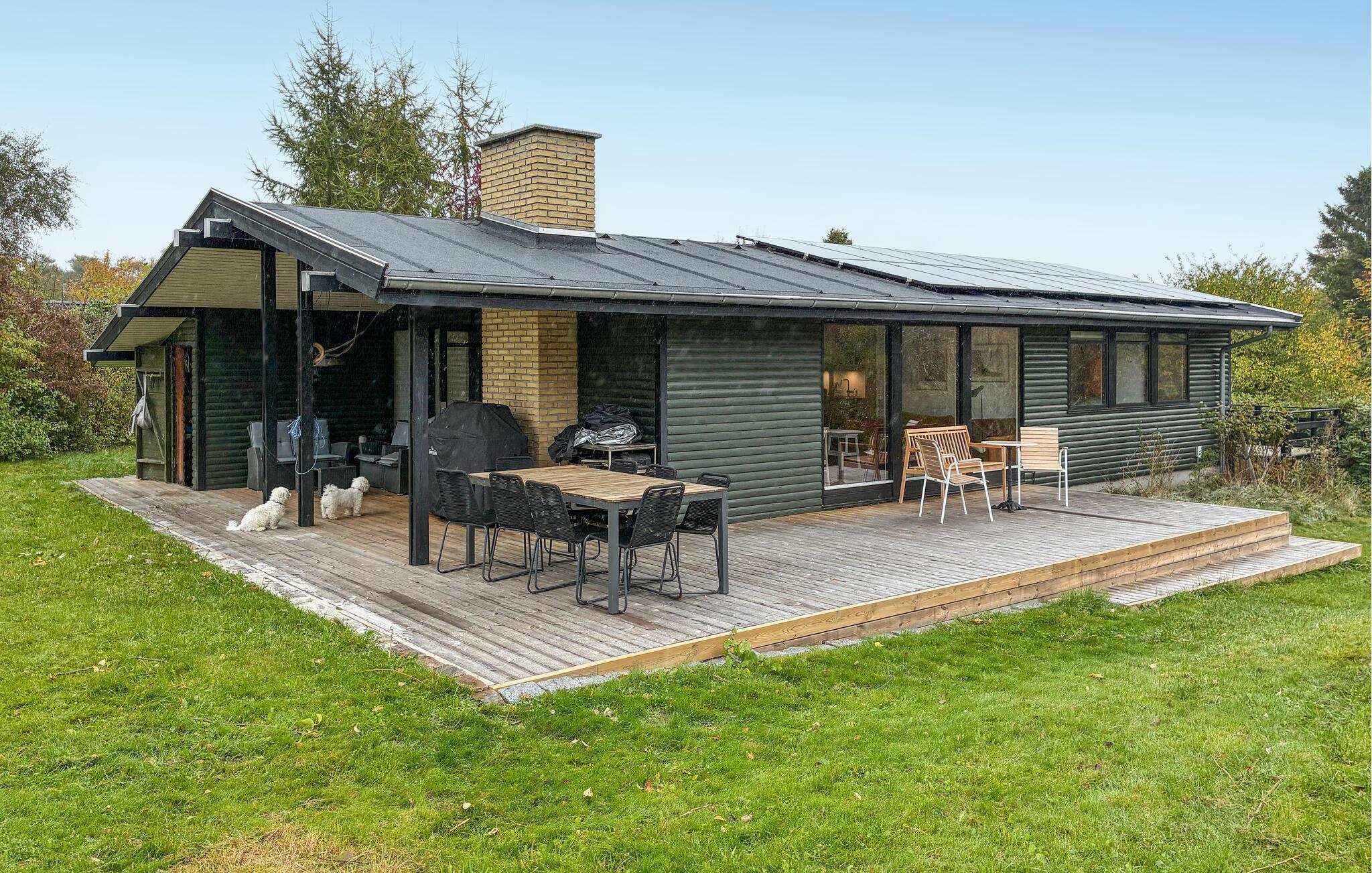 Oplev en rolig ferie i dette hyggelige feriehus, der byder jer velkommen med en varm atmosfære og masser af lys. Nyd det åbne opholds- og spiseområde med store vinduer og udsigt til haven. Hyg jer sammen i sofahjørnet, læs en god bog, eller tilbring aftenerne med hyggesnak og sjove spil. Spisepladsen med sine stilfulde lamper skaber en indbydende stemning, og det moderne køkken med bordplade i træ har alt, hvad I behøver til fælles madlavning. Samspillet mellem lyse farver og naturlige materialer giver rummet en behagelig stemning.