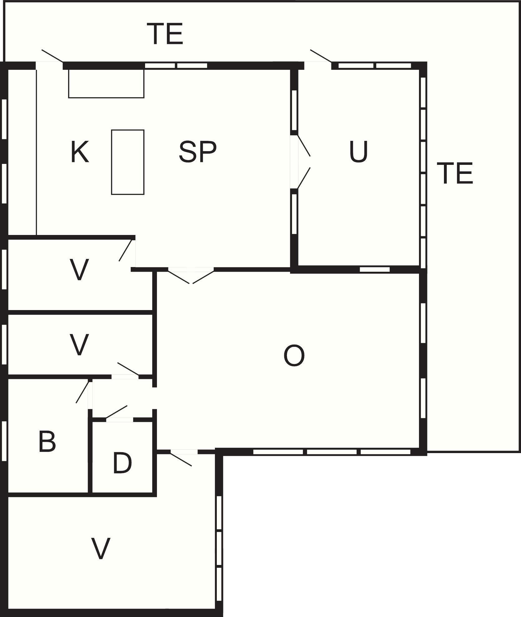 Køkken: El-komfur, ovn, køleskab m/frostboks, mikroovn, emhætte, kaffemaskine, opvaskemask.